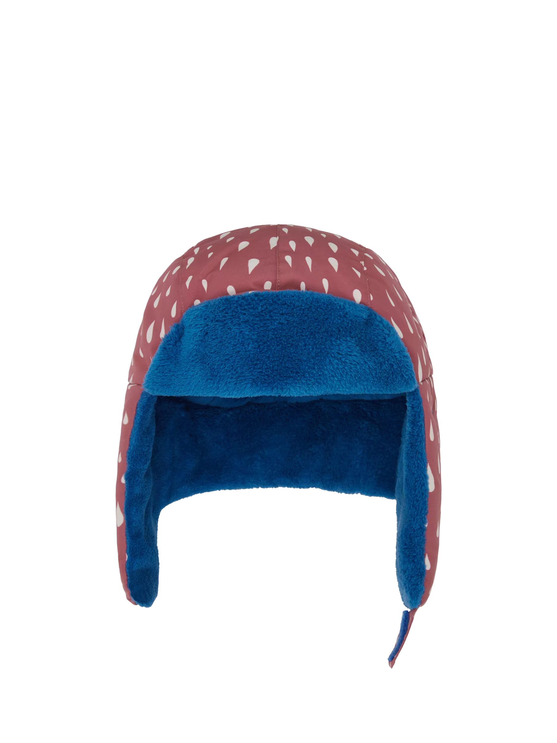 Designed to keep young explorers warm during outdoor winter play, this functional and cosy winter hat features a padded design and a cosy sherpa fleece lining. Ear flaps effectively protect against cold winds while the Velcro fastening ensures a snug and secure fit during winter sports and active outdoor escapades. With a waterproof rating of 10,000mm, the hat is made from durable recycled materials and is built to last. The playful pink raindrop print adds a pop of colour to winter gear.