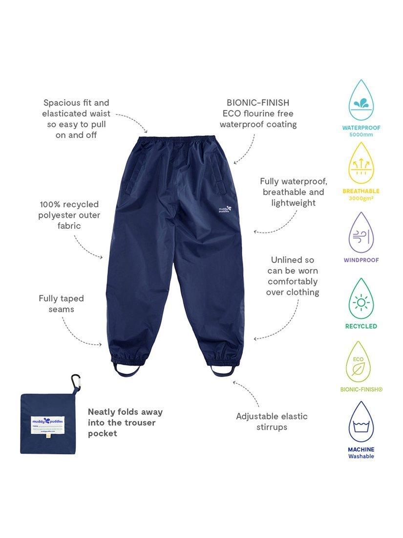 Puddlepac Trousers are a rainy day essential for young adventurers who love spending time outdoors. Keep them comfortable and protected with these ultra durable waterproof trousers in classic navy. Brought to you from outerwear experts Muddy Puddles, these hard-wearing trousers are made from 100% recycled fabrics and have waterproofing capabilities up to 10,000mm, so your child can confidently tackle the deepest puddles with ease. The fabric is also breathable (3,000g/m²) which ensures they stay cool as they run around.