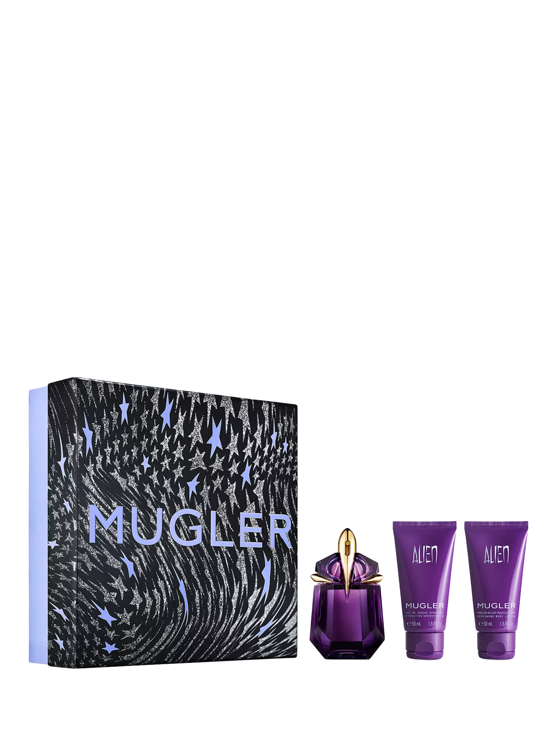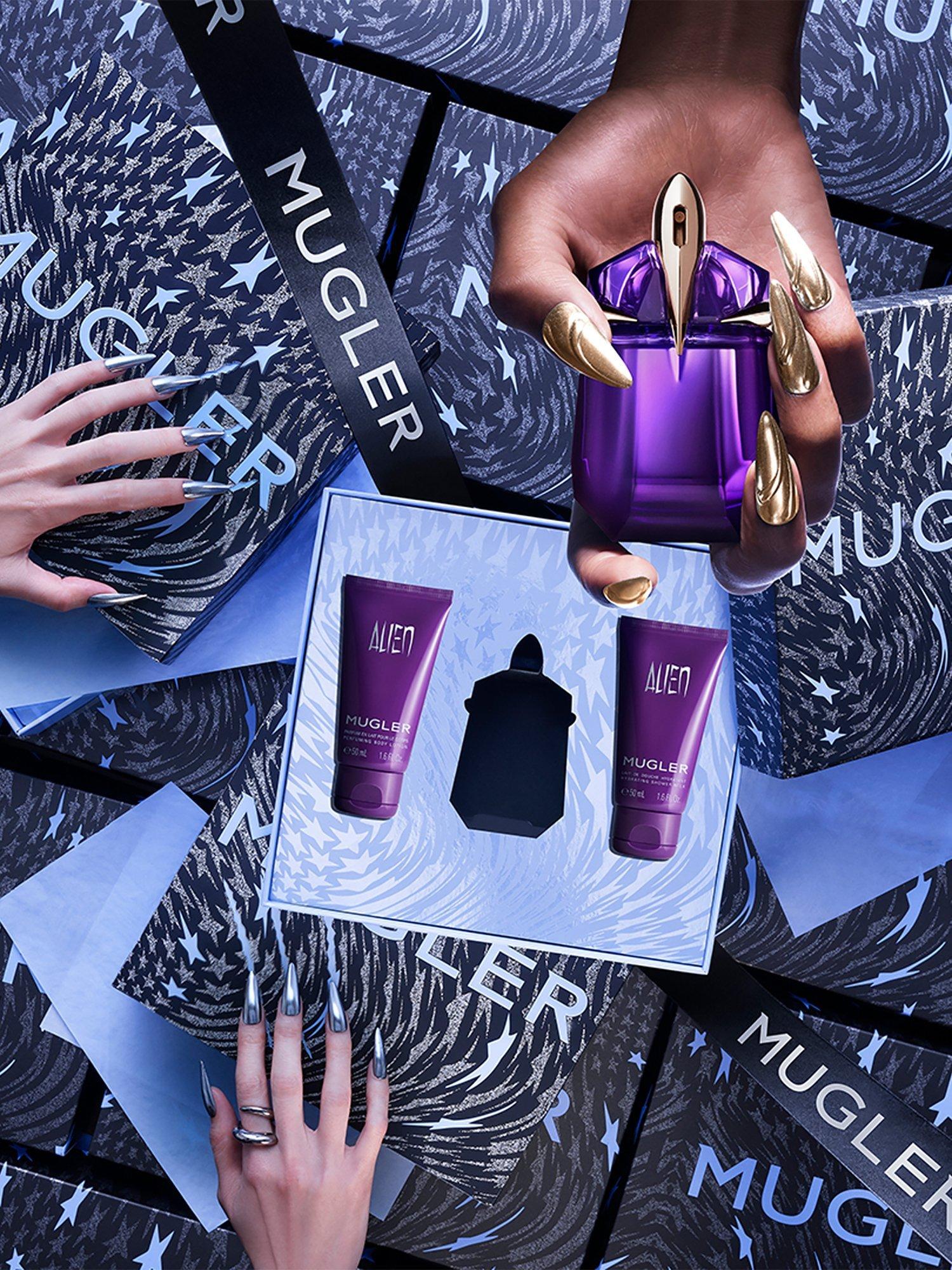 This year, the holidays will be a fierce unwrapping. Under the giant star, Mugler gifts will spread festive sparkles everywhere. Unleash the holiday fever with this holiday gift set containing: Alien Eau de Parfum (30ml), Alien body lotion (50ml) and Alien shower gel (50ml).