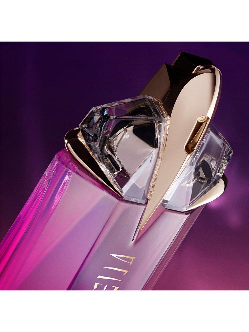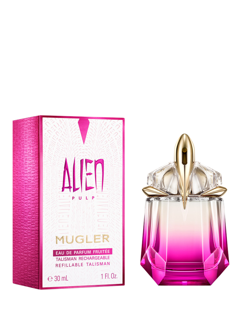 Alien Pulp is a fruity floral fragrance, inspired after the tempting pulpiness of a pink raspberry accord. A supra-sensual and irresistible raspberry accord blends with a creamy jasmine extract and fluffy skin-soft musk. Cashmeran wood and musky accents create a scent that captures the essence of charming femininity. Alien Pulp blends the unexpected for a fruity temptation. Inspired by Mugler's rupturist vision, the luxurious Alien fragrance bottle is a talisman, a sculptural gem. Glowing with a delicious ombré from juicy pink to crystal-clear, the iconic faceted bottle embodies the sheer yumminess of Alien Pulp’s new raspberry signature. Alien Pulp Eau de Parfum is born refillable. Recharge all formats with the 100ml refill bottle.
