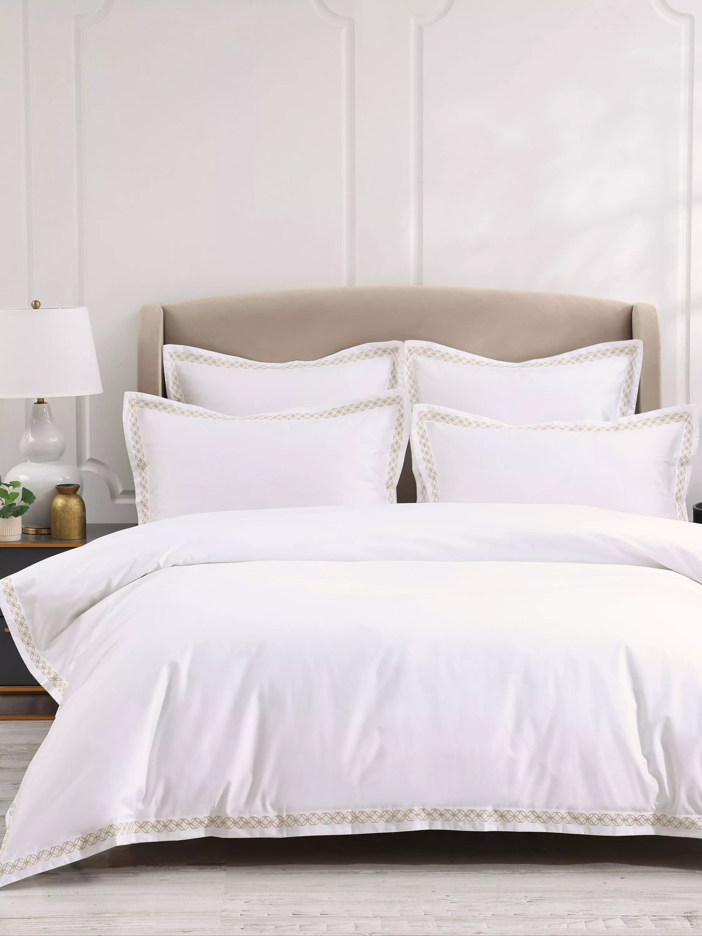 Cavendish is made from 300 thread count cotton sateen and embroidered with a stylish tile pattern, inspired by Marrakech. It's finished with an Oxford border.