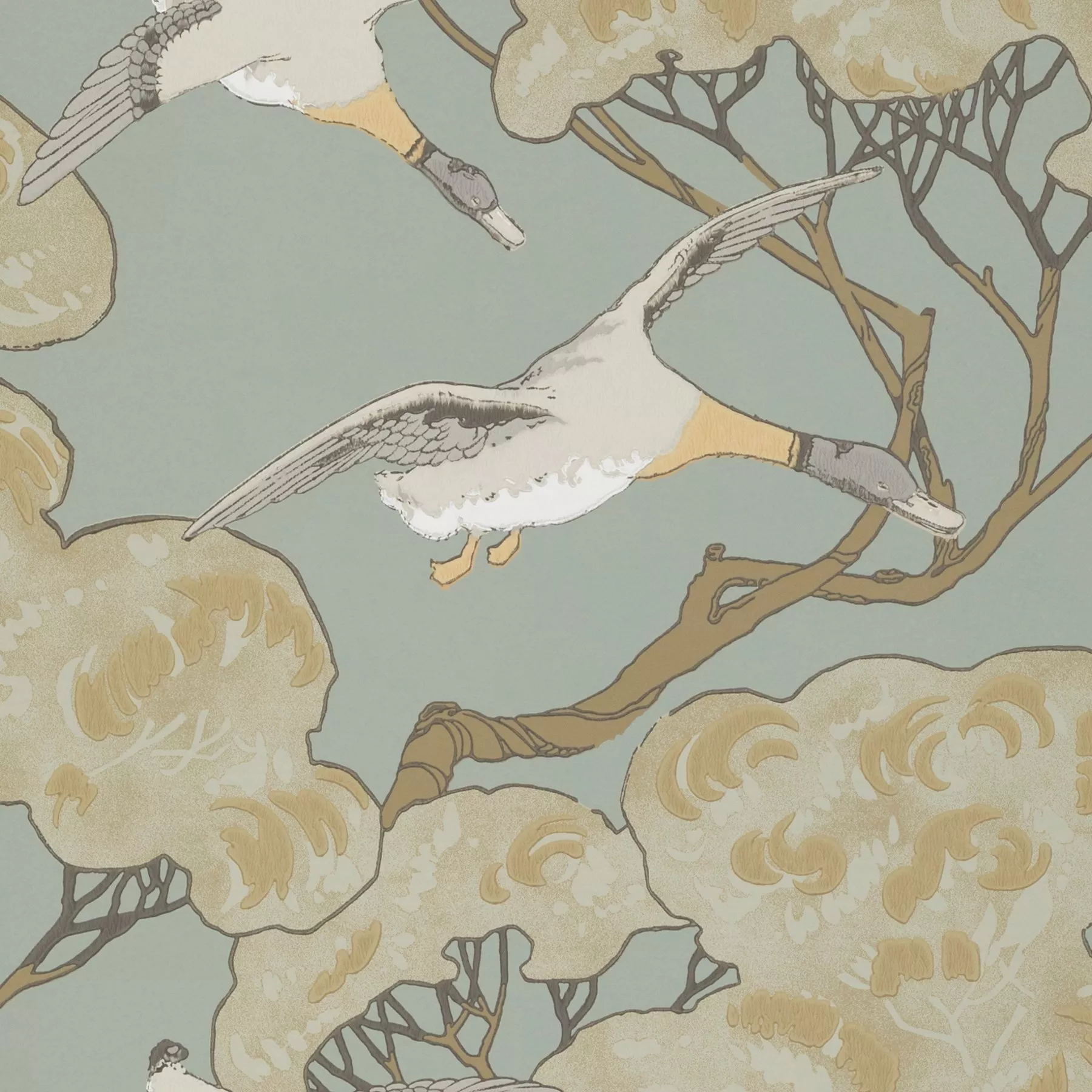 This iconic image shows a pair of mallard ducks in majestic flight against stylized silhouetted, trees and distant, misty pagodas.