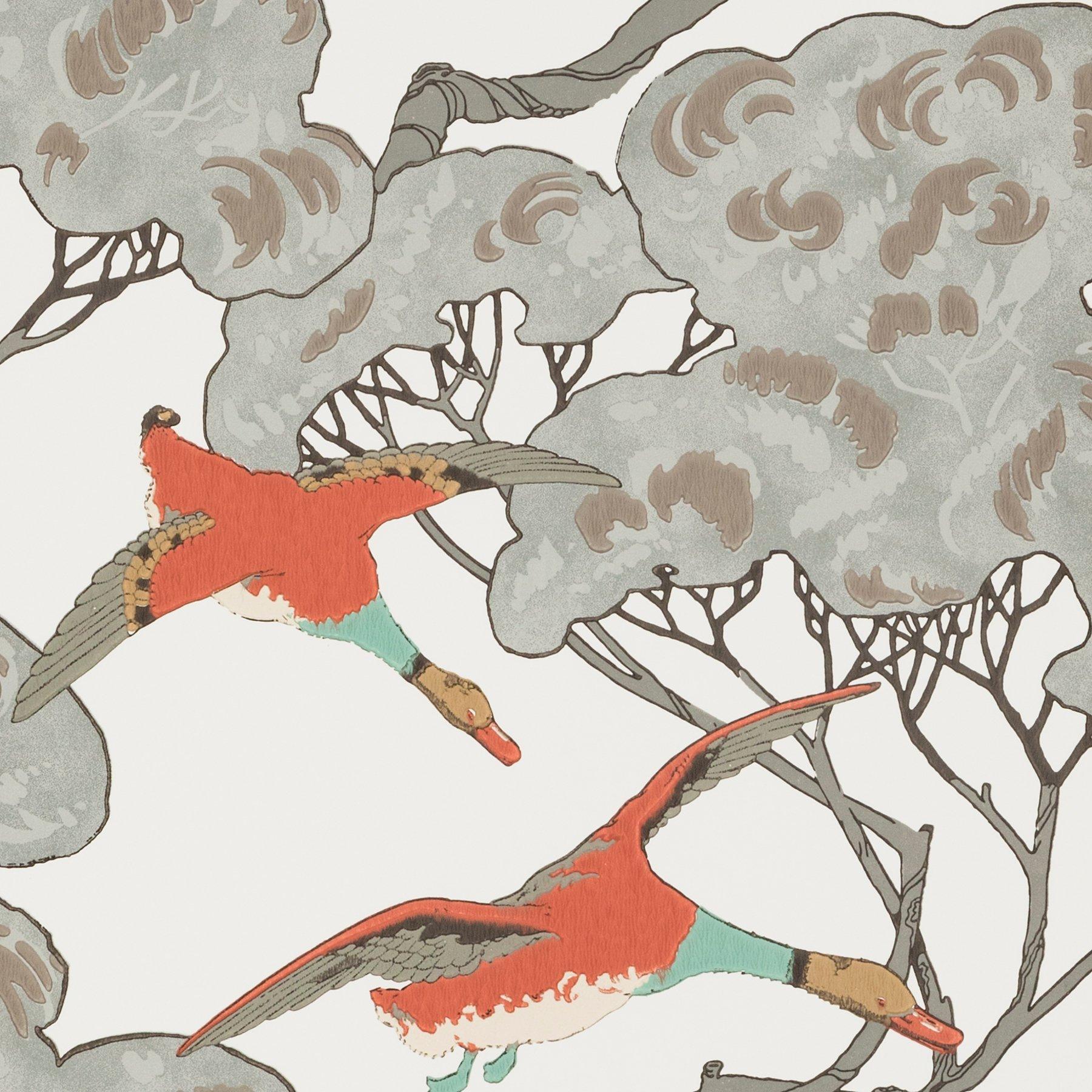 This iconic image shows a pair of mallard ducks in majestic flight against stylized silhouetted, trees and distant, misty pagodas.
