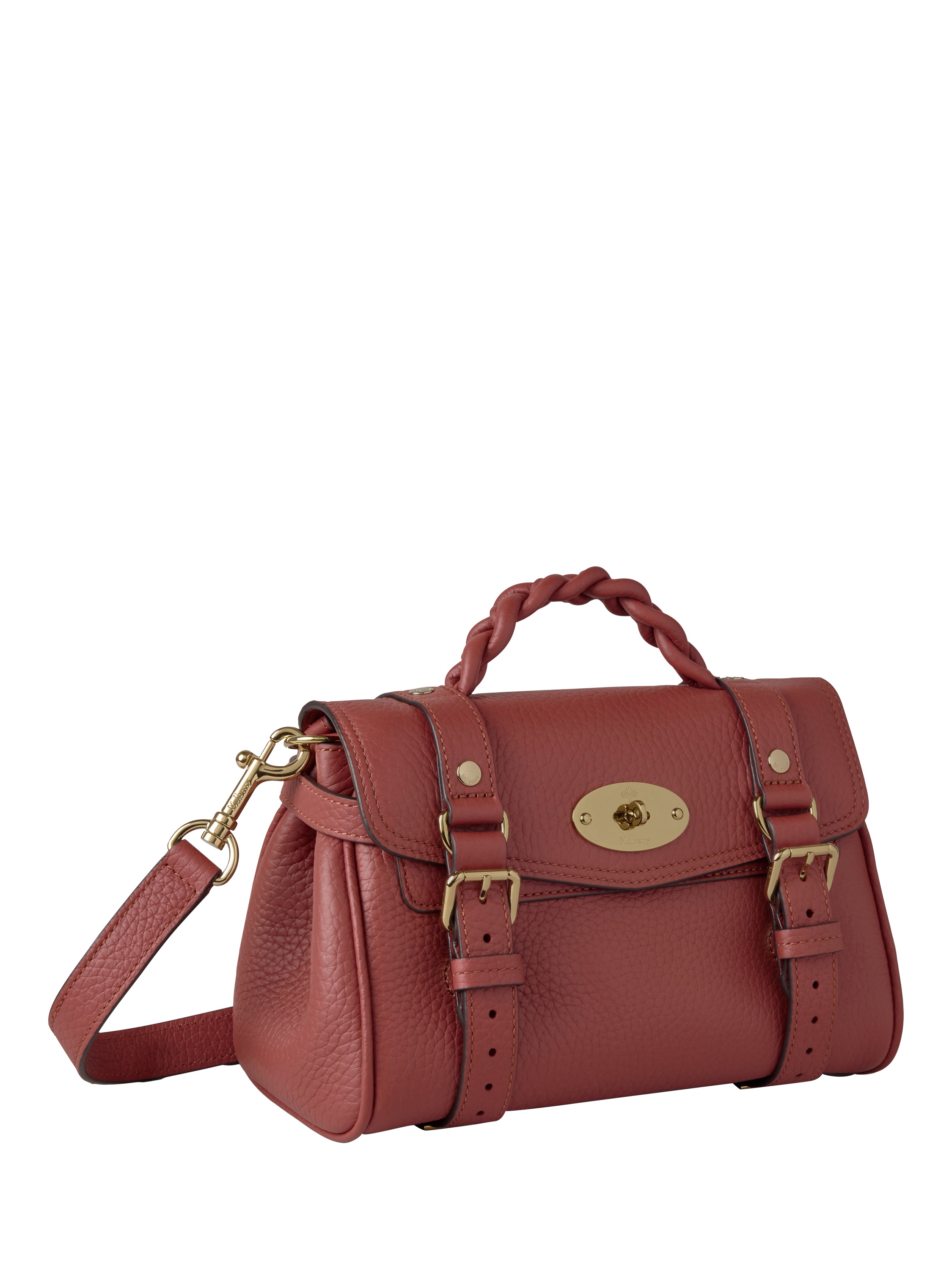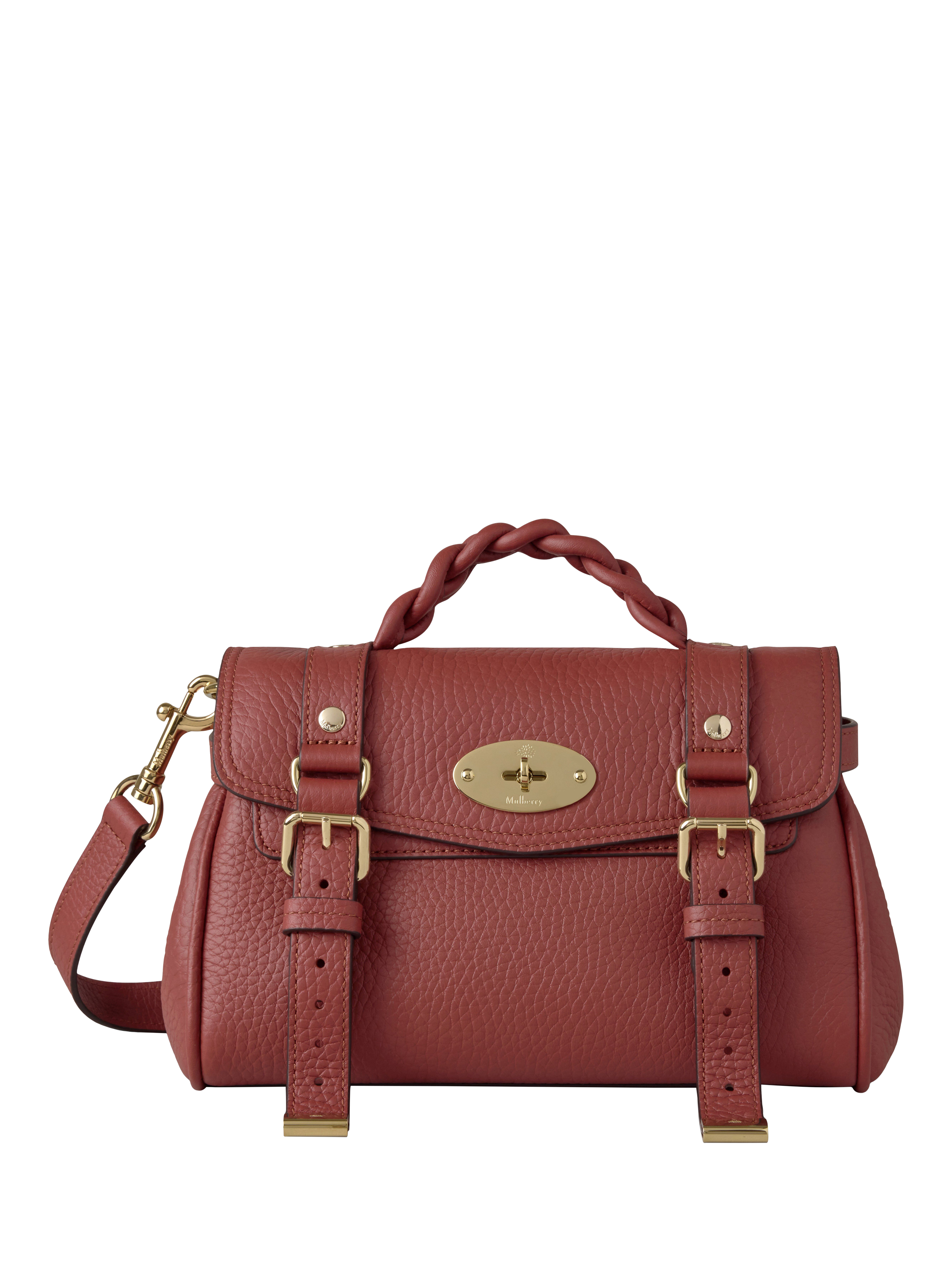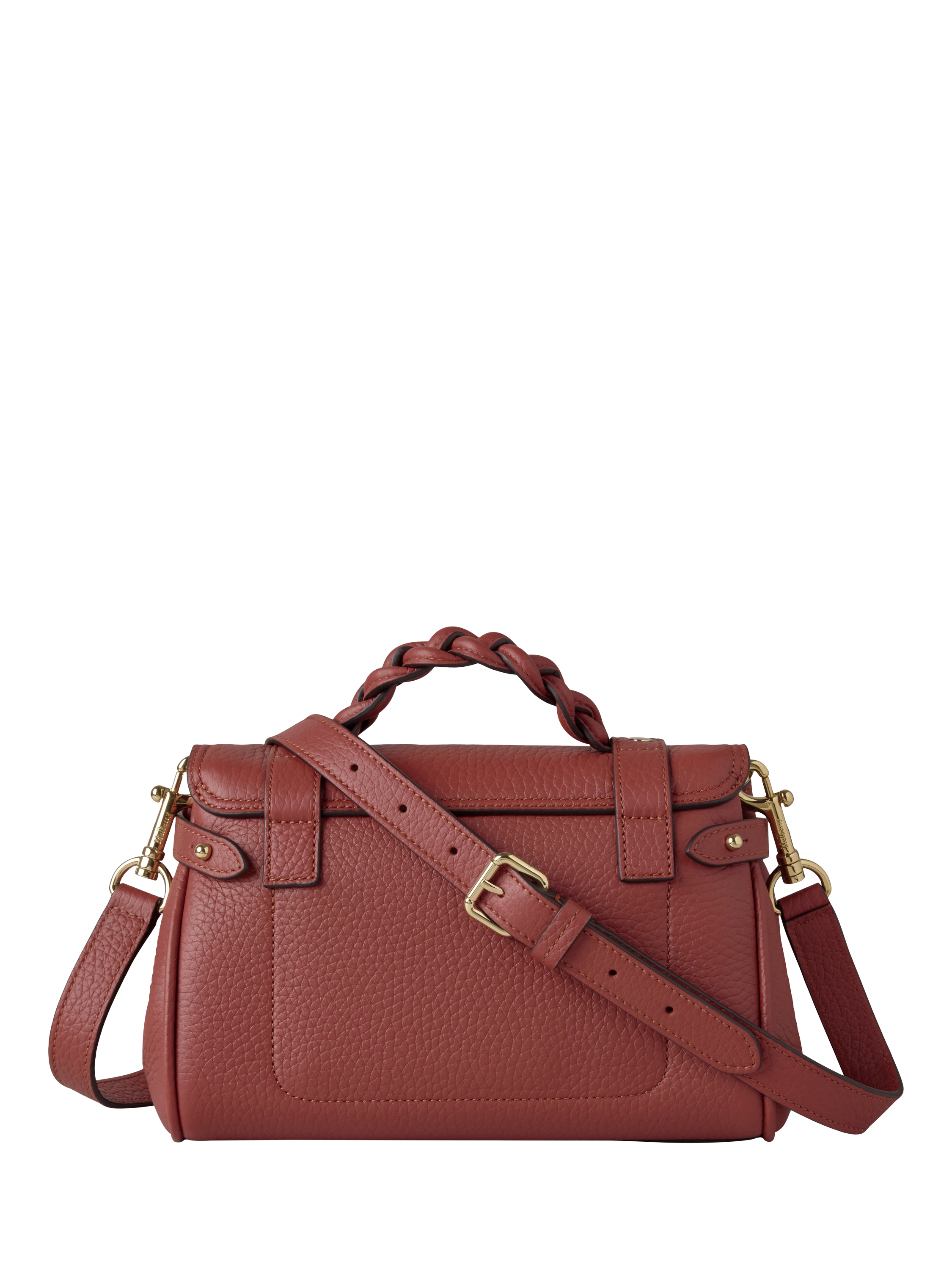The Mini Alexa effortlessly combines elements from two iconic Mulberry styles: the Bayswater bag and the Elkington briefcase. The result is a miniature version of an understatedly cool satchel complete with the signature Mulberry Postman’s Lock and belt buckle and strap hardware. Carry by the plaited leather top handle or wear with the adjustable cross body strap.