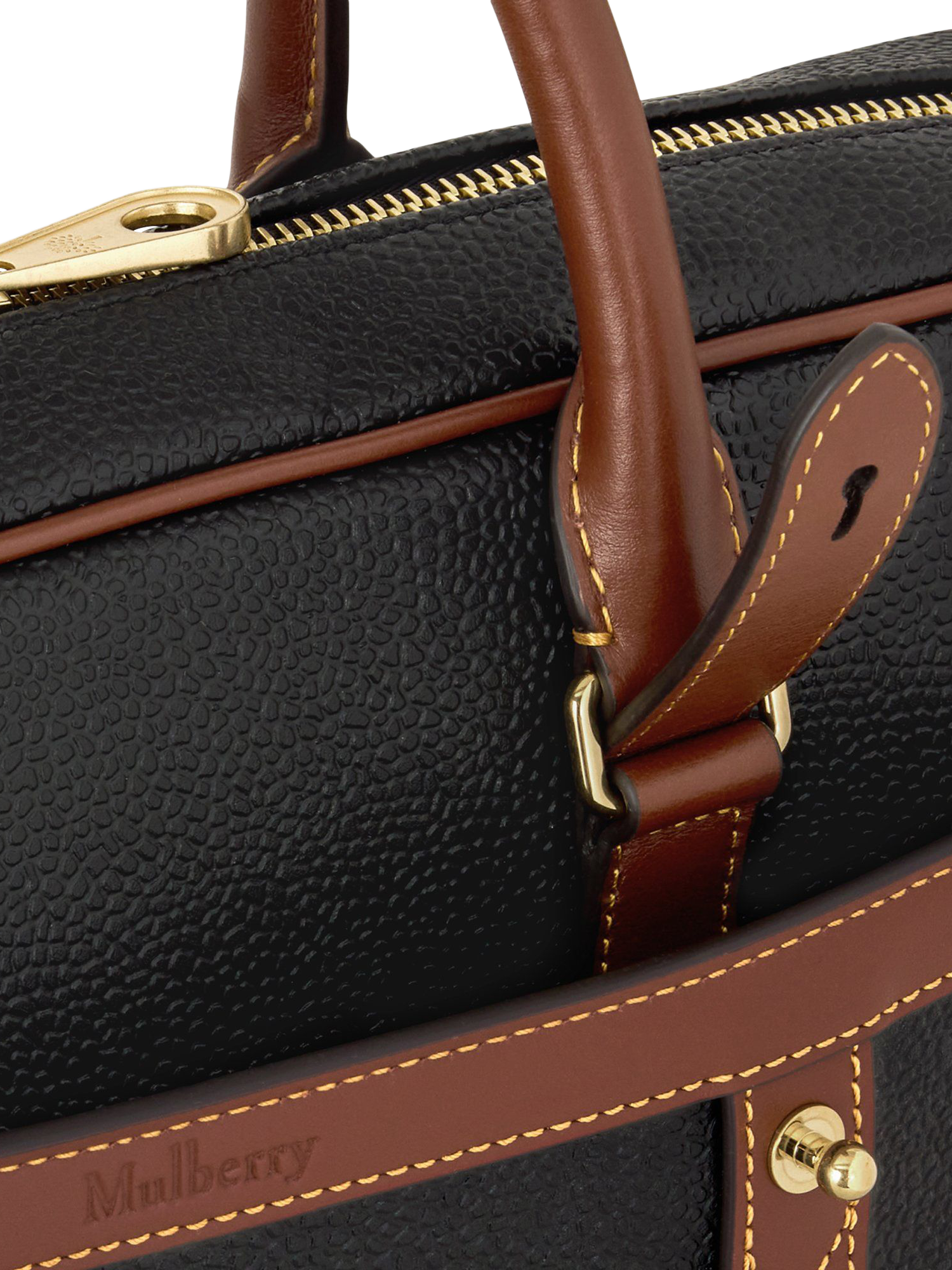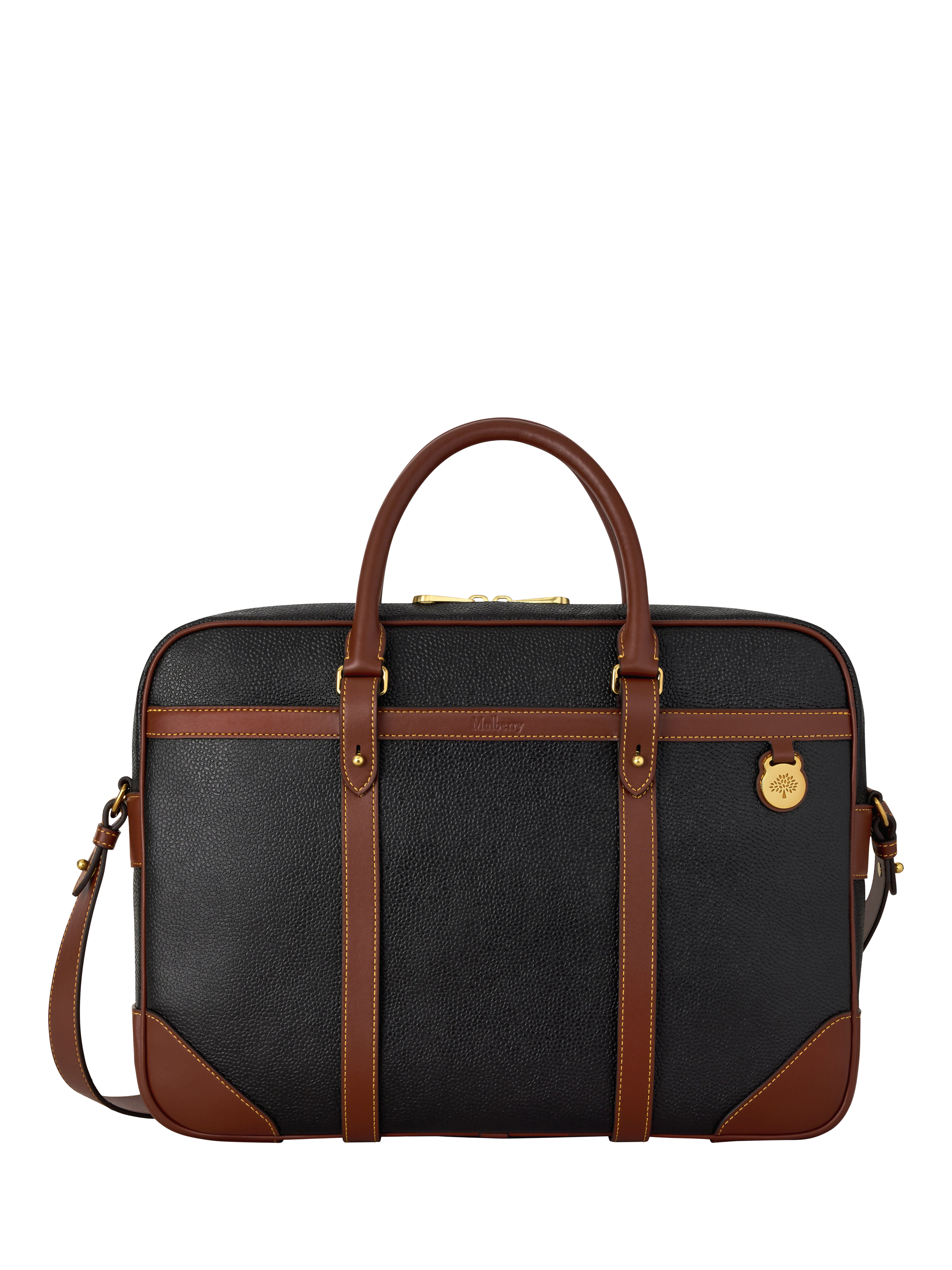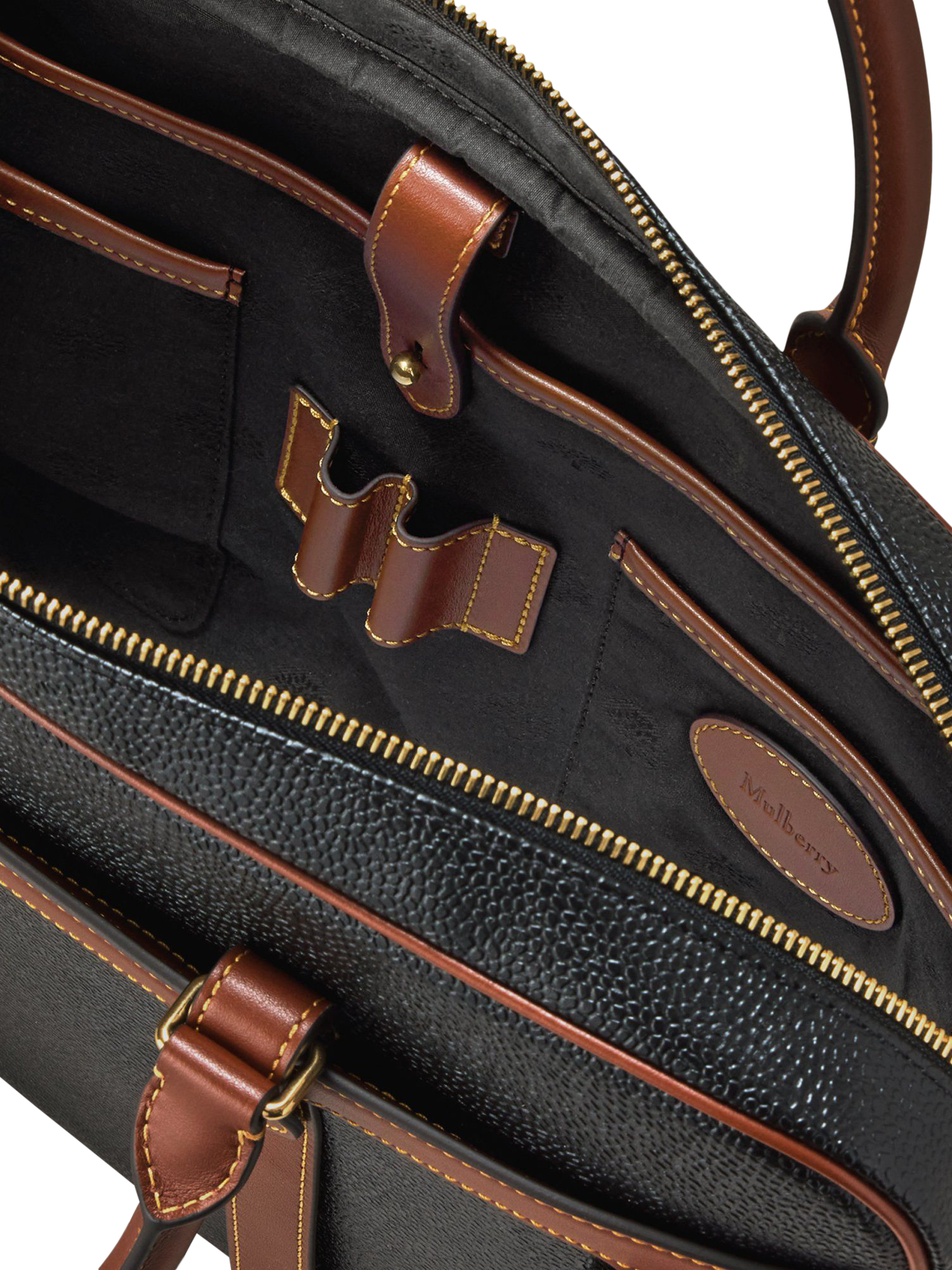 This sleek Heritage Briefcase is composed of Mulberry Scotchgrain material and features a large laptop pocket with Poursin stud closure, an external front pocket for documents and two phone-sized slip pockets.