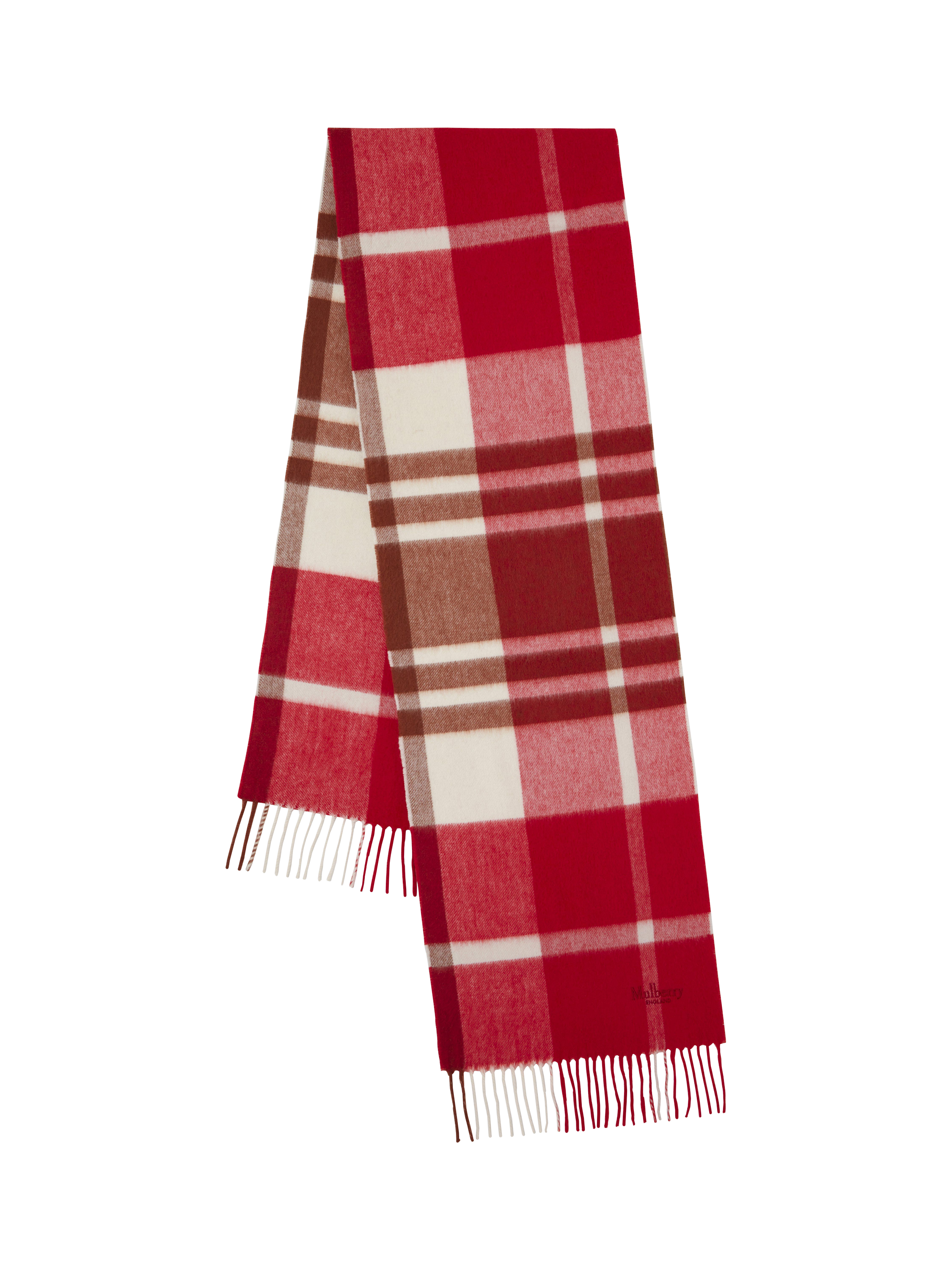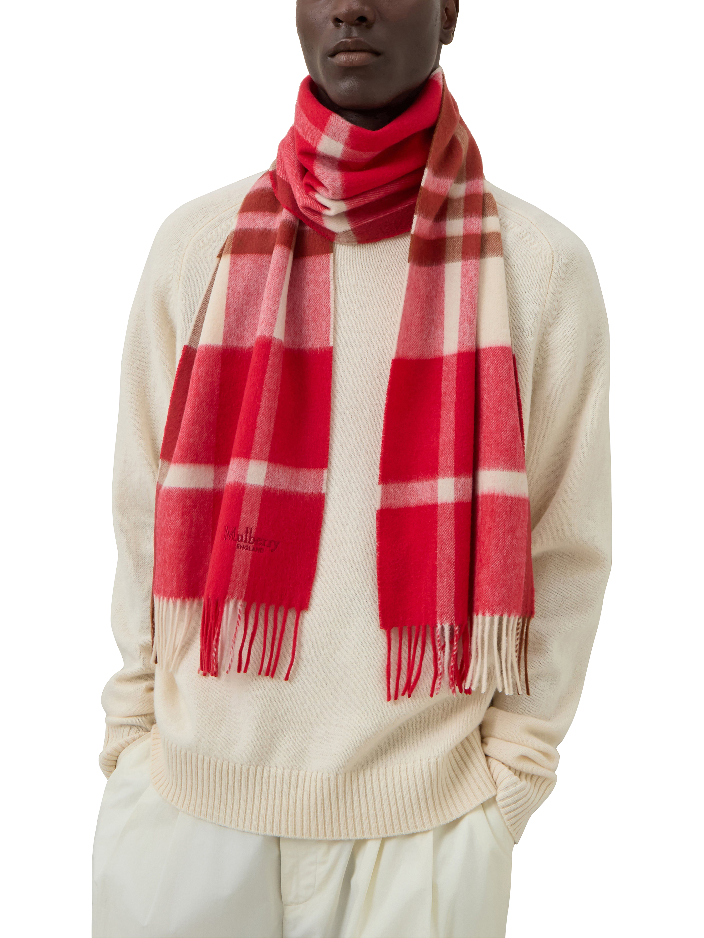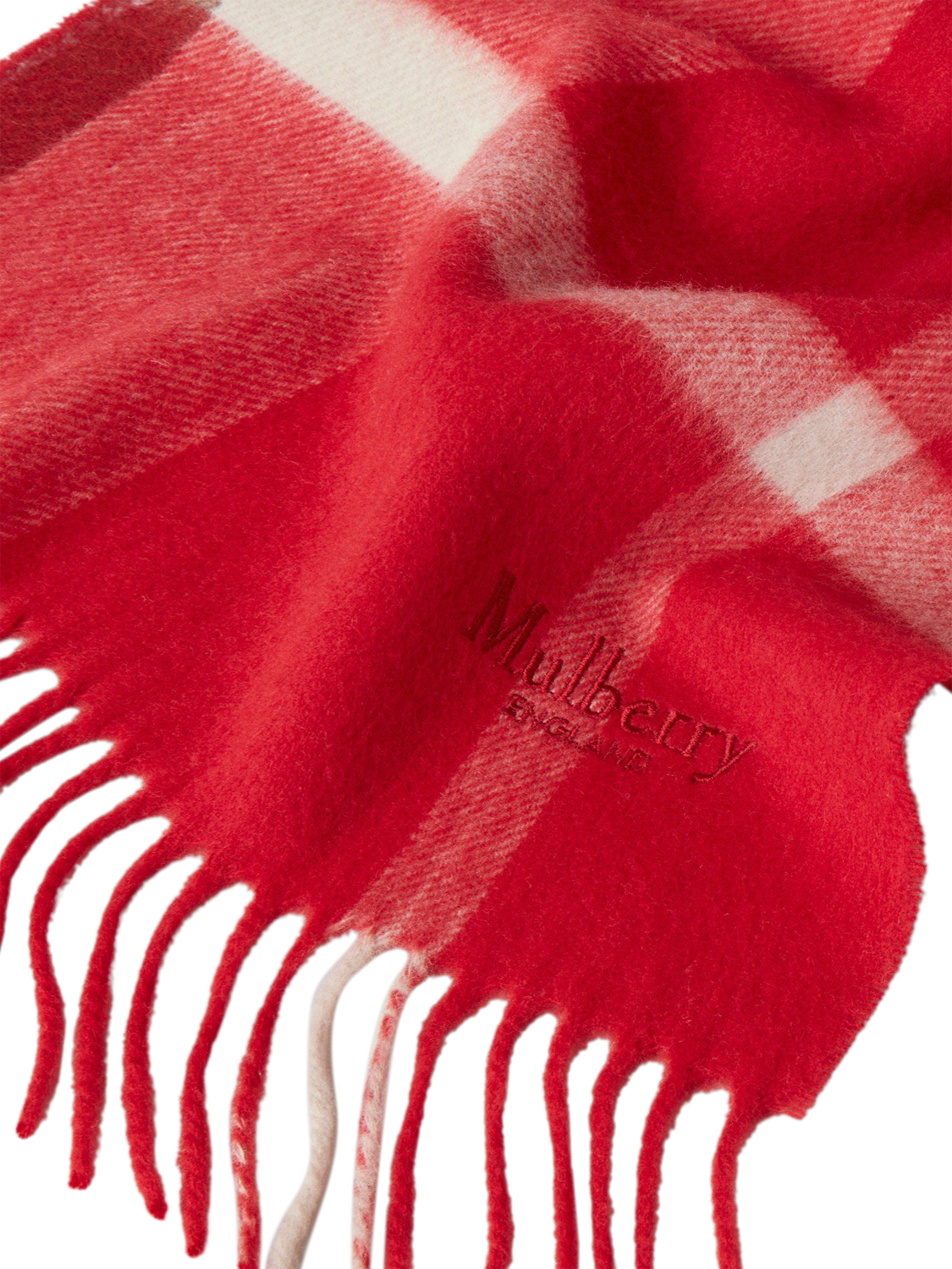 A classic woven checked scarf made in the UK from 100% Merino Wool, finished with fringing and an embroidered Mulberry signature.