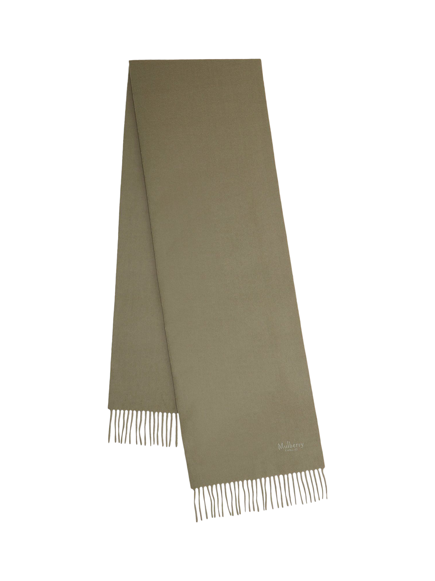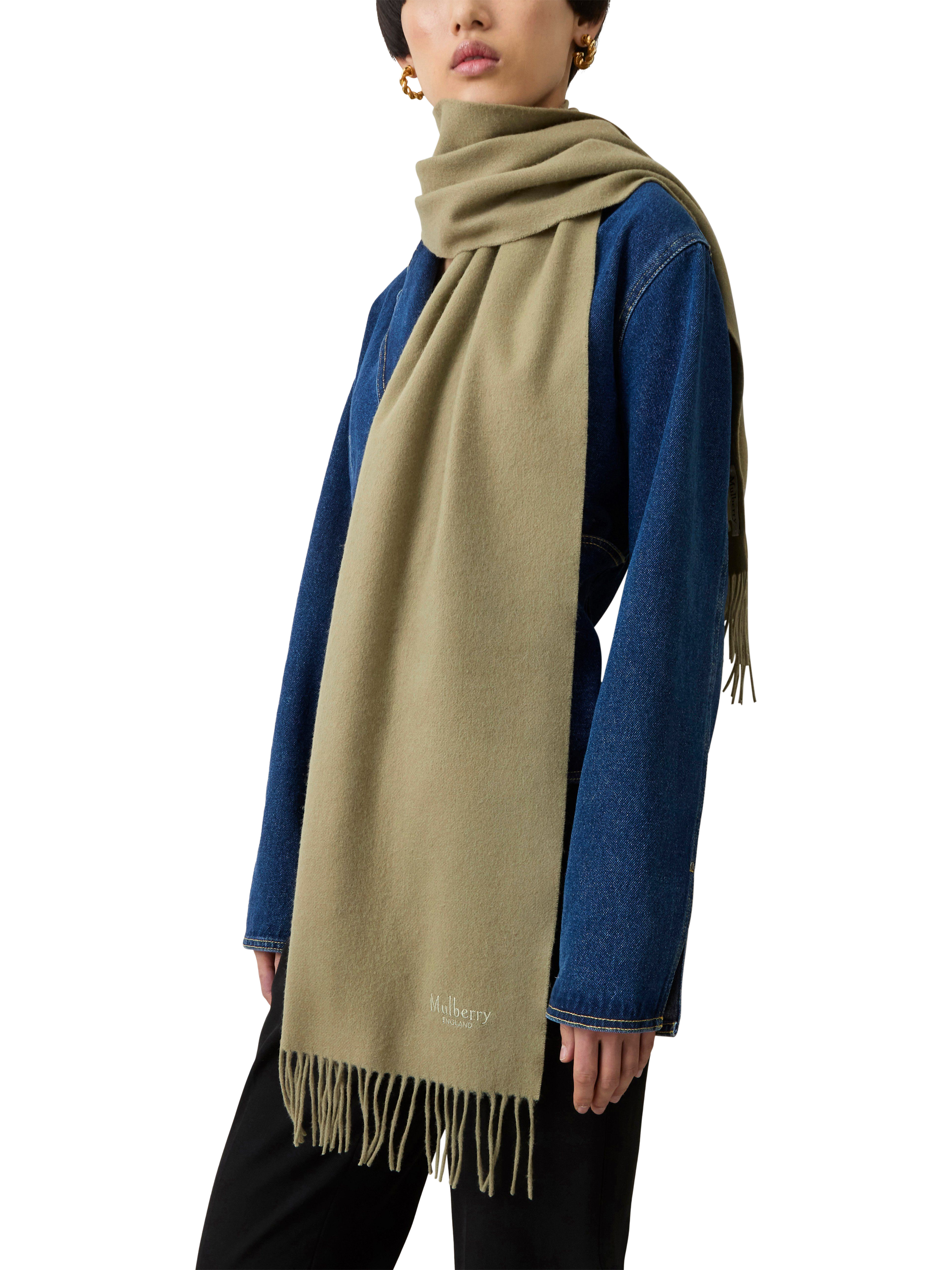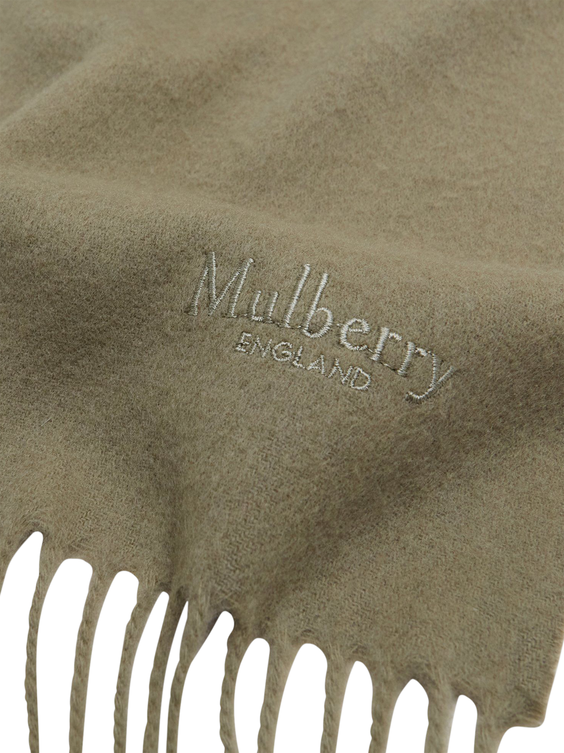 A classic soft wool scarf made in the UK from 100% Lambswool, finished with fringing and an embroidered Mulberry signature.