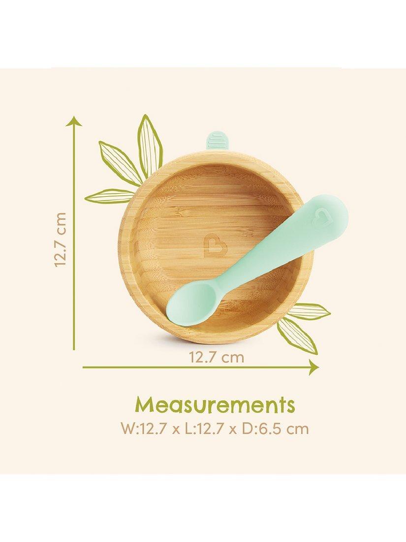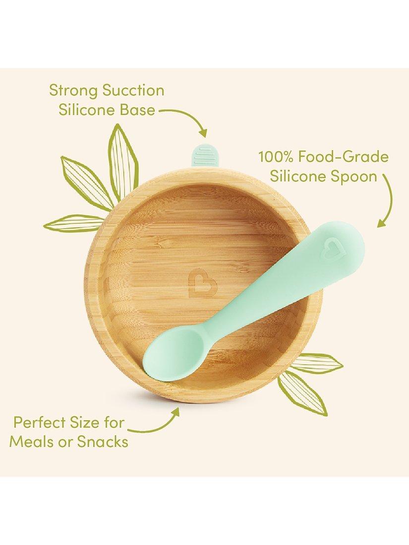 The Bambou Suction Bowl & Spoon Set is part of Munchkin's new bamboo dinnerware collection, designed to cultivate a greener future for our children and the beautiful planet we share. Consciously crafted of non-toxic, renewable bamboo, the bowl is sized just right for baby food and has a strong suction base to prevent spills. The matching silicone spoon is gentle on baby's sensitive gums and cleverly crafted to be one piece so you don't need to worry about any choking hazards making it the perfect mealtime companion. Bamboo is cool to touch so you won't have to worry about sensitive hands.