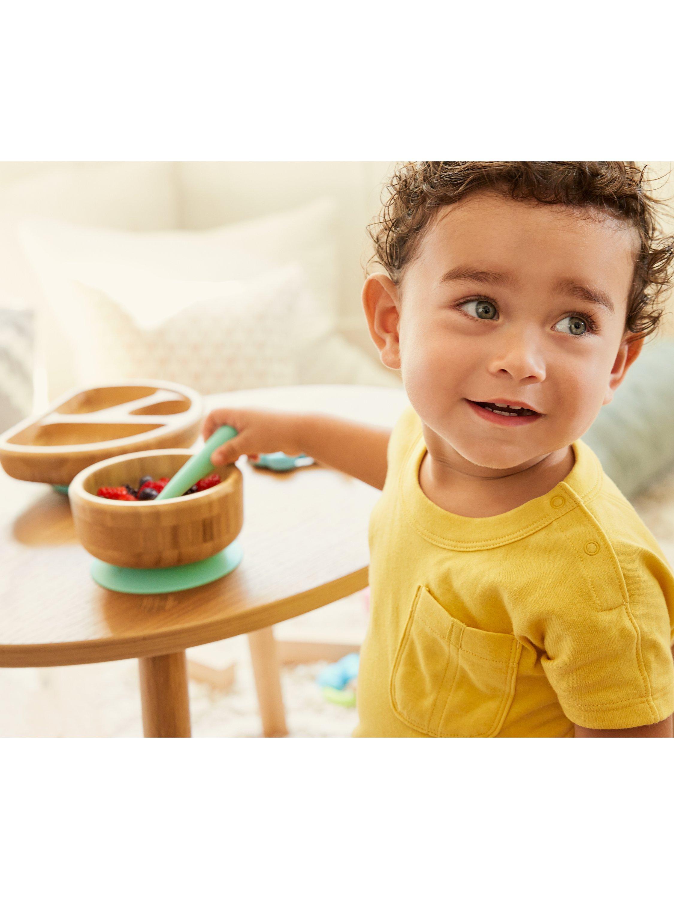 The strong suction base on the toddler bowl helps avoid messes and is perfect for toddler and baby-led weaning. Quick-release tabs on the suction base allow for easy parent removal. The bowl is made from 100% bamboo and the 100% food grade silicone base is removable from the suction bowl for easy cleaning.