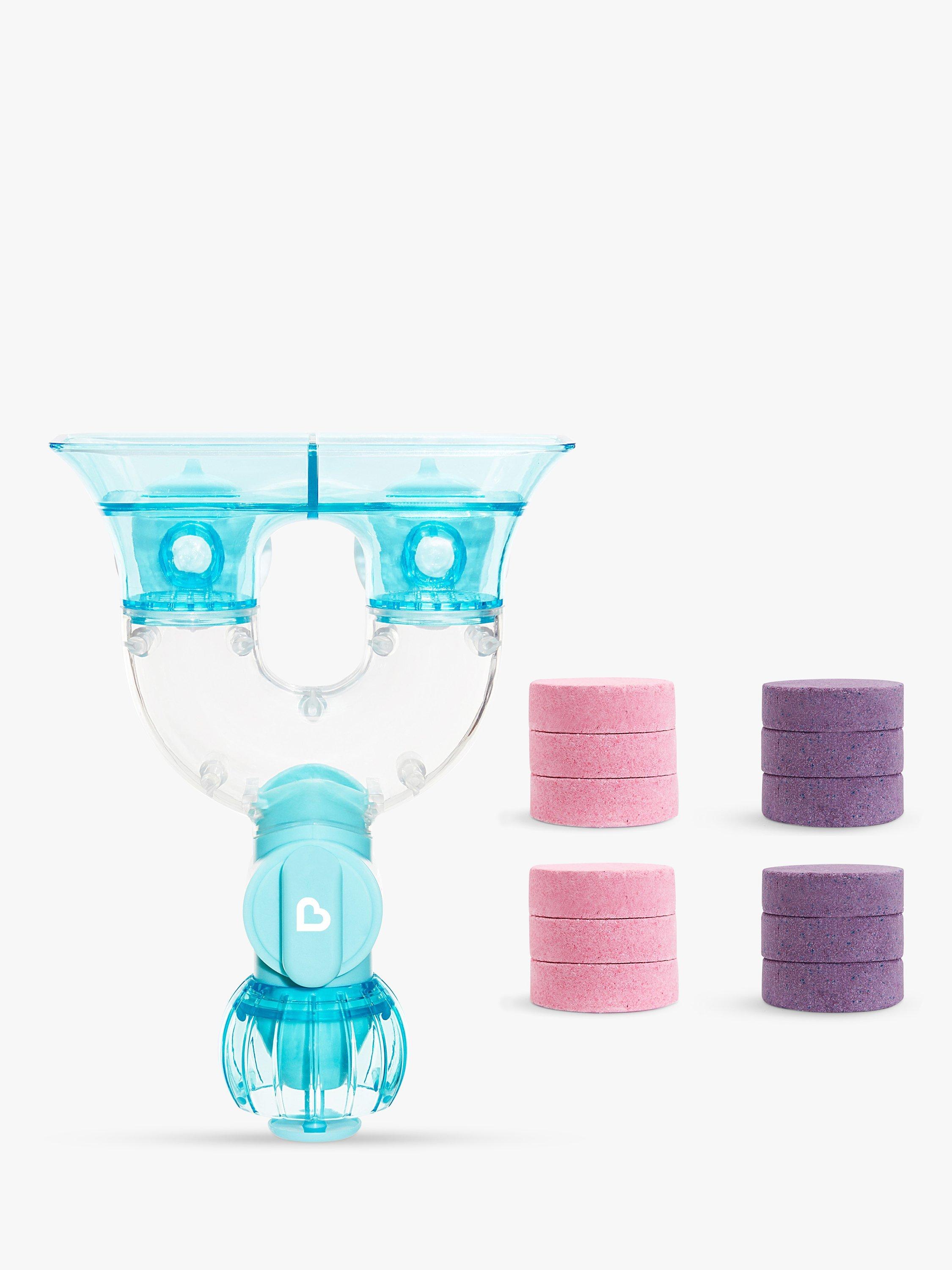 First, suction the toy to your tub wall and drop one coloured bath tablet into each slot. Add water to activate and mix, then twist the knob for a colourful, sprinkling cascade! Nothing compares to a child’s sense of wonder when discovering something new. Just add water and colour your mini chemist’s world with mess-free, stress-free learning fun- a brilliant addition to the bath routine!