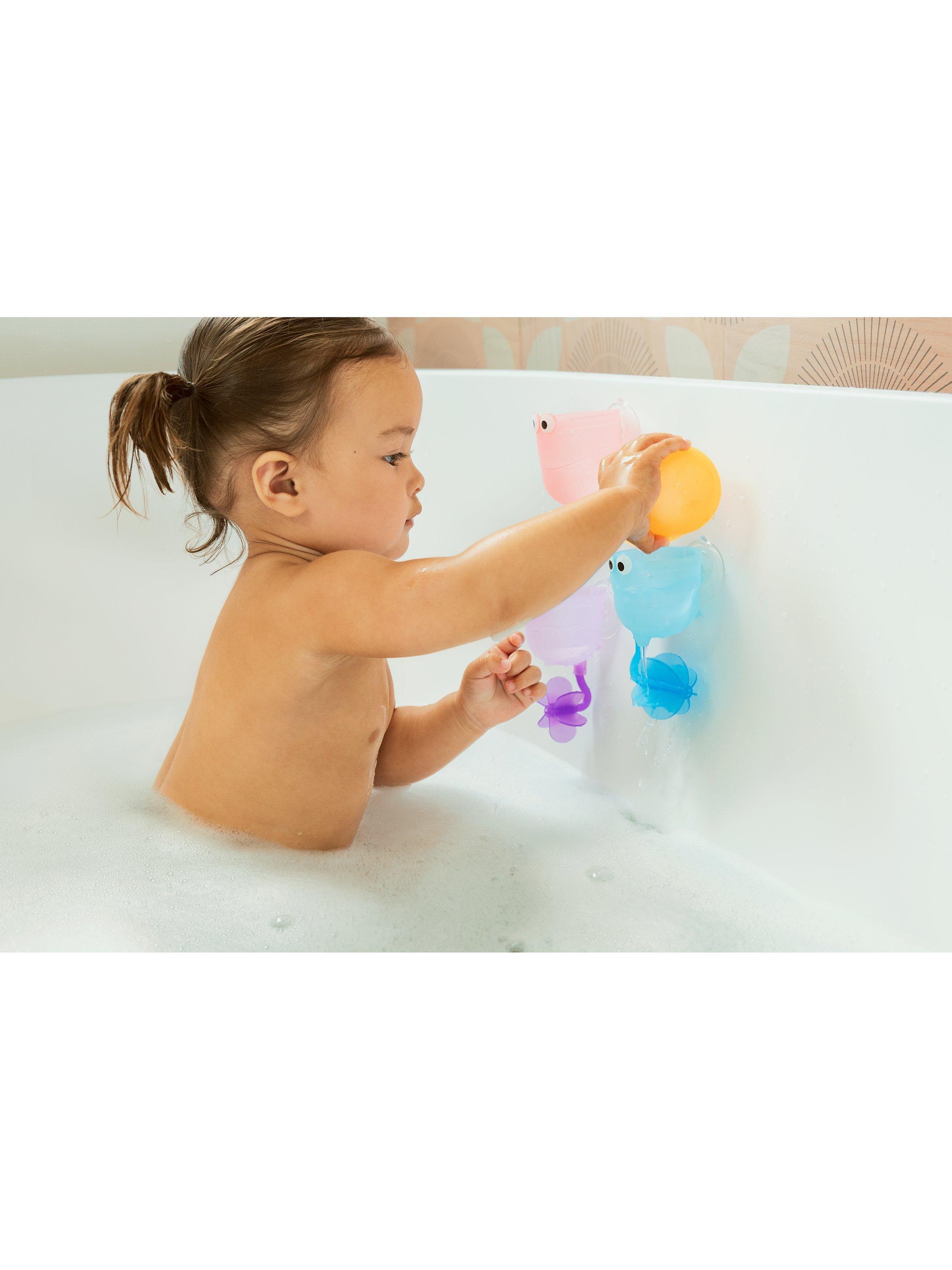 - Three distinct toys adhere to the bath tub wall using suction cups