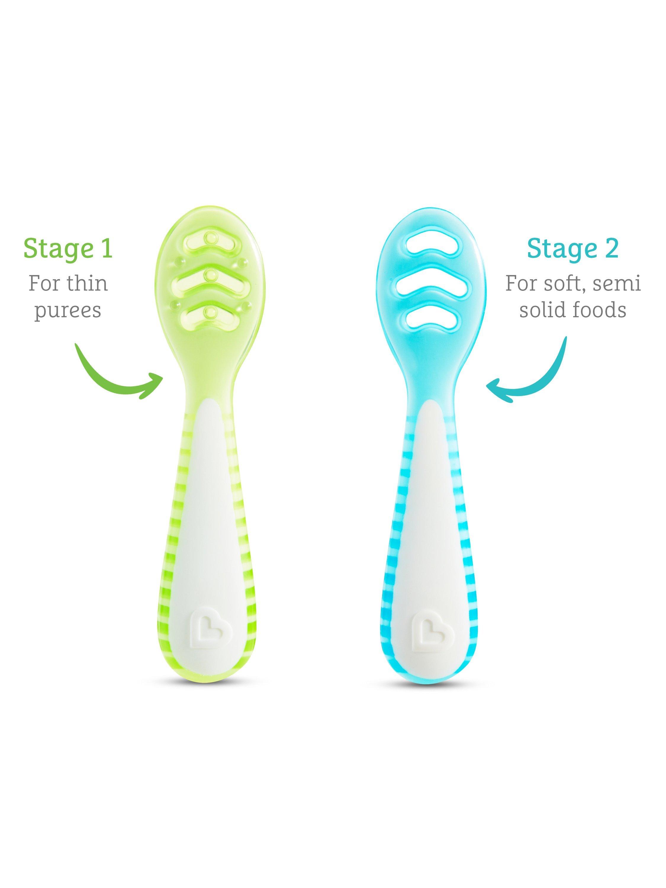 Stages of weaning: Start with Stage 1 for thin purees, ideal for promoting oral awareness. Progress to Stage 2, perfect for softer, semi-solid foods. The spoons' unique channels help food stick, aiding your baby's self-feeding journey.