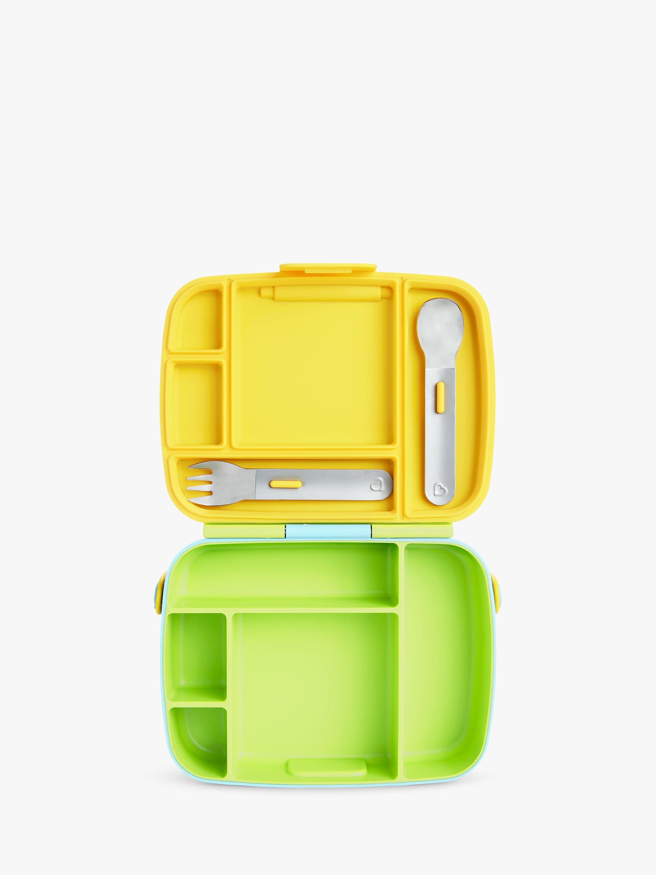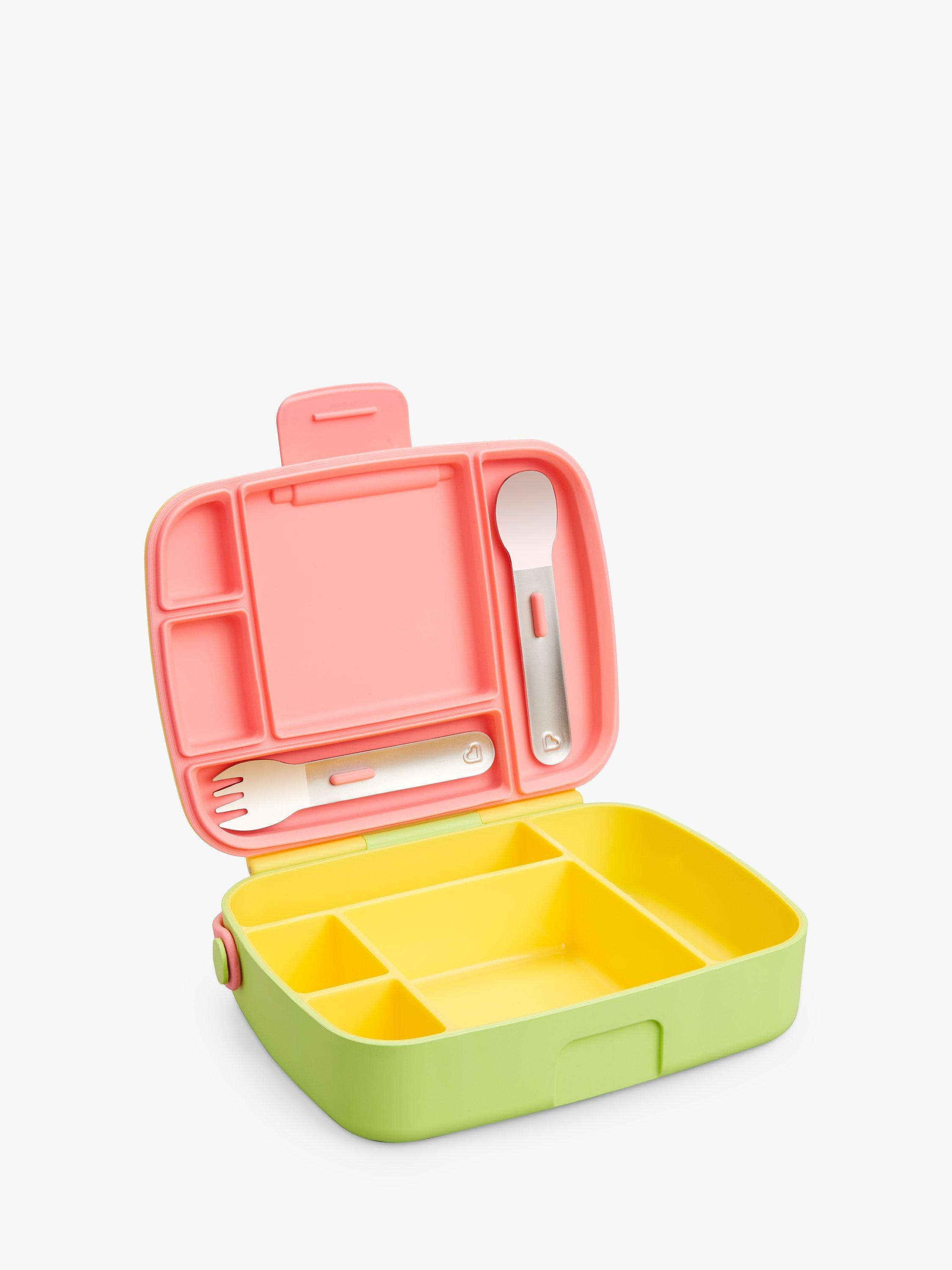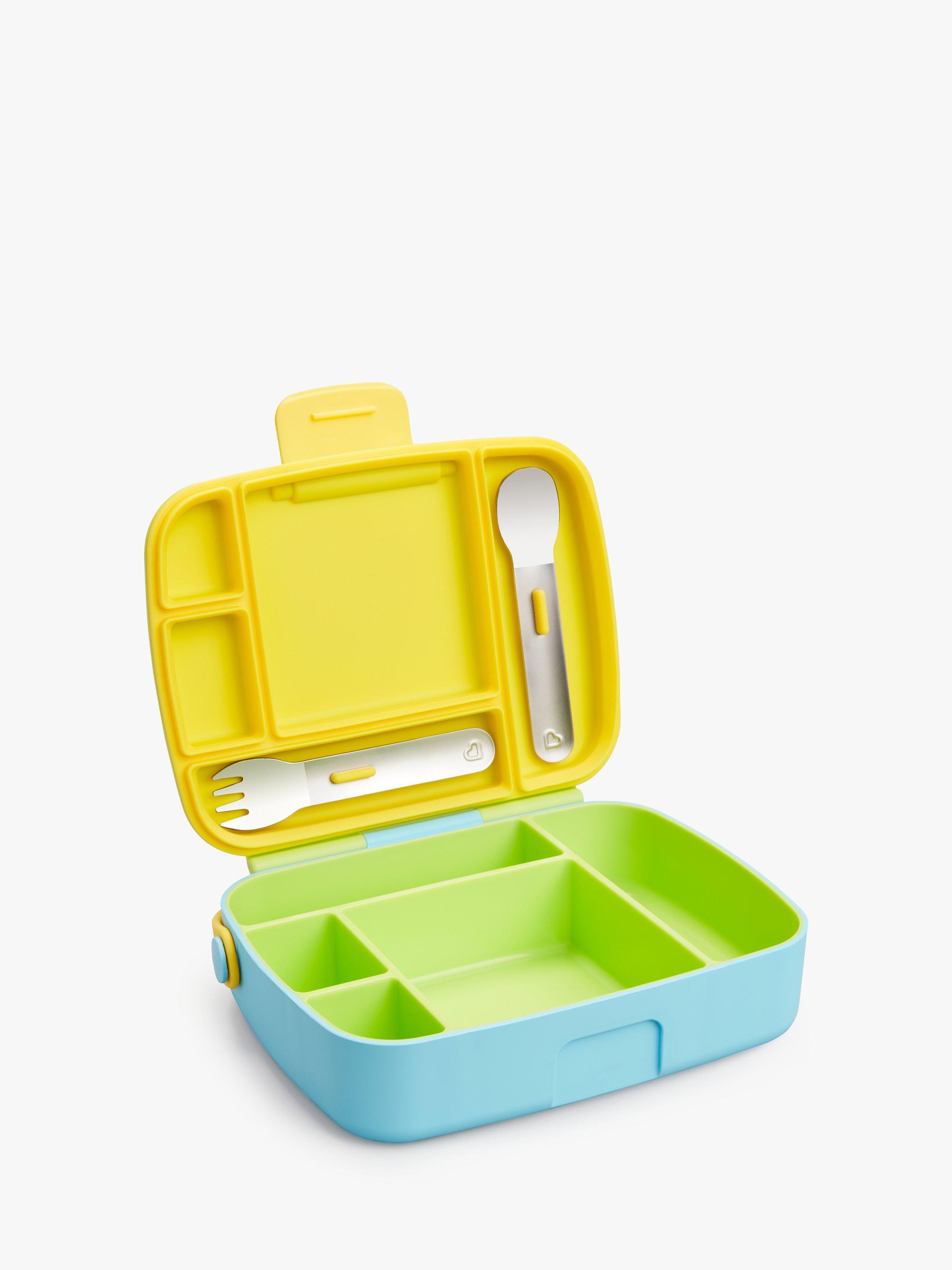 Munchkin's lunch bento box with stainless steel utensils is the perfect step up for toddlers and bigger kids that want to keep food fresh and have a grown-up snack box of their own! The box comes with neatly divided areas that keep food fresh and looks great too!
