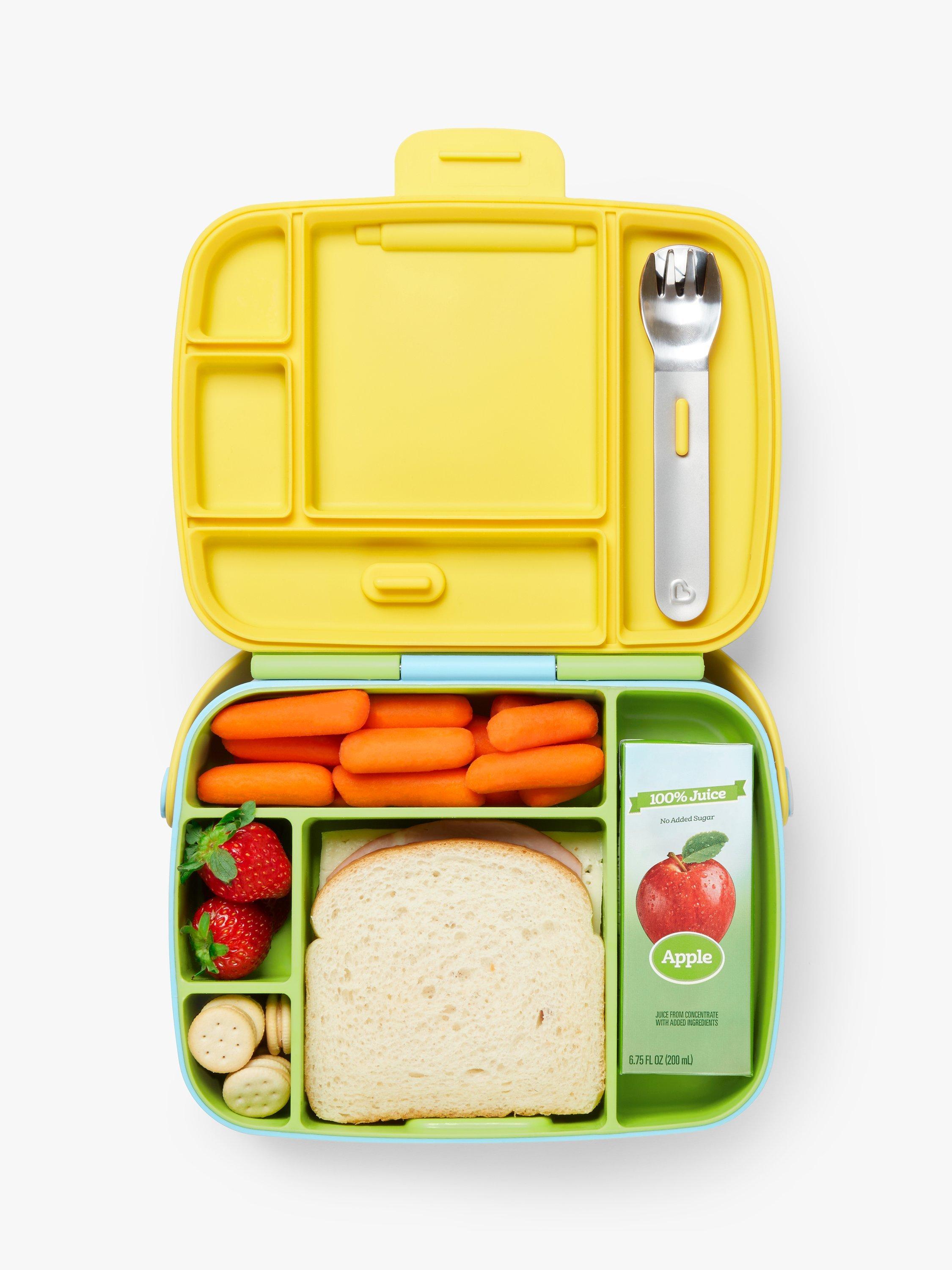 Preschoolers can be particular about everything – especially food. Munchkin's Lunch™ Bento Box with utensils is here to rescue you from picky eating, and lunch packing woes. Designed to fit small portions and small hands, the kids' bento box is what healthy school lunches are all about. In a bento-style box that’s as cute as it is practical, the box has 5 divided compartments to ensure that foods won't touch and are just the right mix of sizes for a kid-friendly, nutritious meal. The toddler bento lunchbox even comes with its own set of stainless steel toddler utensils that snap right onto the lid. Talk about completing a kids' meal with style!