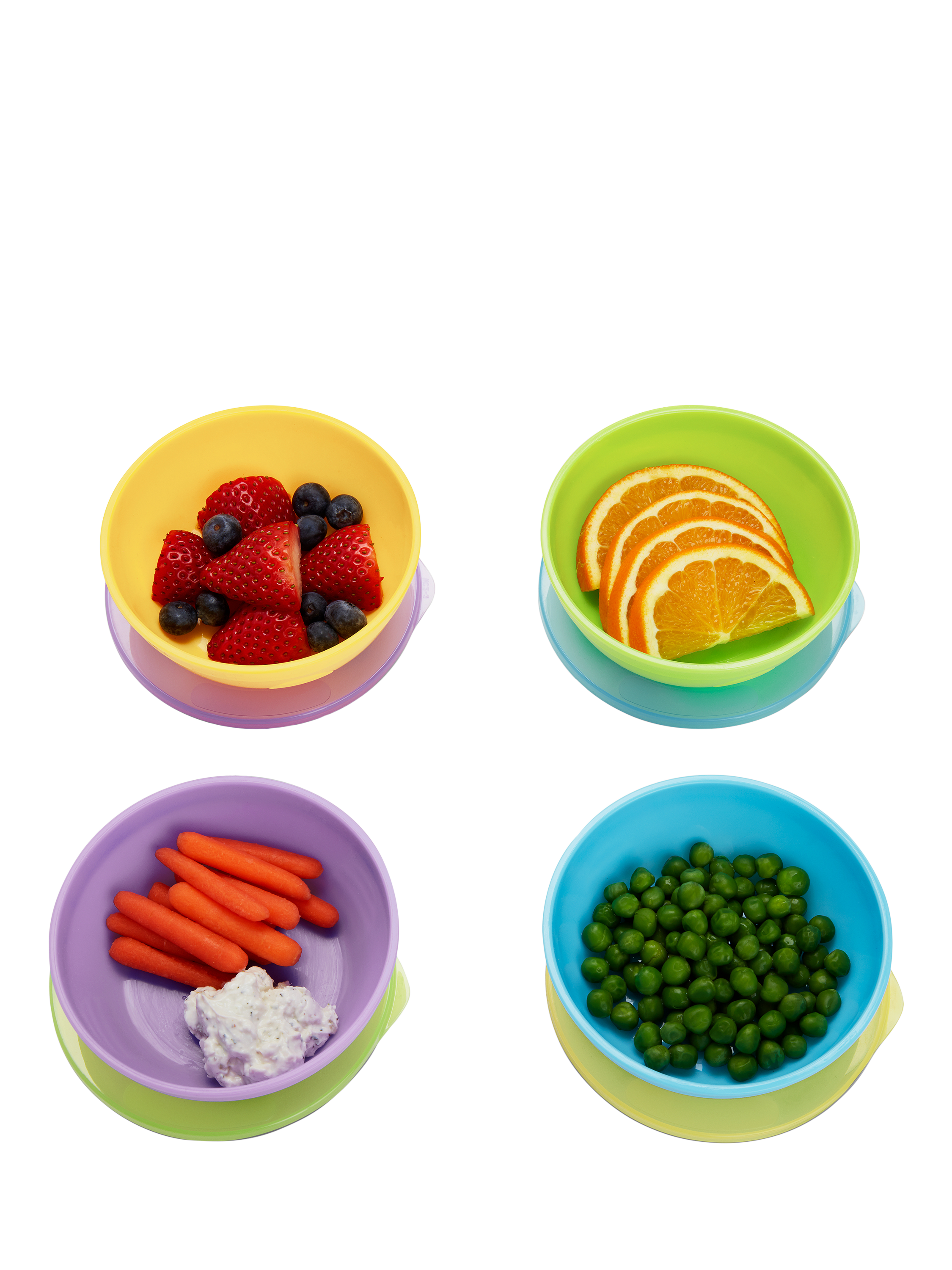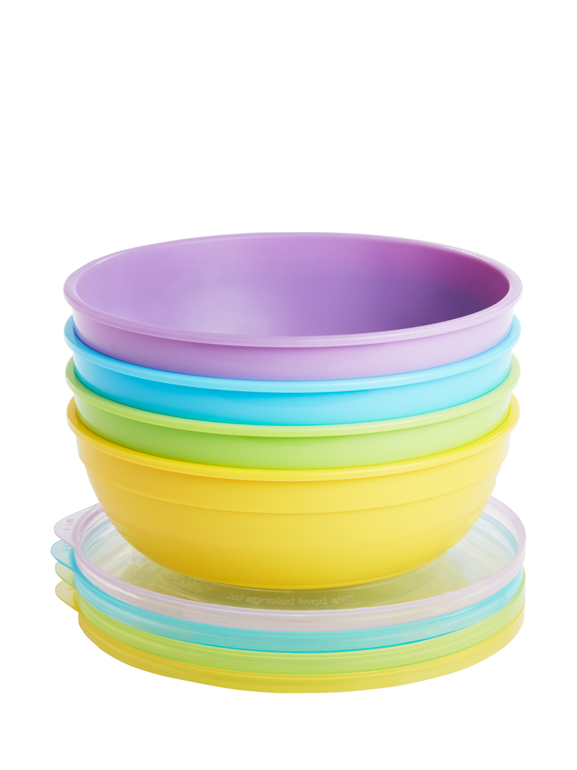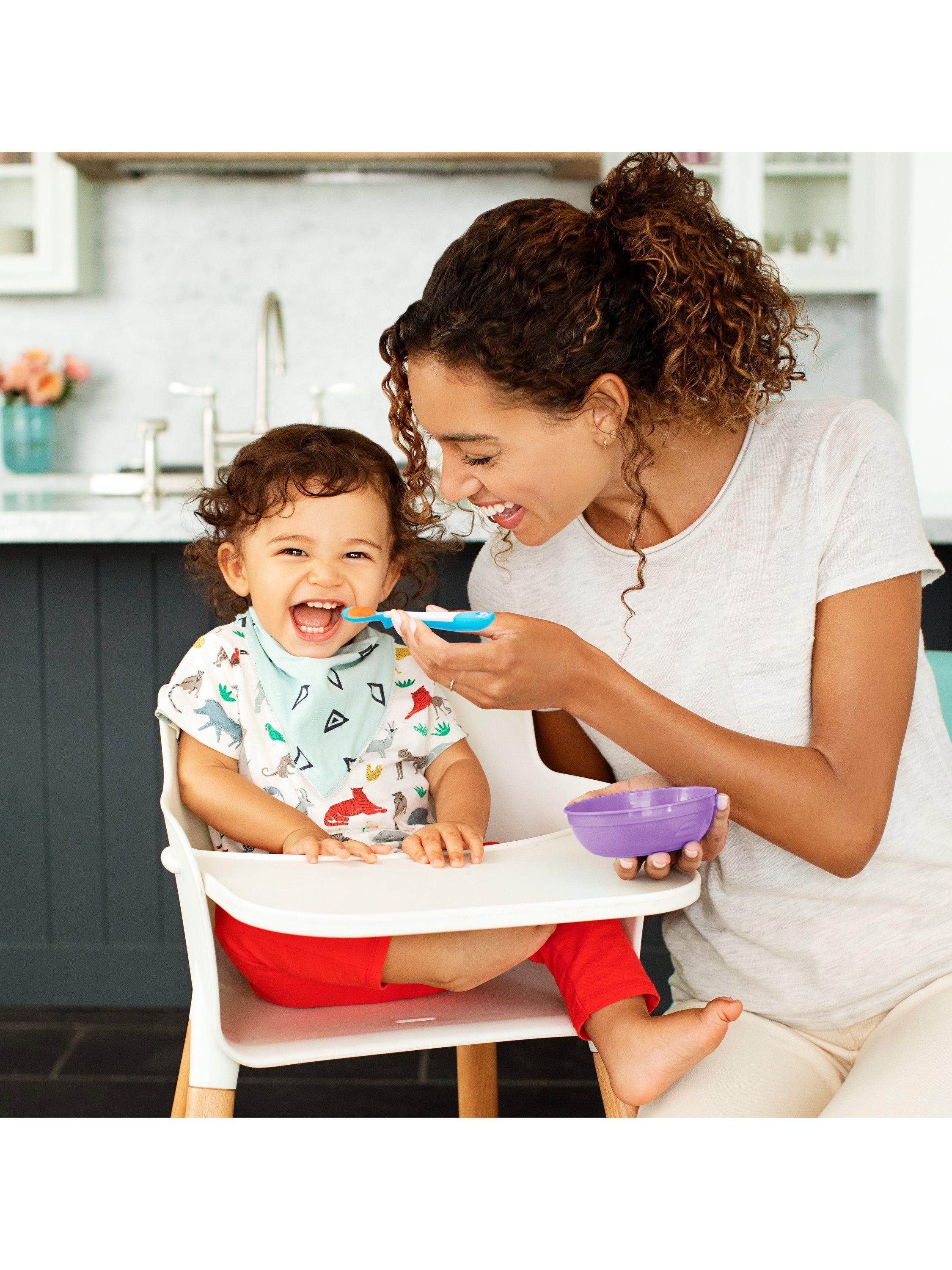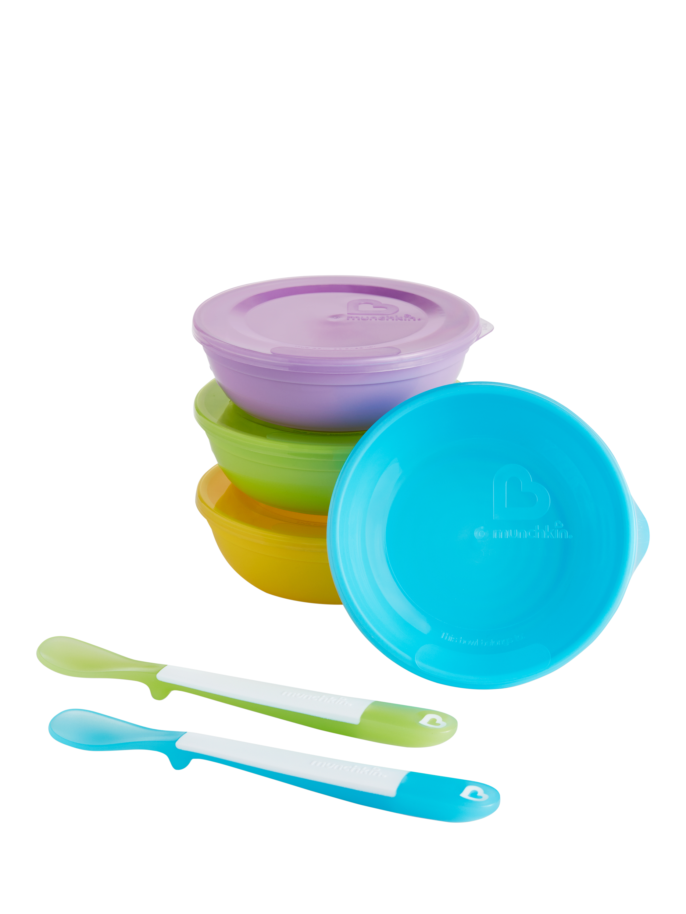 Set of 4 plastic toddler and baby feeding bowls with lids plus 2 x soft tip baby weaning spoons - perfect for breakfast, lunch, dinner and snack time, at home or away. The Munchkin bowls are deep with high sides for easy scooping and seal shut with the included lids. The set's small plastic bowls are ideal as baby-weaning bowls. The children's bowls double as storage pots, for serving and storing food.
