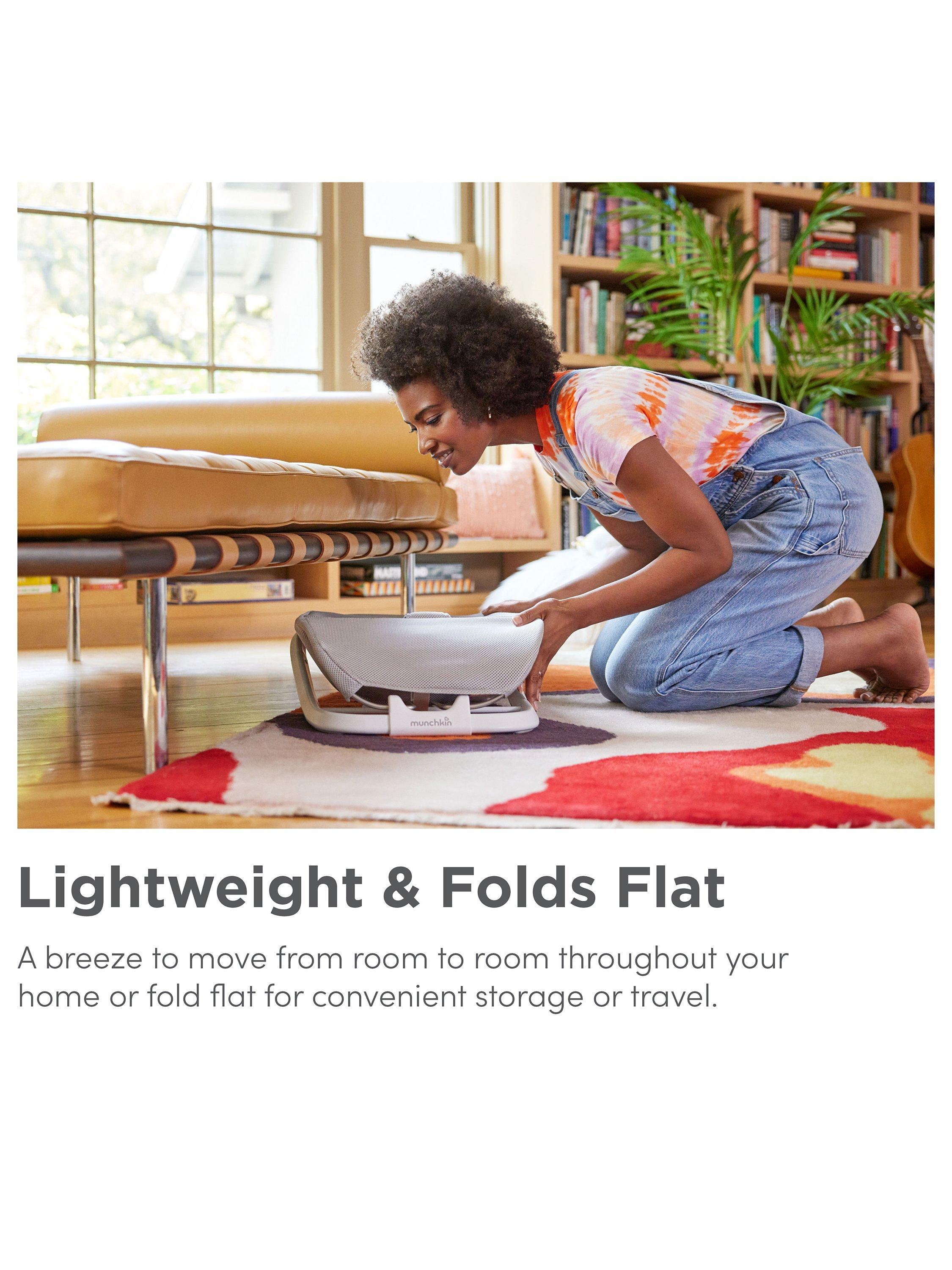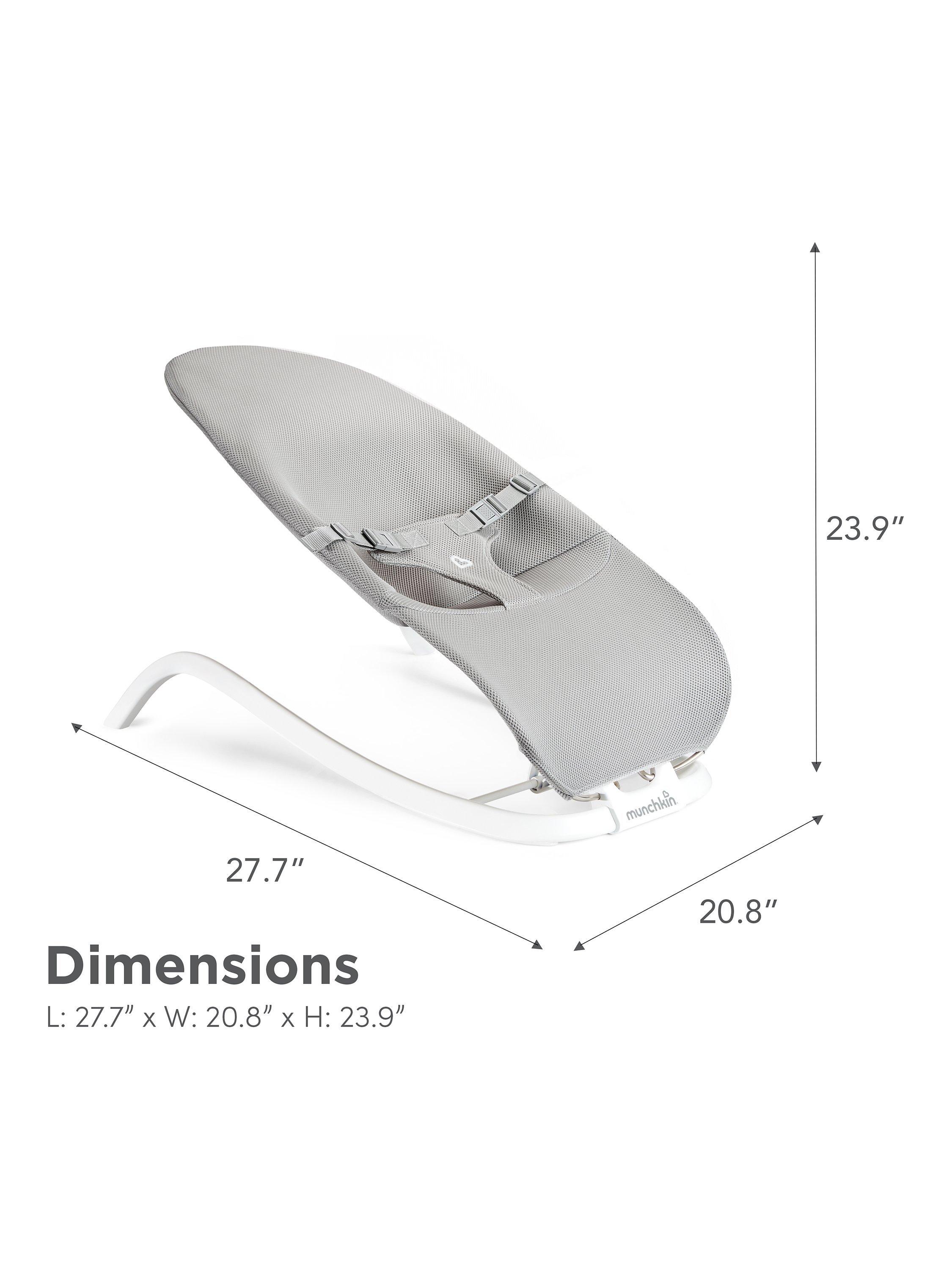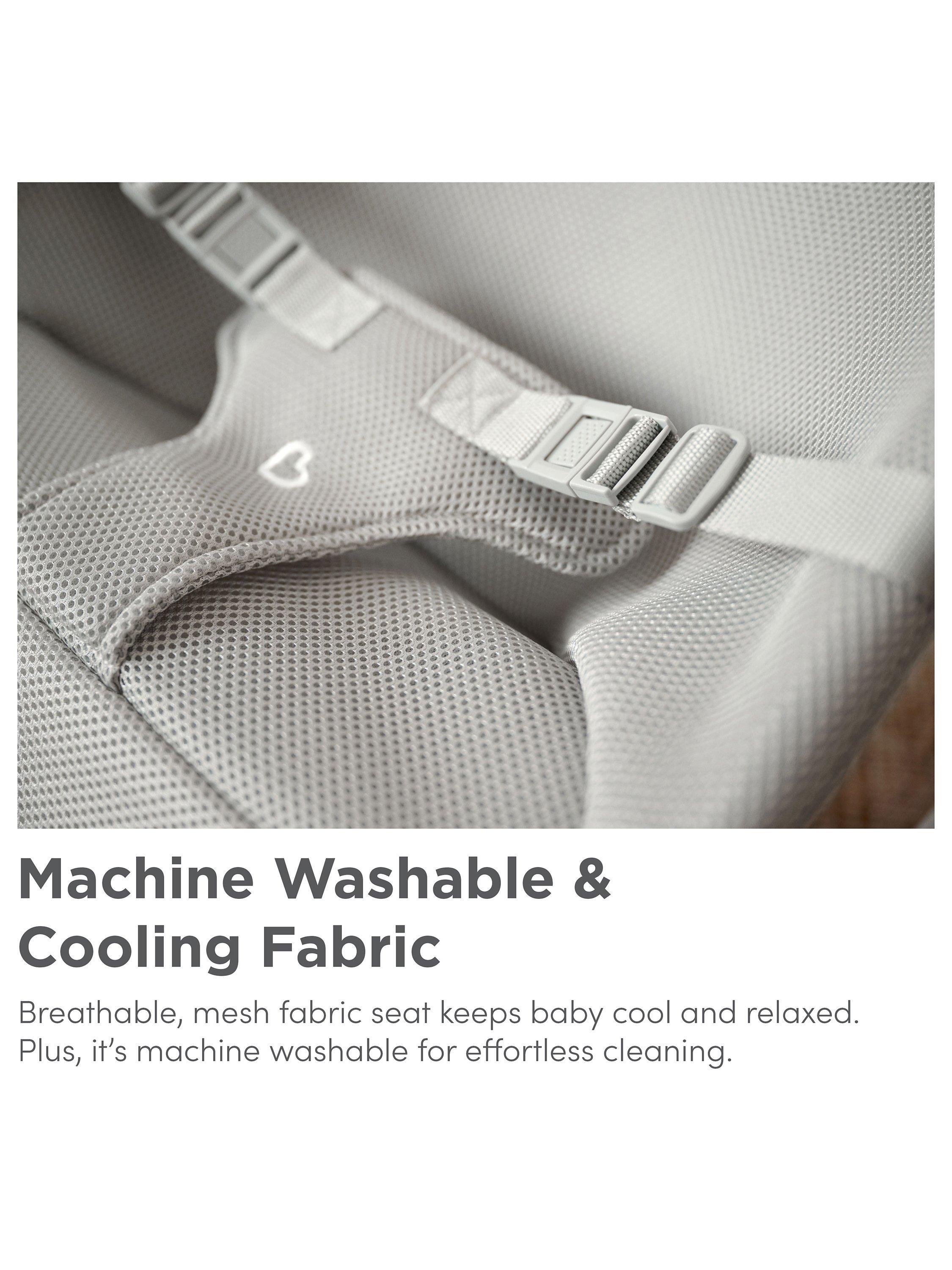 At less than 4 pounds, the 2-in-1 Bouncer & Rocker is a breeze to move from room to room throughout your home or fold flat for convenient storage or travel. It boasts a cooling and breathable mesh fabric seat that keeps baby cool and relaxed. Plus, the fabric is machine washable for effortless cleaning.