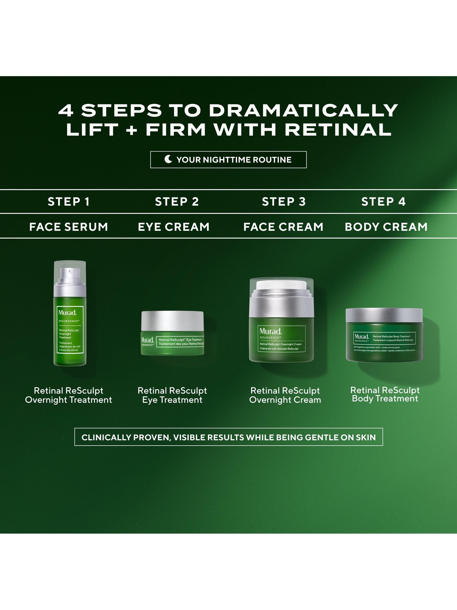 Sleep time is prime time for skin repair. But as we age, repairing abilities slow down, which is visible in the form of wrinkles, sagging, and crepiness. When you switch off, new Retinal ReSculpt Overnight Cream switches on to boost skin's natural overnight repairing abilities, with a dream team of ingredients.
