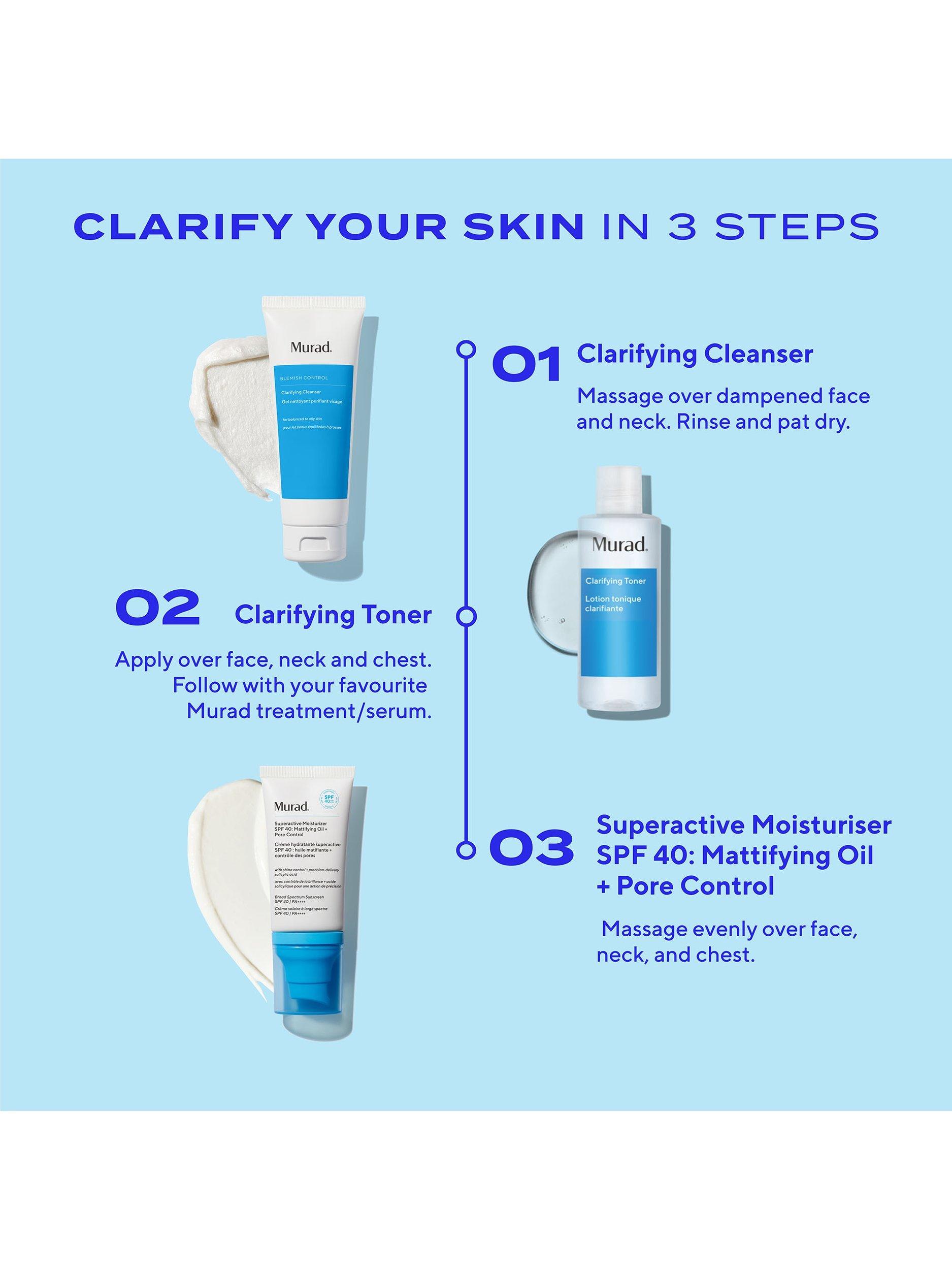 - Step 2: Apply Clarifying Toner over face, neck, and chest, followed by Deep Relief Blemish Treatment for deep blemish bumps, or Rapid Relief Blemish Spot Treatment for pimples and breakouts