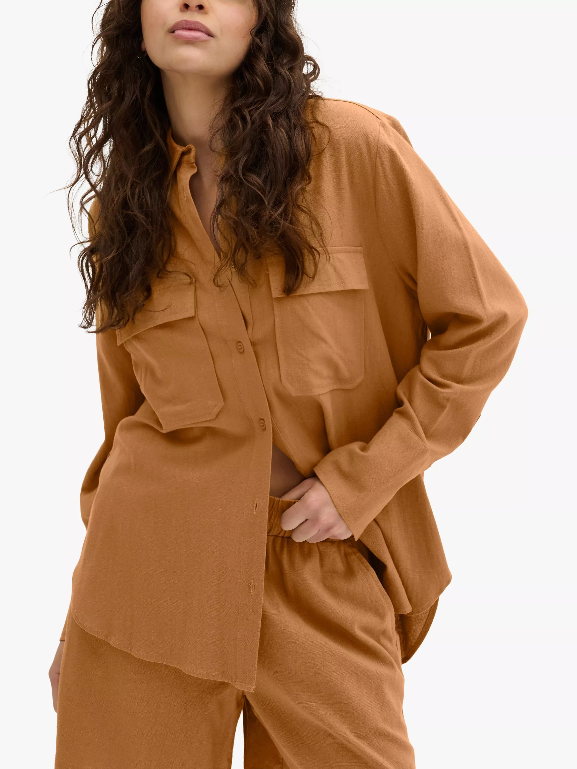Designed with a crisp collar neckline and long sleeves, the linen blend fabric gives it a breathable, airy quality and is ideal for relaxed daytime wear.