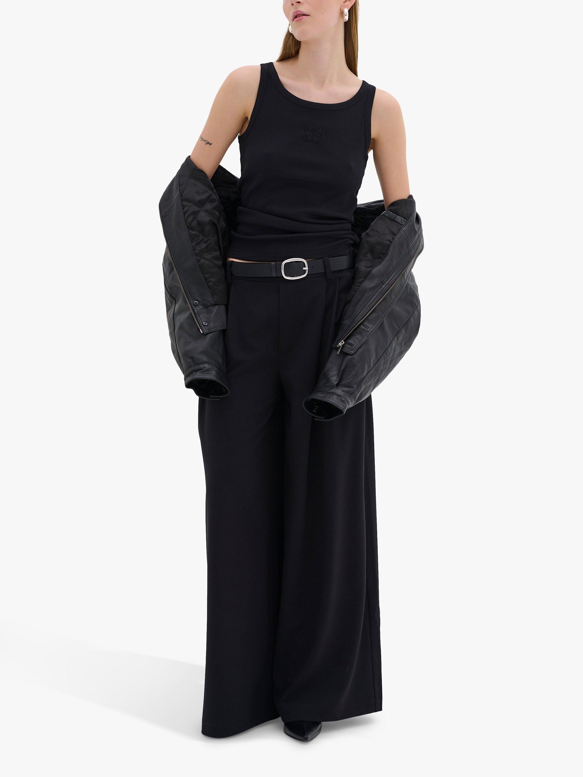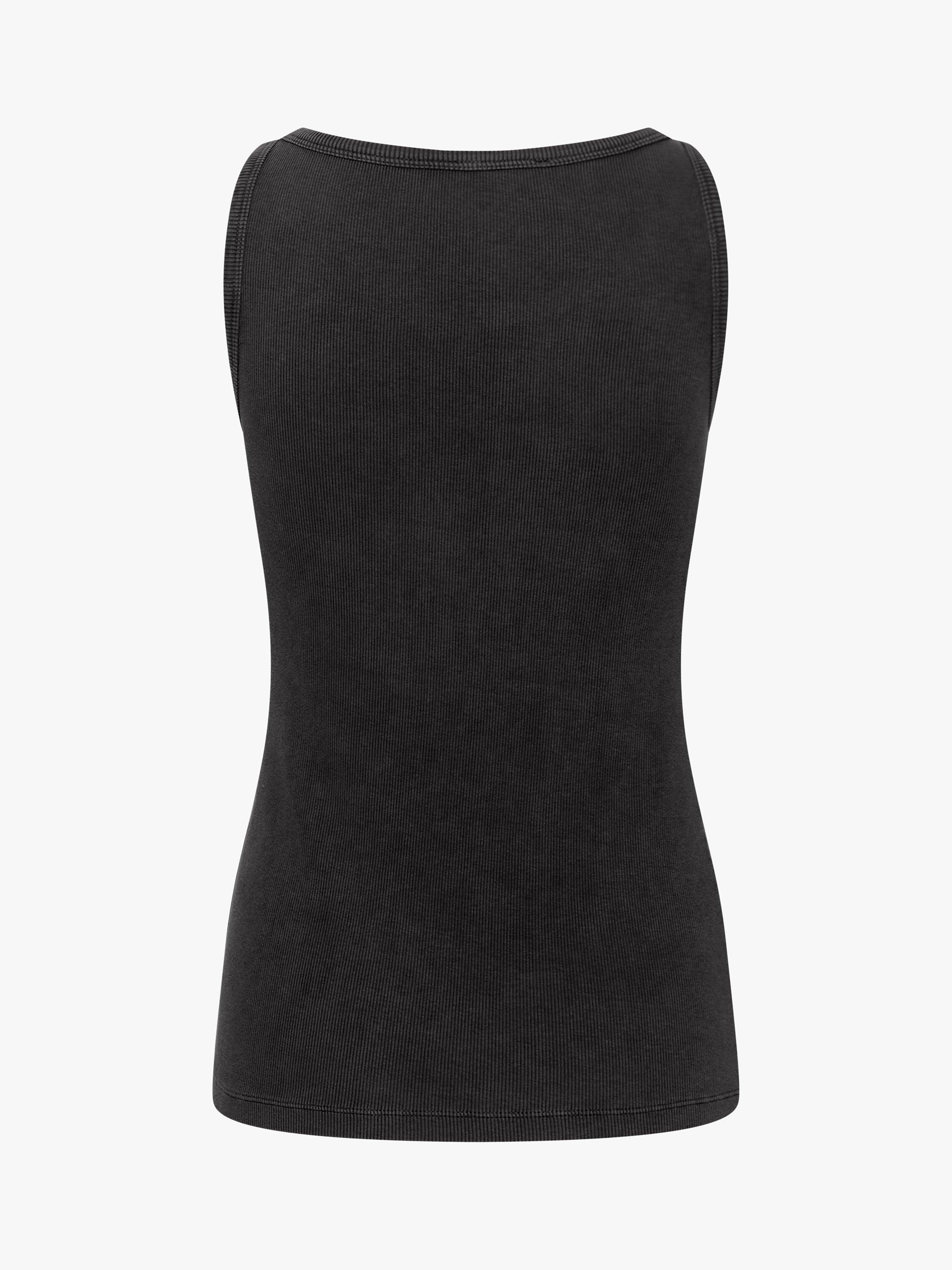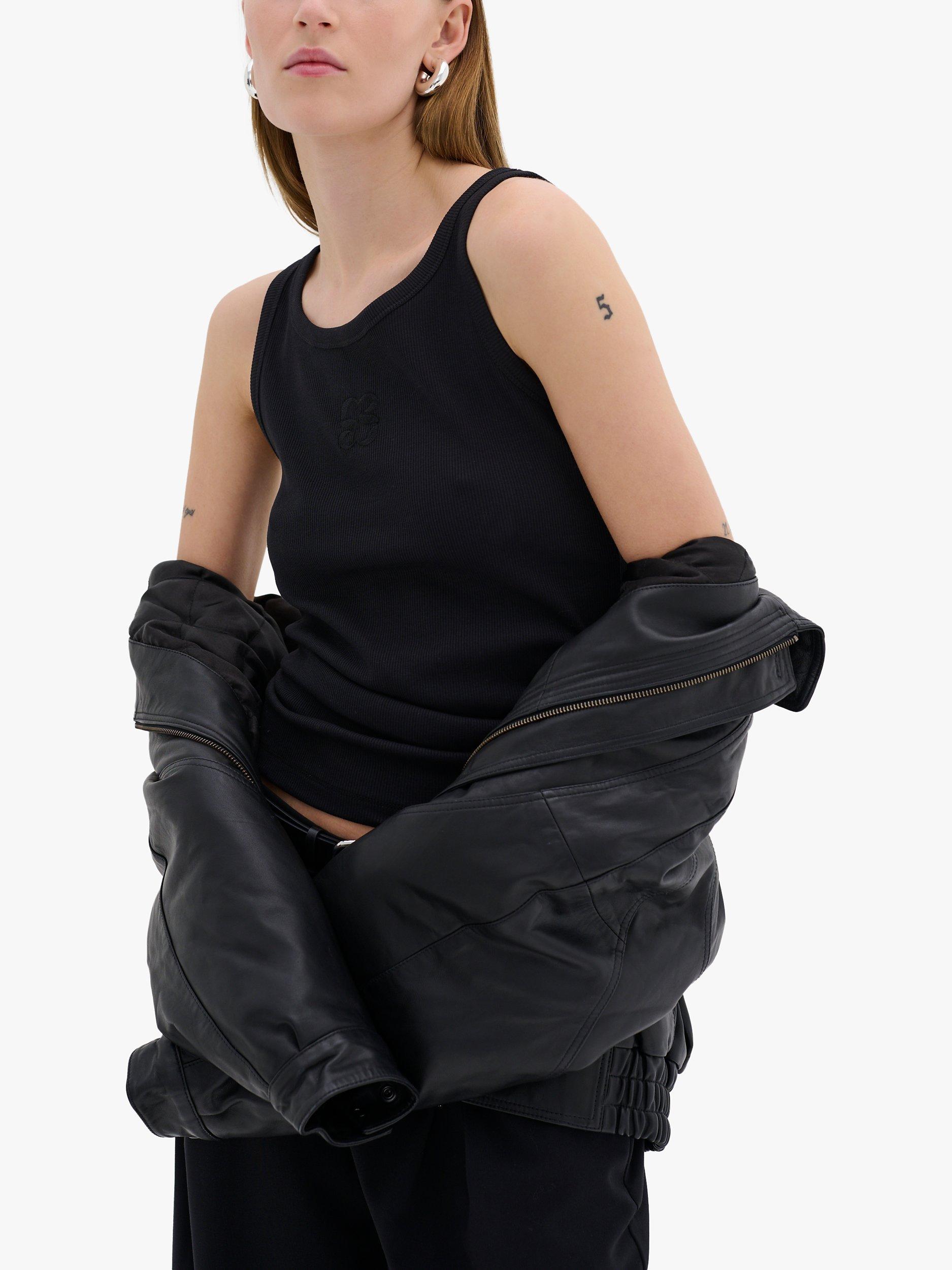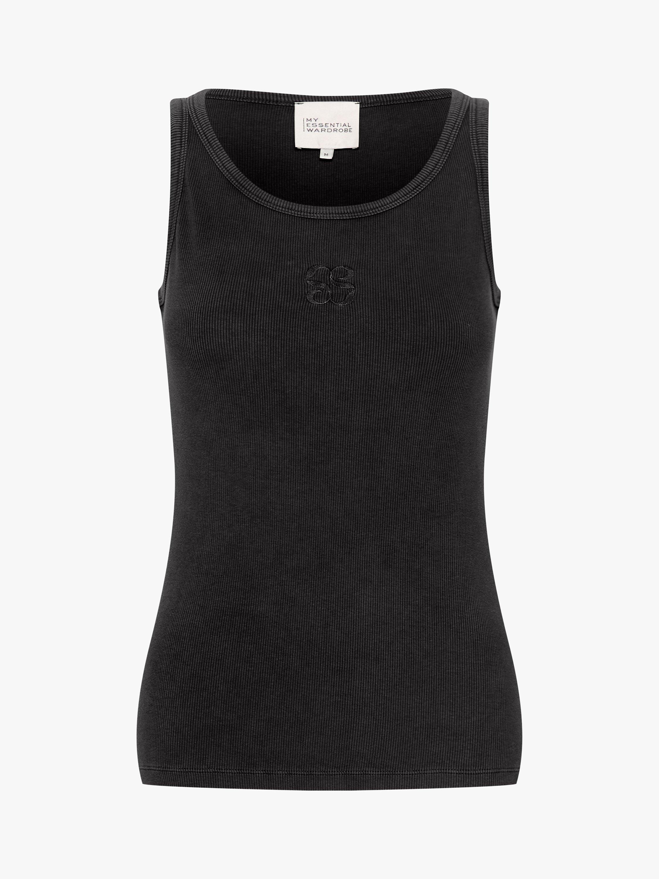 The Mandy tank top is a cool and simple top, that you can style in endless ways. It is sleeveless with a round neck, and it is made in a soft and stretchy rib jersey. The tank top is cut at the hips and has embroidery at the front.