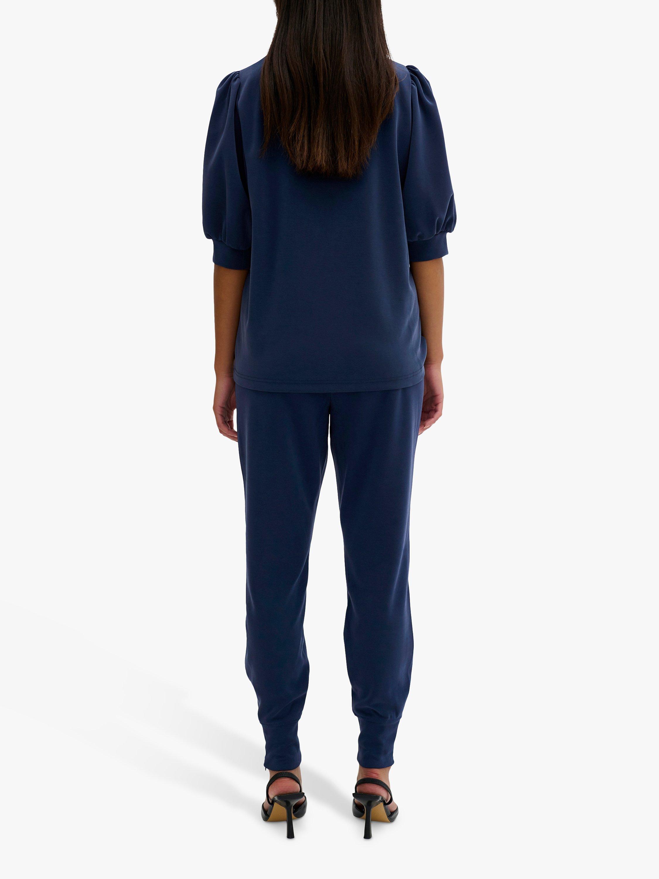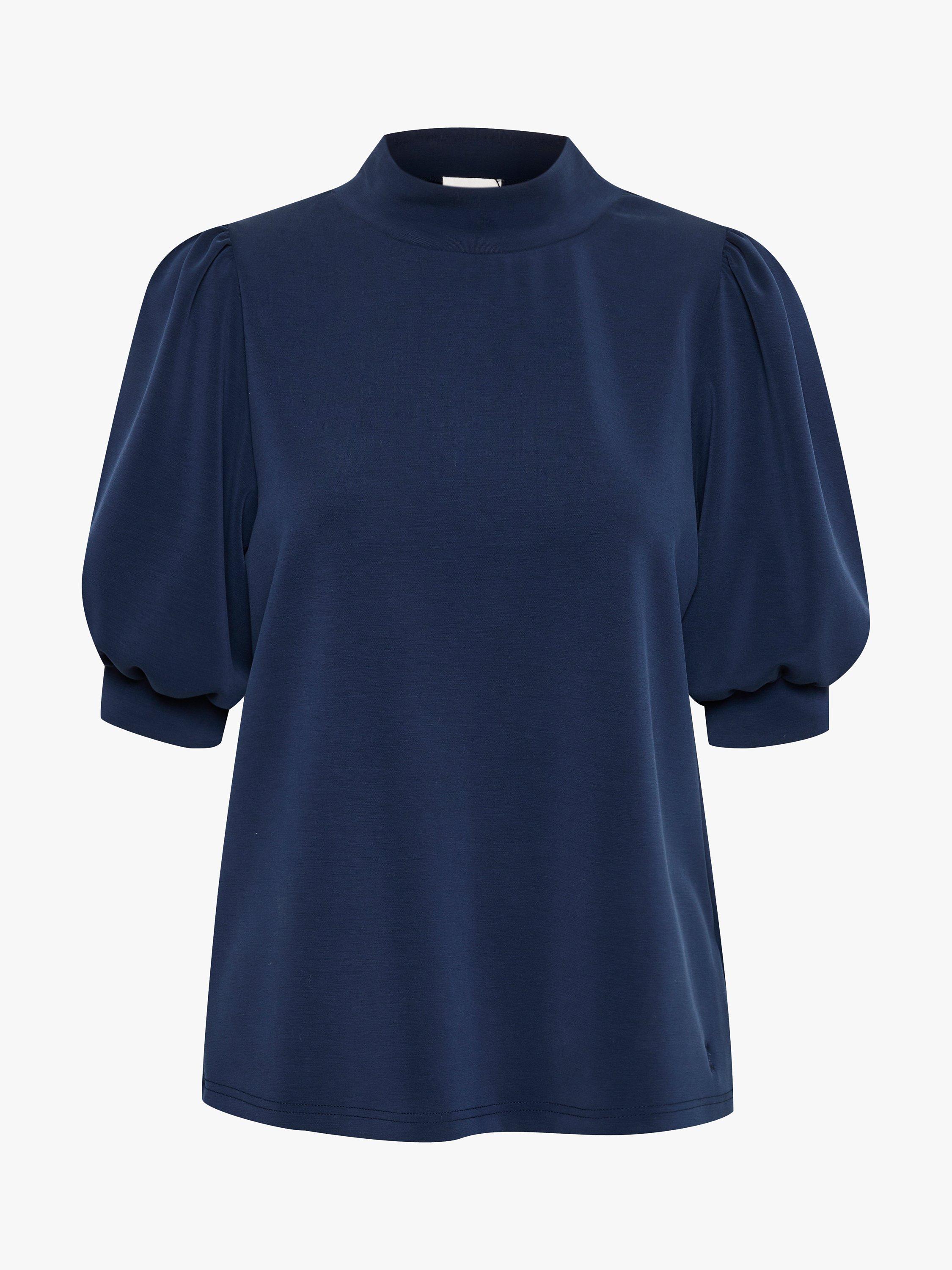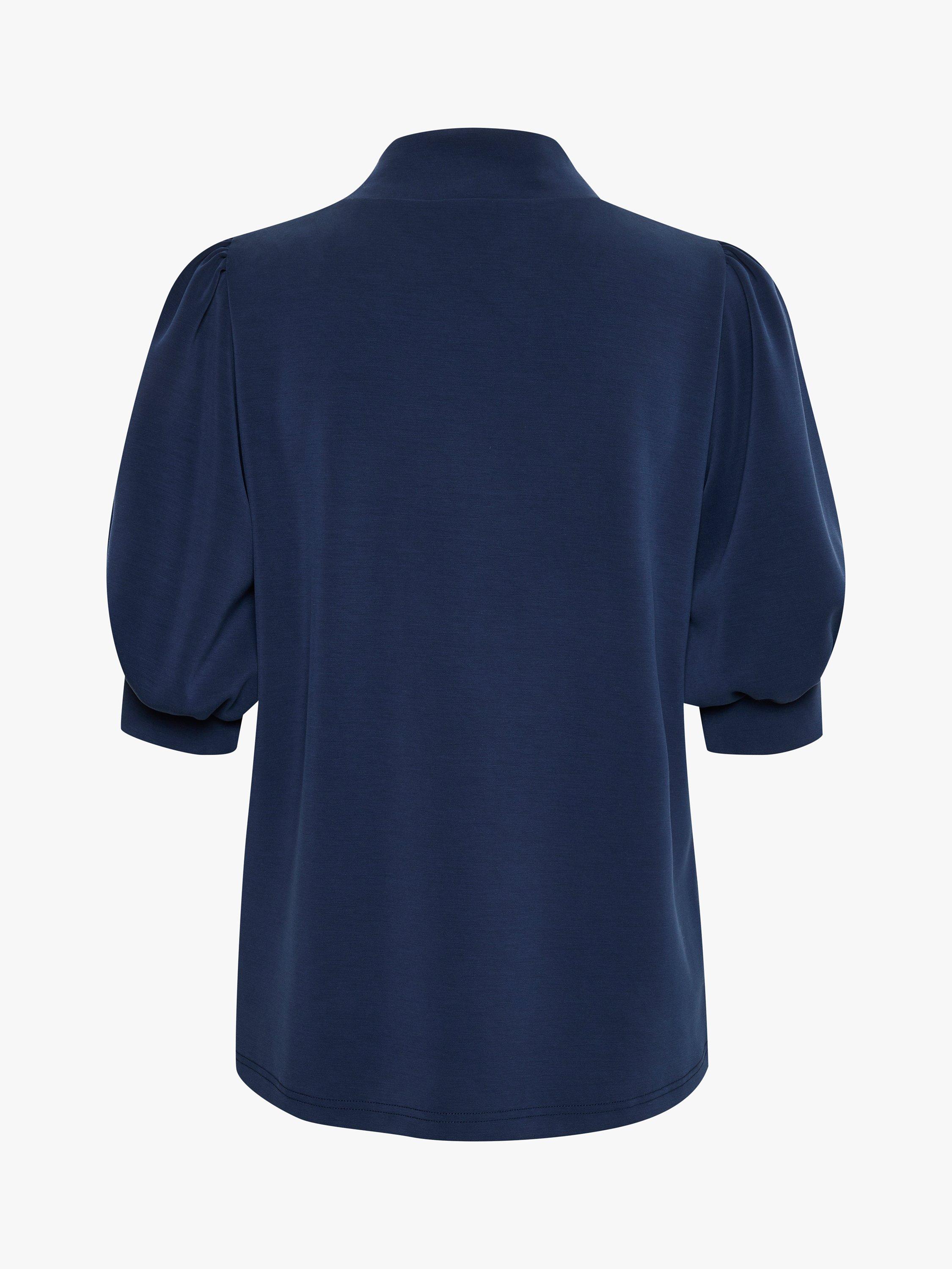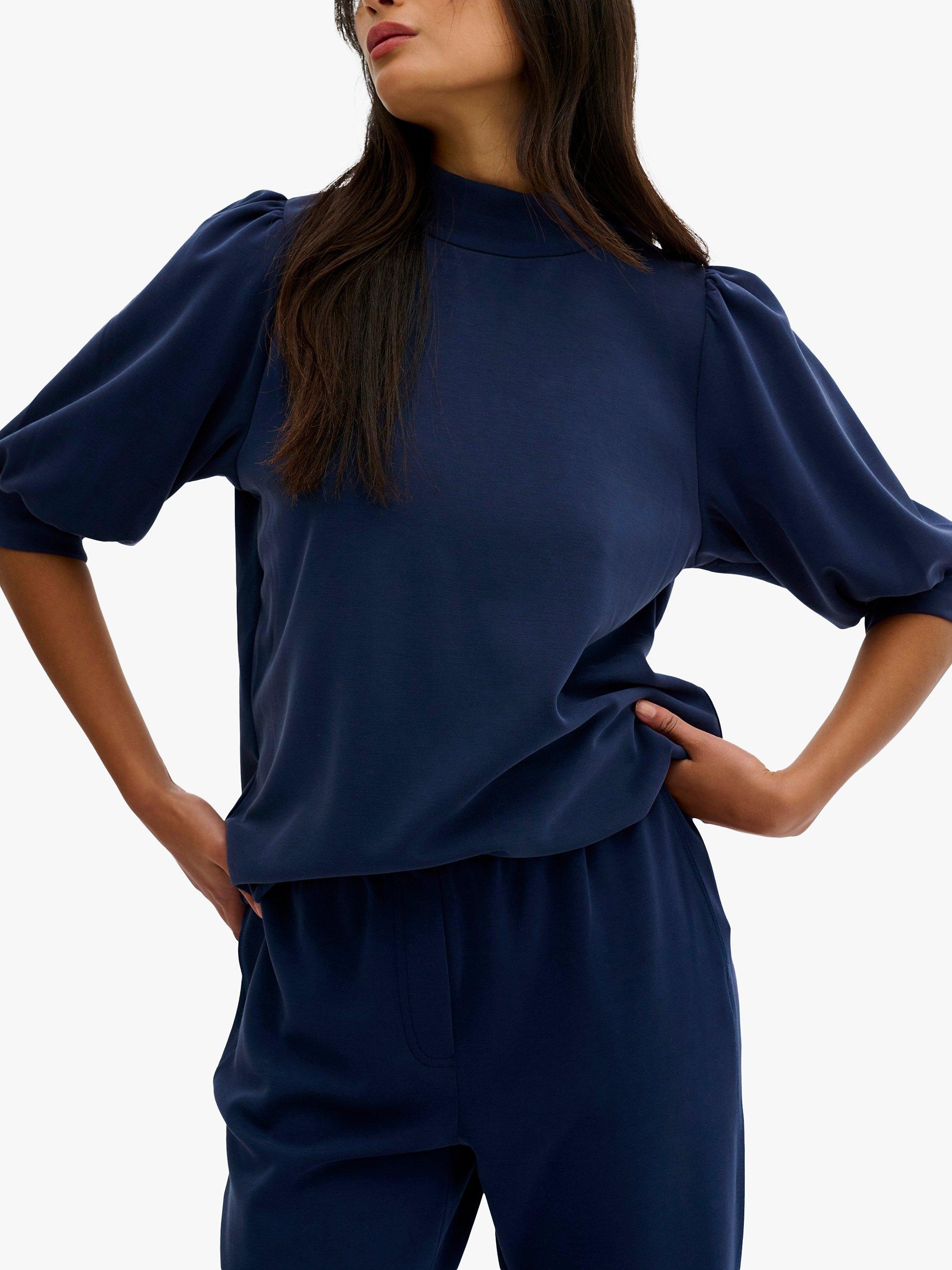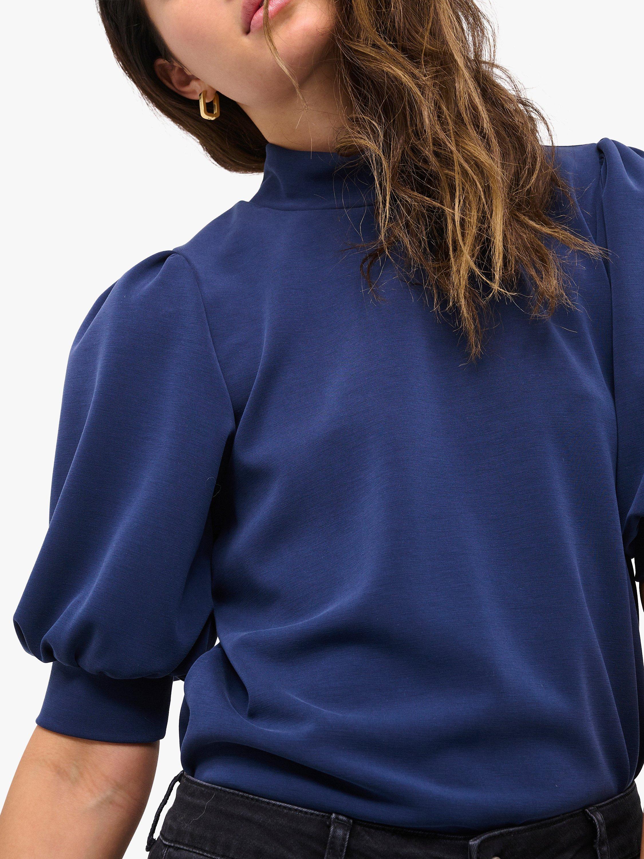 This puff blouse is a feminine and versatile style, that you can wear on any occasion. It has a casual fit with a turtleneck, and it comes down to the hips. The sleeves are half-length puff sleeves, and they are gathered in a cuff.