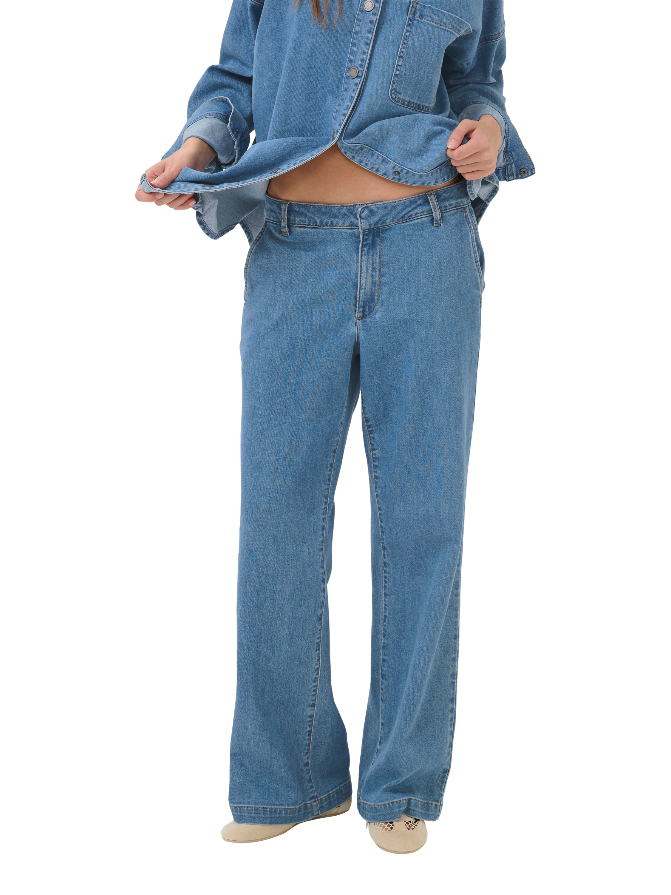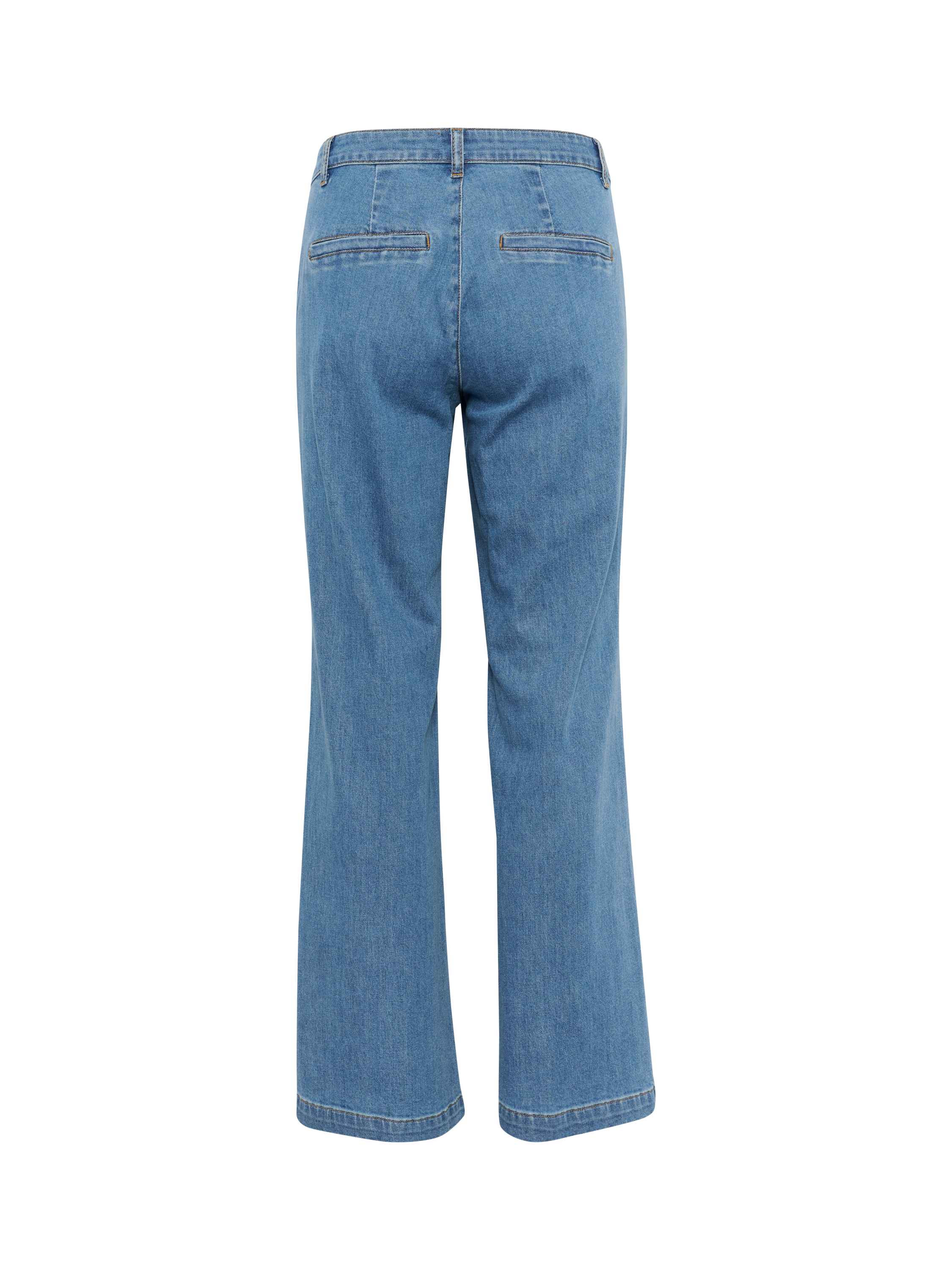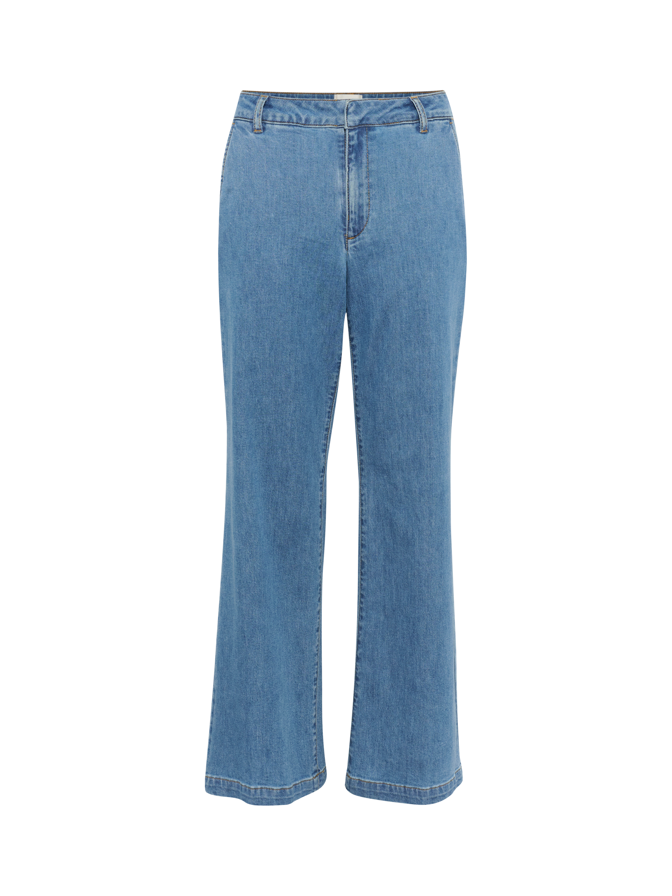 Descending into a flared silhouette, these mid rise jeans by MY ESSENTIAL WARDROBE are crafted from a durable, breathable cotton blend and feature a regular length hem.