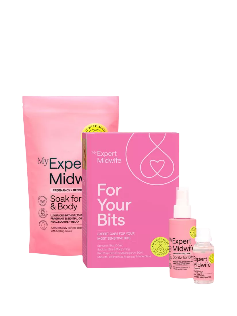 The ultimate “care down there” kit, featuring naturally derived, spa-scented essentials and expert midwife-led Peri Prep Webinar. It’s everything you need to prep your bits for birth, and to soothe afterwards.