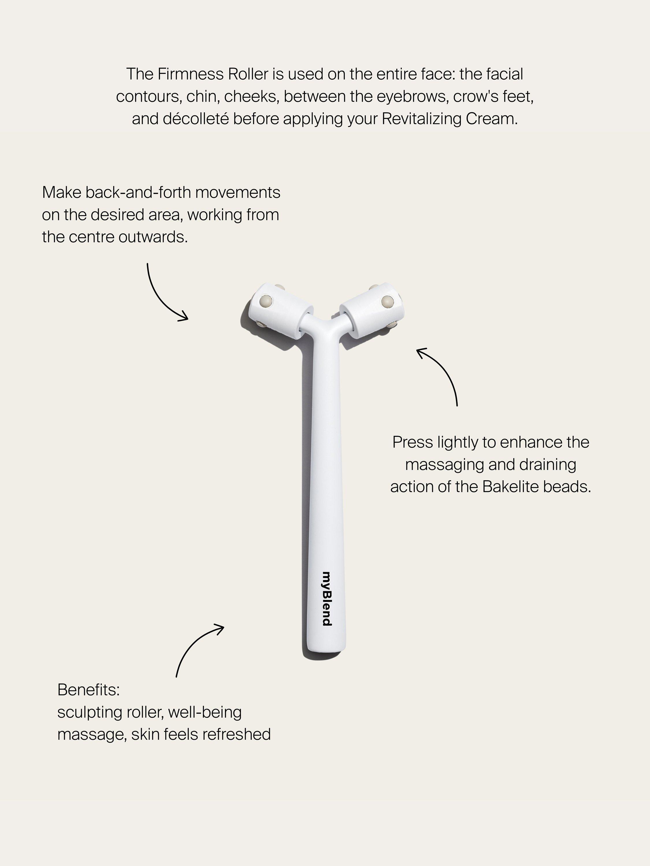 The roller's two rotating heads and the bakelite beads on each head create a dual massage action for a more relaxing effect. Day after day, facial features are refreshed and smoothed, and the skin is replumped.