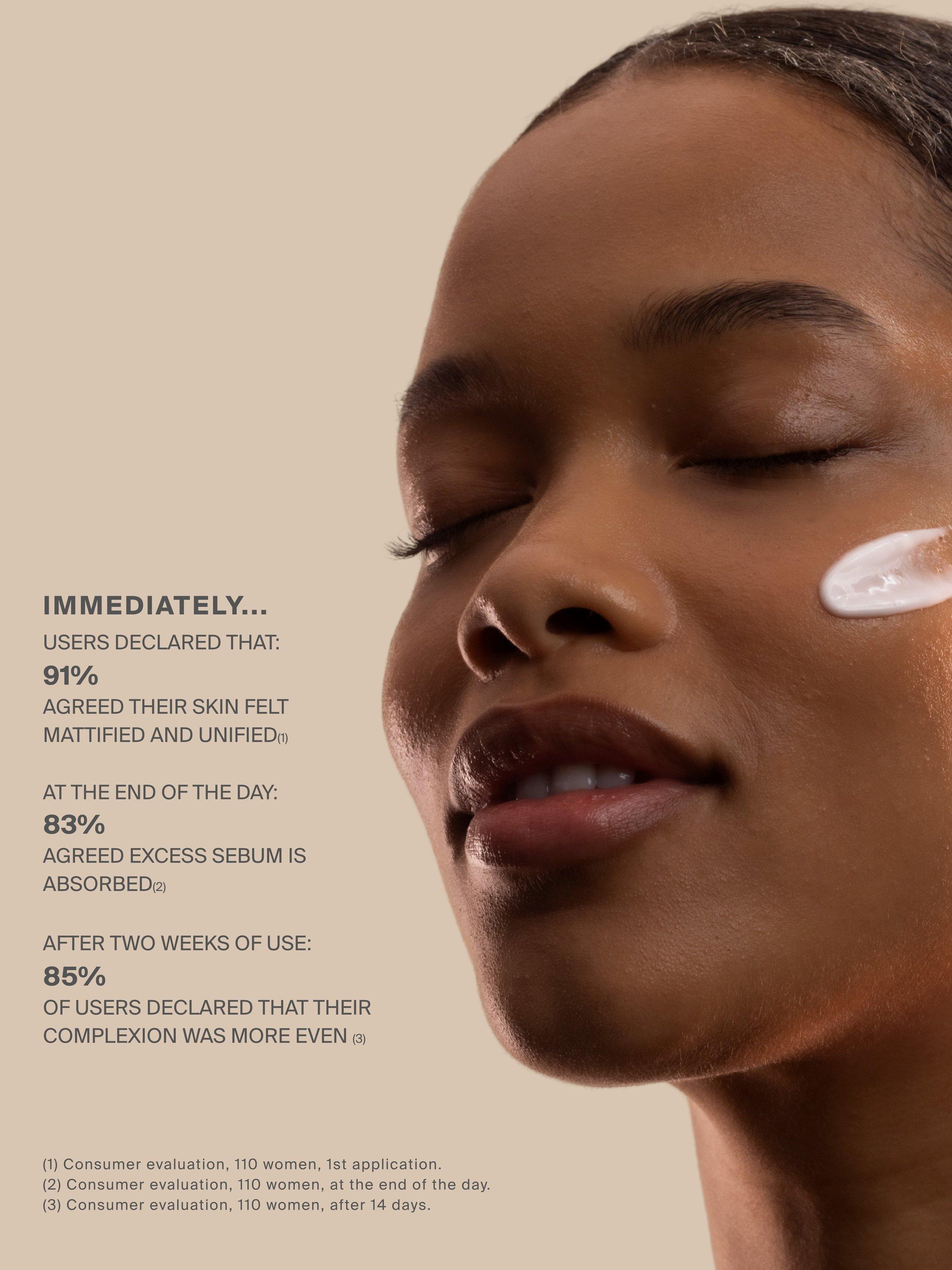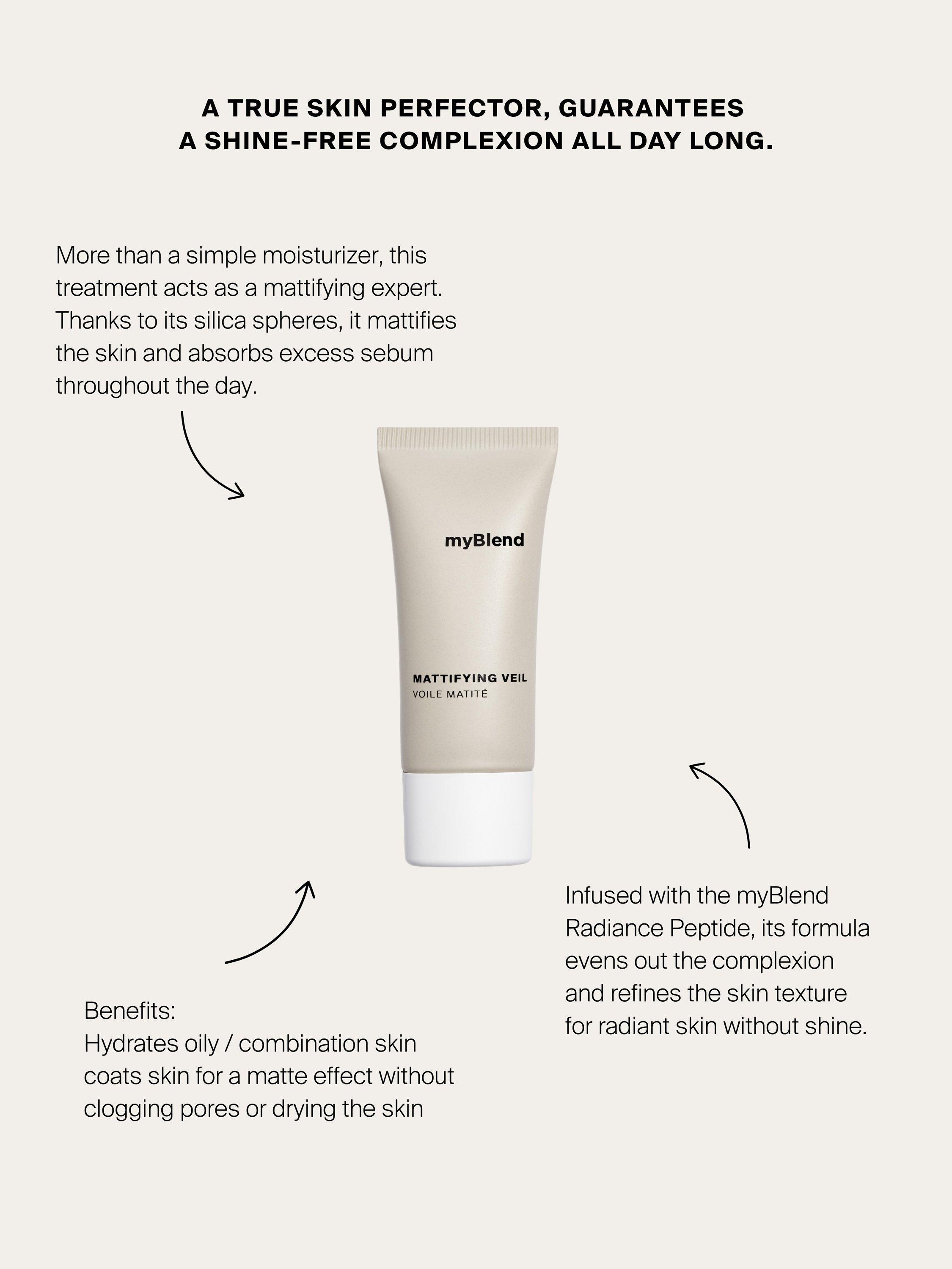 Thanks to its silica spheres, this treatment mattifies the skin and absorbs excess sebum throughout the day. Infused with the myBlend Radiance Peptide, its formula evens out the complexion and refines the skin texture for radiant skin, without shine.