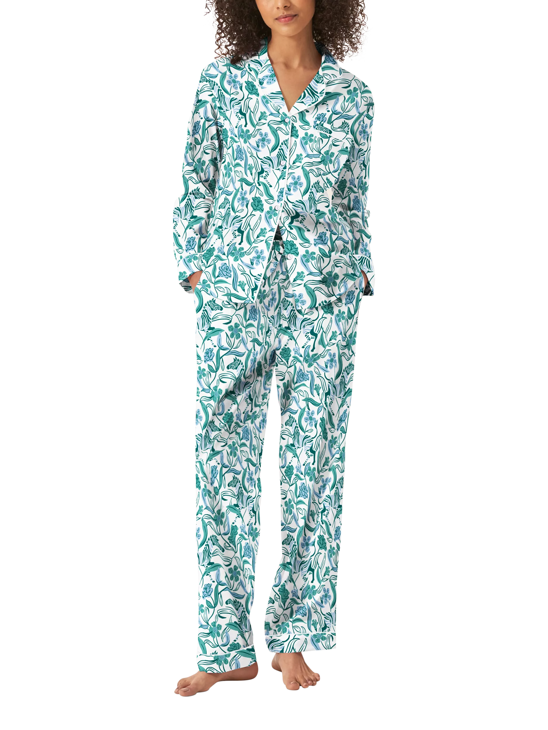 This pyjama set provides both comfort and breathability for a restful night's sleep. The shirt is designed with a notched collar, button fastenings, long cuffed sleeves, and a single patch pocket at the chest. The matching bottoms feature a drawstring elasticated waistband, fabric self-tie, slip pockets at the sides, and a rear pocket for added functionality.