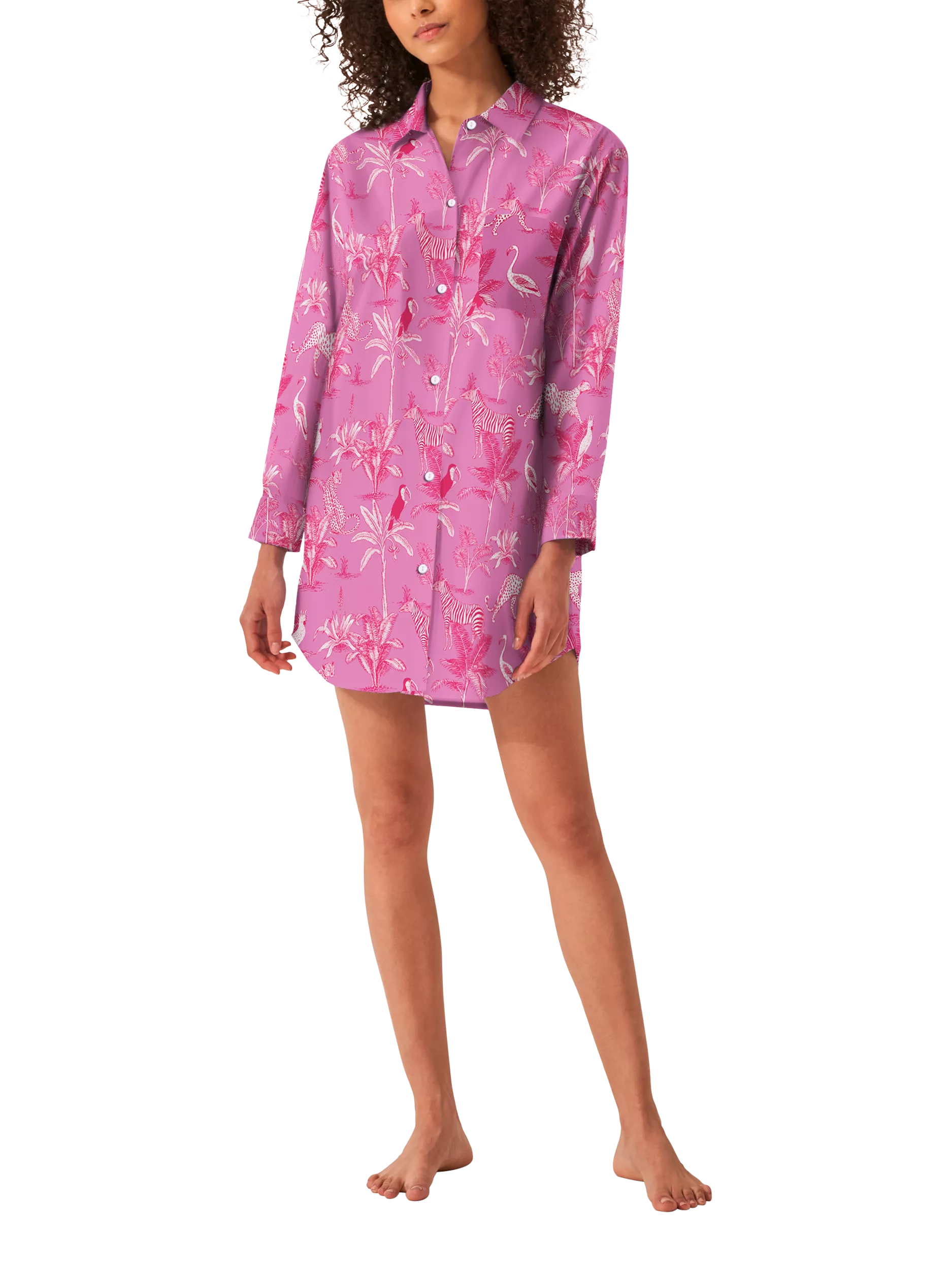 Brightening your nights and mornings with its lively all-over print, this long-sleeved collared nightshirt from myza ensures the utmost comfort with its organic cotton profile.