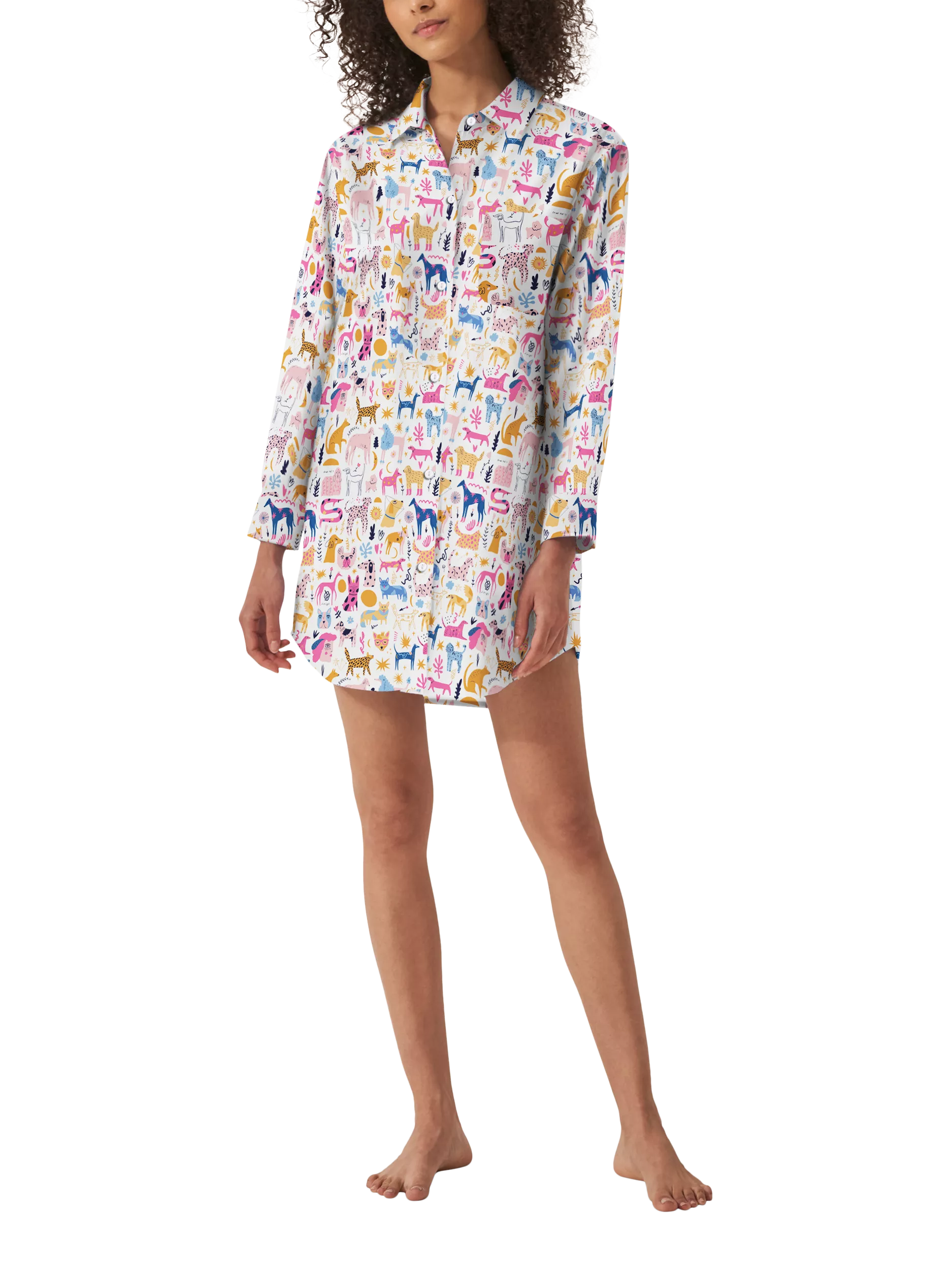 Expertly crafted with a modern spin on a timeless design, this Dog Print Cotton Nightshirt boasts a relaxed yet fitted silhouette. Made of cotton and adorned with a vibrant all-over print, this nightshirt will add a touch of liveliness to your evening and morning routines. Complete with a pointed collar, button closures, cuffed long sleeves, and a convenient patch pocket, this piece blends style and comfort effortlessly.