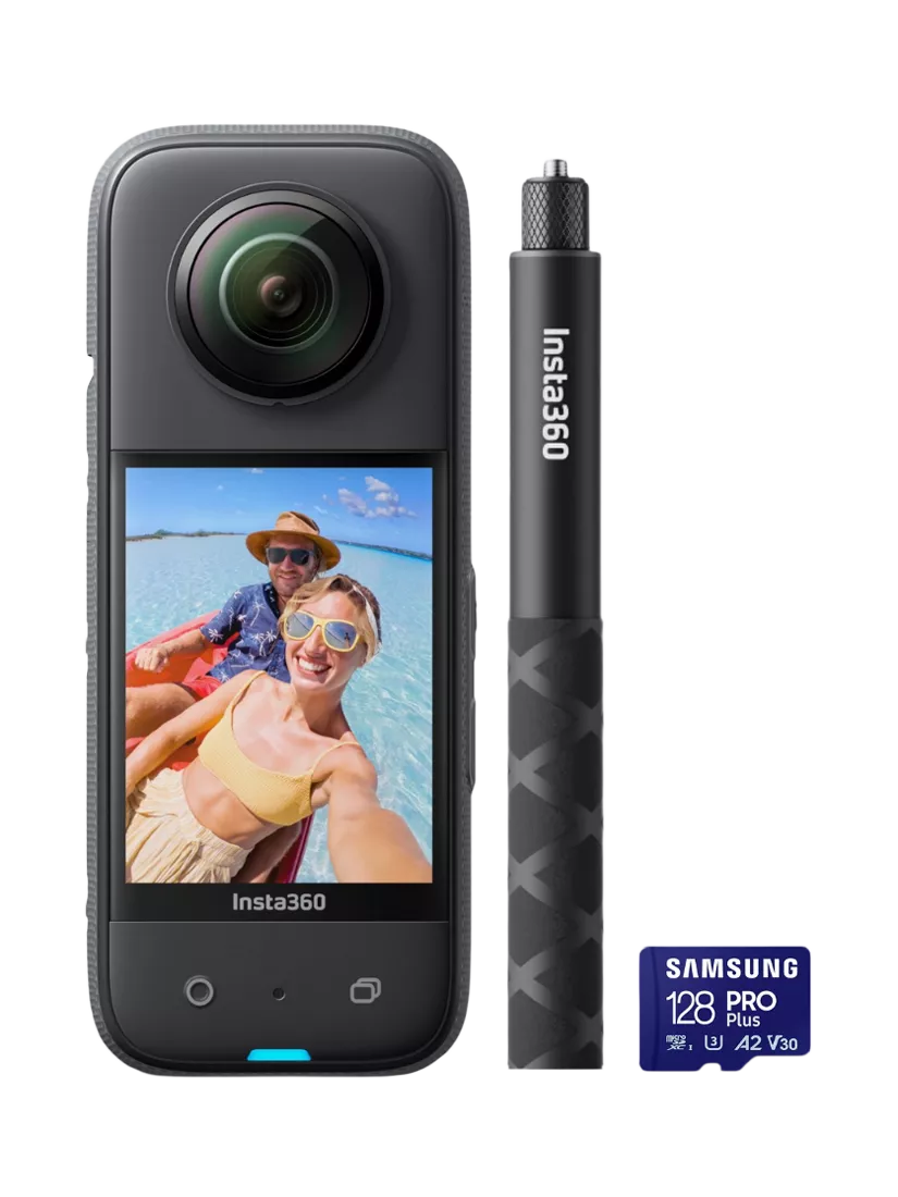 - Insta360 X3, Charge cable, Protective Pouch, QuickStart Guide, Lens Cloth, Insta360 Invisible Selfie Stick, Samsung Pro Plus MicroSDXC 128GB