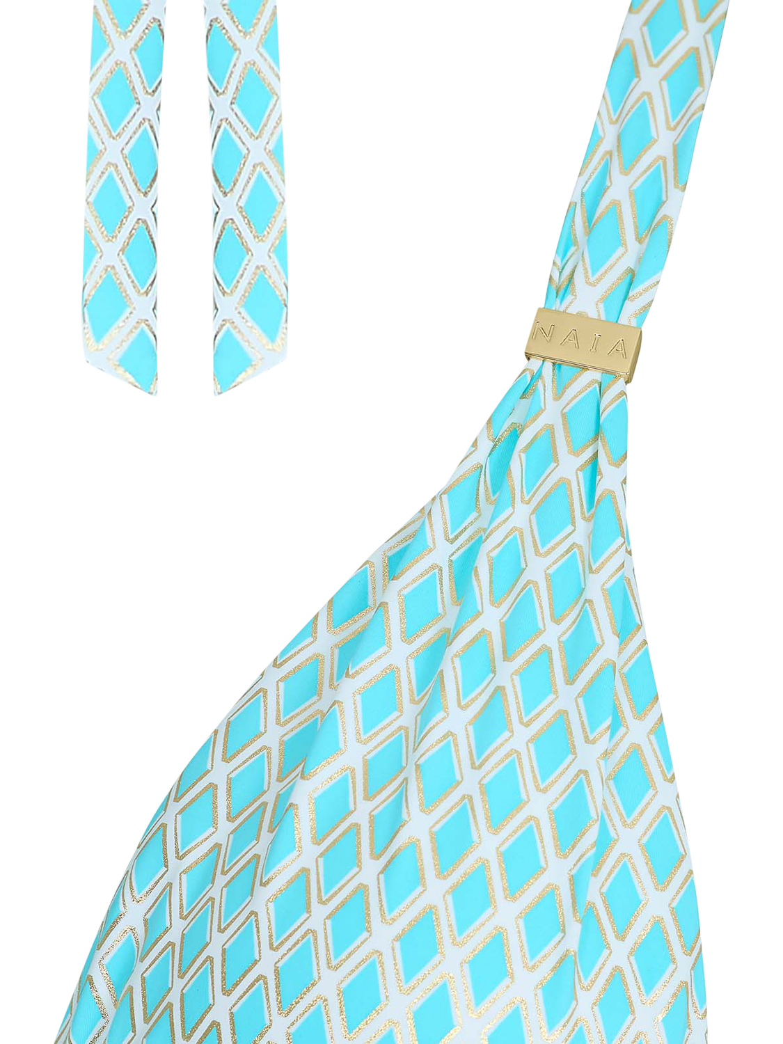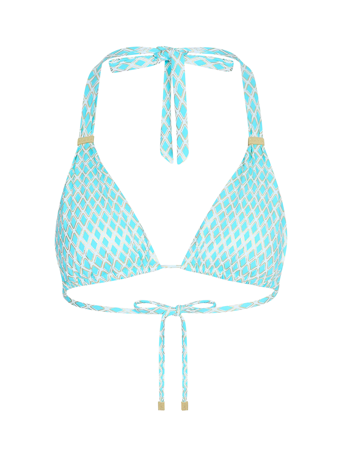 With gold foil for a subtle, sun-catching glow, this fully bikini top has an adjustable halter style that allows you to refine your fit with ease. Gold Naia sliding trims add a touch of polished glamour, while removable pads let you choose your level of shape and coverage. With medium/light support, it’s a flattering choice for cup sizes up to a D.