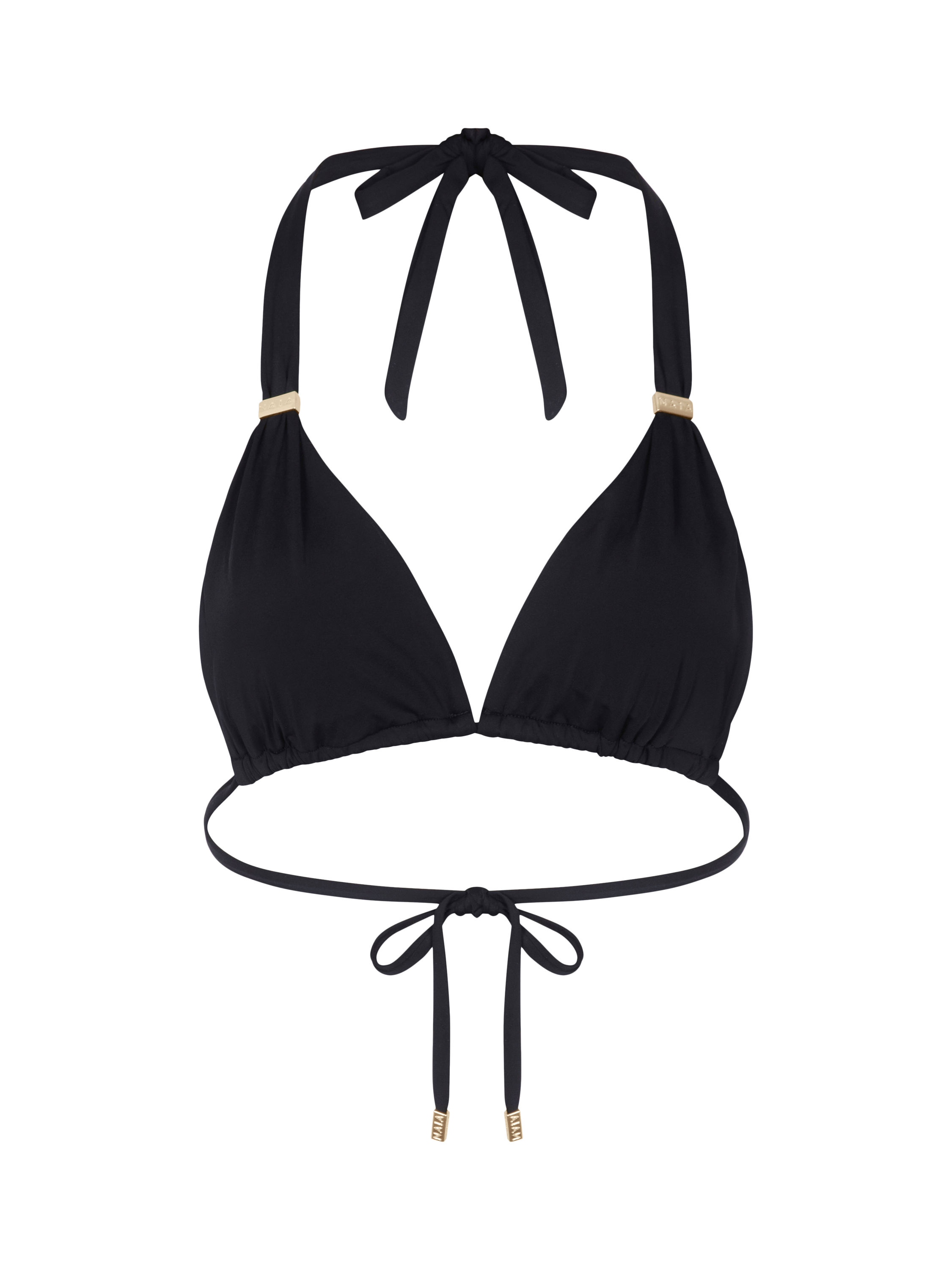A fully adjustable halter top, with sliding trims, ties at the neck and back, and medium/light support.