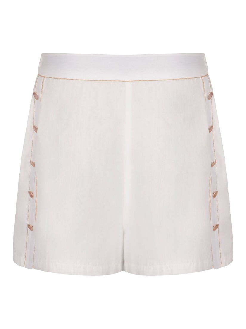 Designed for laid-back summer style, the loose-fitting silhouette of these shorts features a high waist for a flattering finish, while a non-functioning gold button placket adds a subtle touch of luxury. Side seam pockets combine practicality with style.