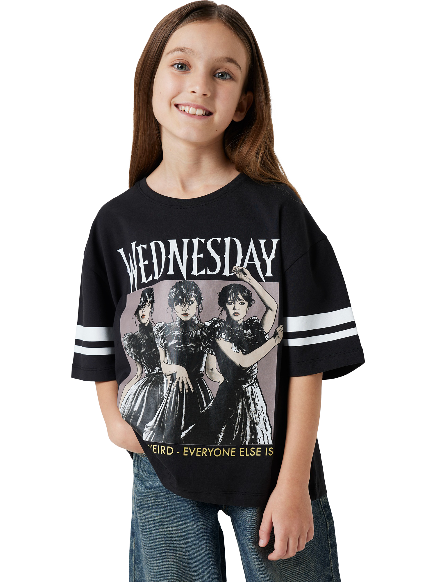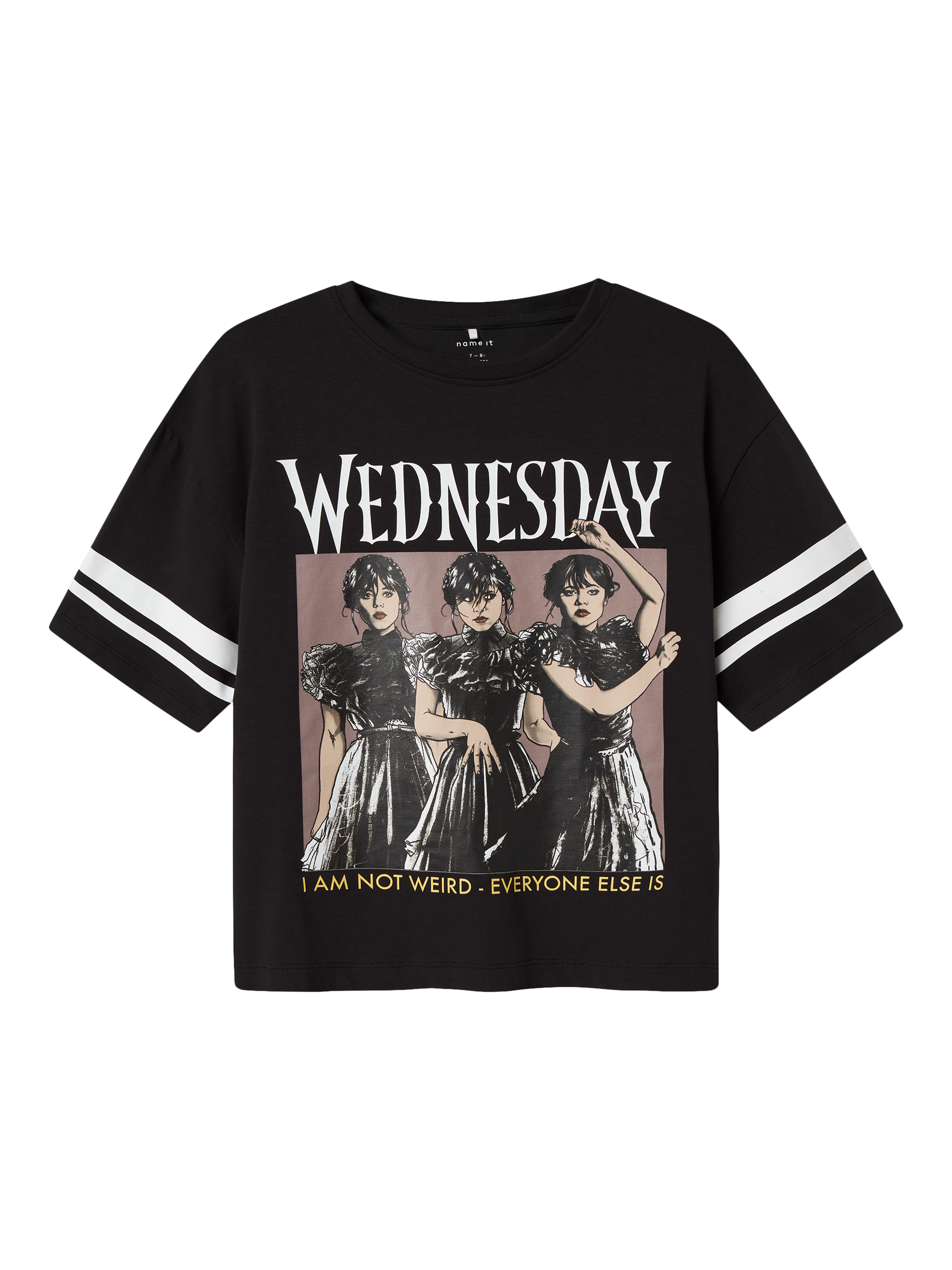 A round-neck T-shirt from NAME IT, crafted from stretch cotton jersey. Featuring short relaxed sleeves and Wednesday Addams prints to the front.