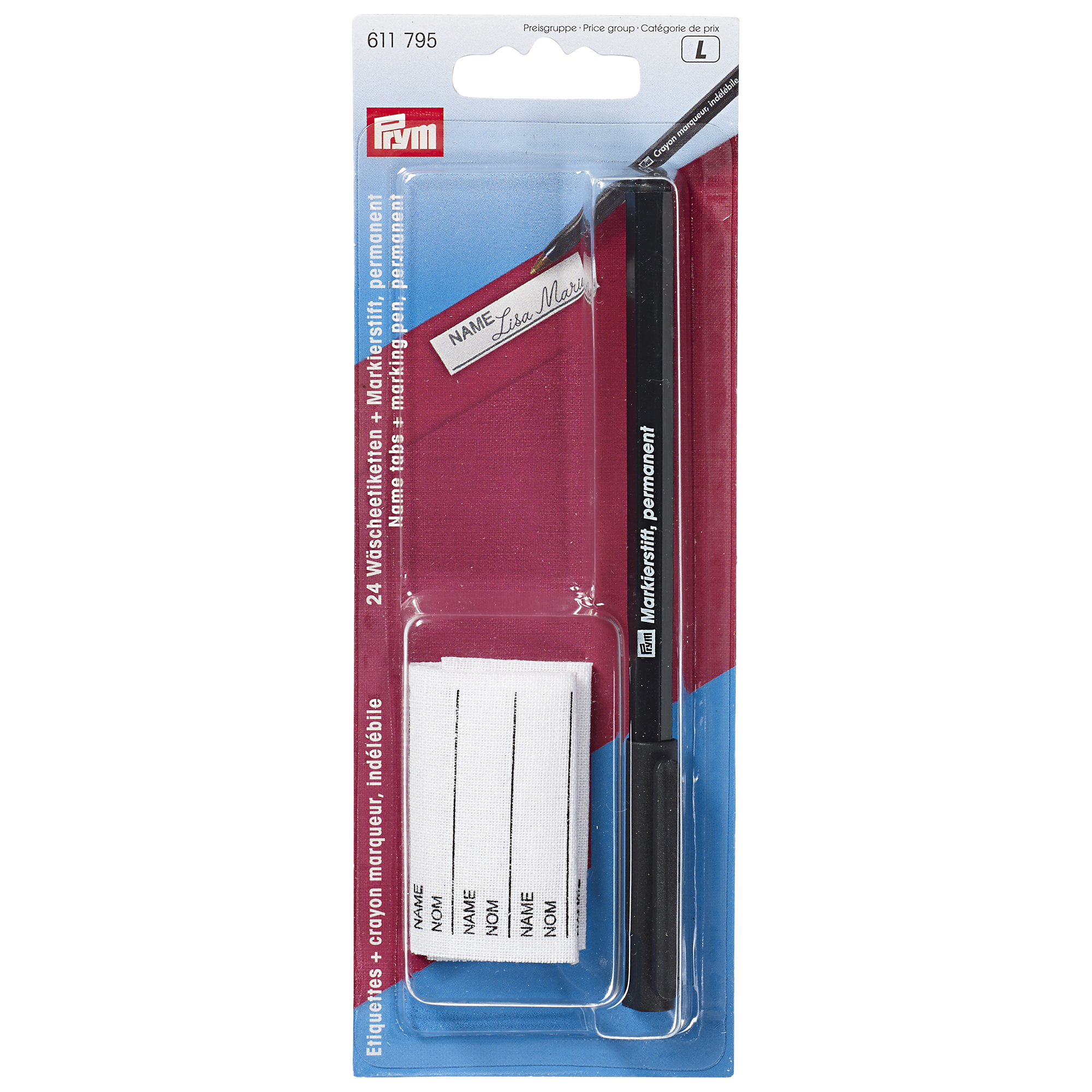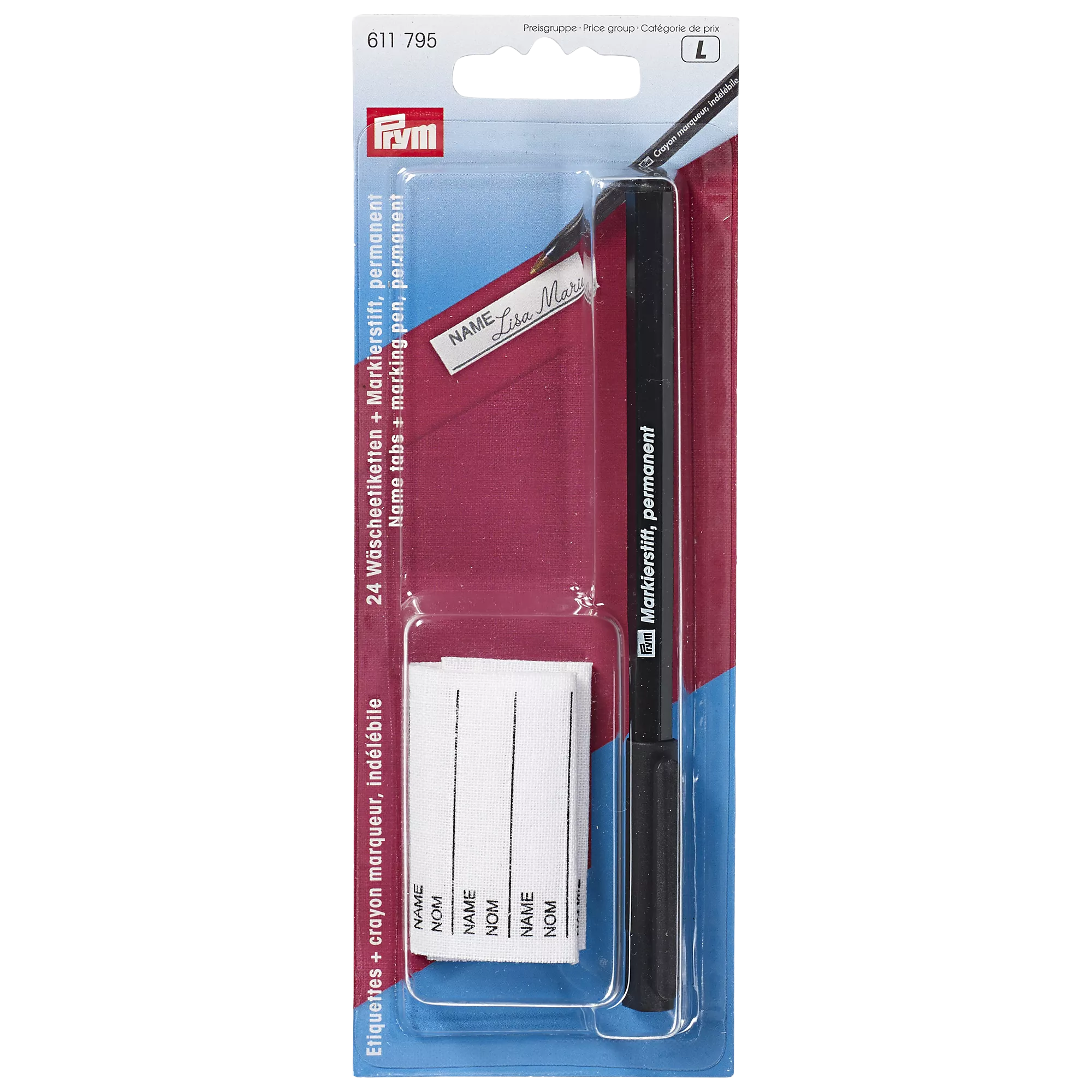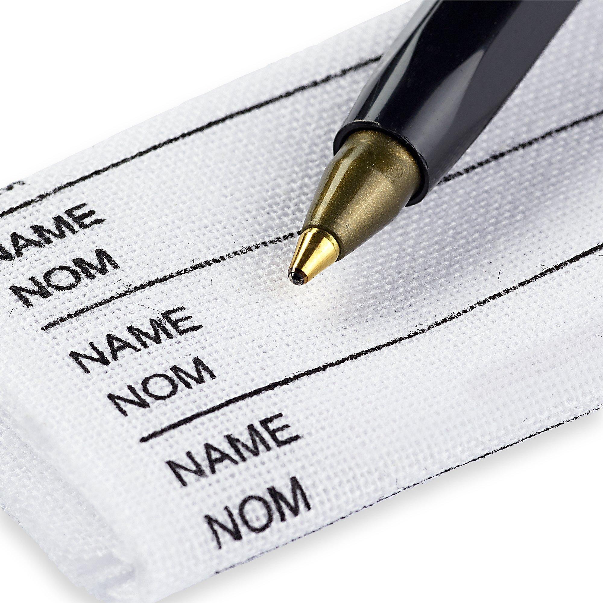 Permanent marker pen with a strip of 24 iron-on name tapes.