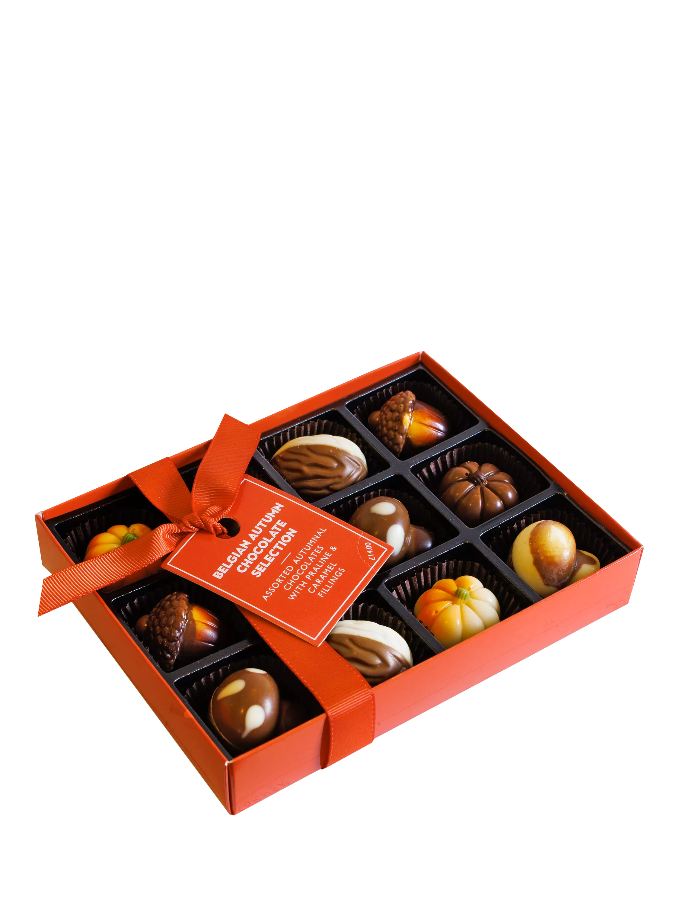 Beautifully decorated autumnal themed Belgian chocolates with assorted praline and caramel fillings. Presented in a clear lidded gift box with a ribbon and tag.