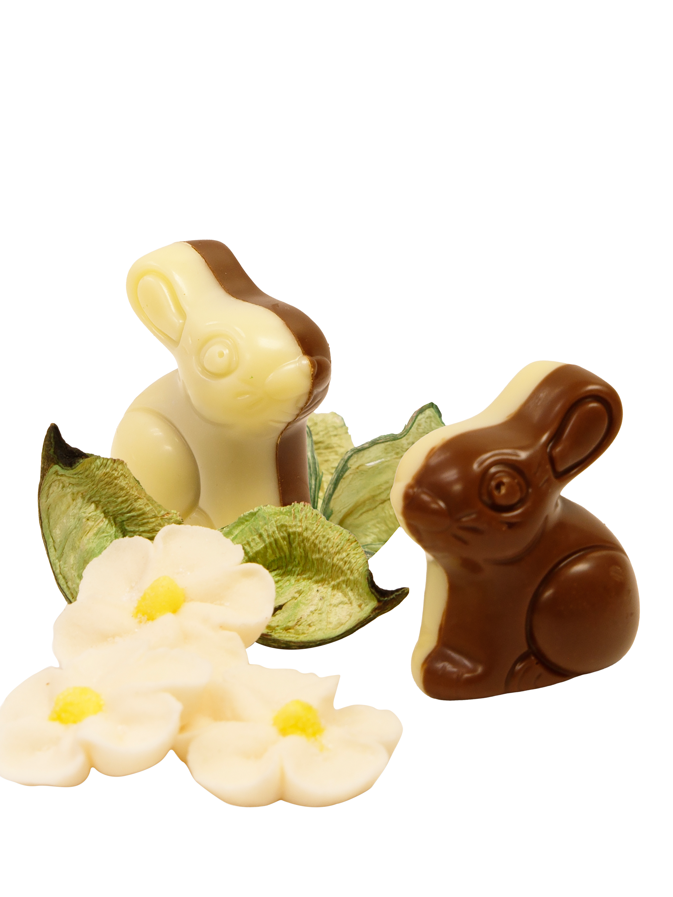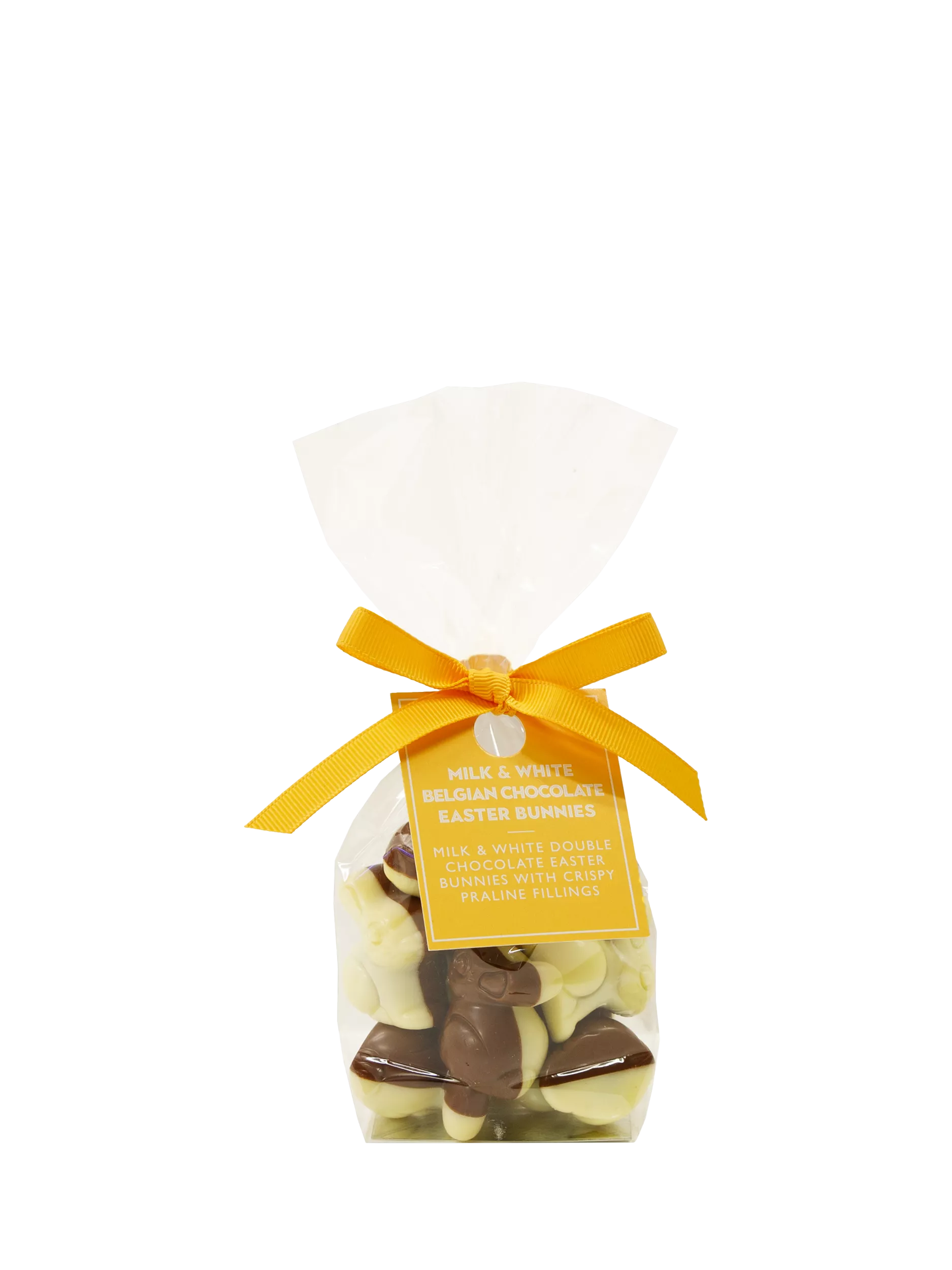 A selection of milk and white doublet Belgian chocolate bunnies with delicious fillings of praline and cookies. Presented in a clear cellophane wrap with a hand tied yellow ribbon and tag.