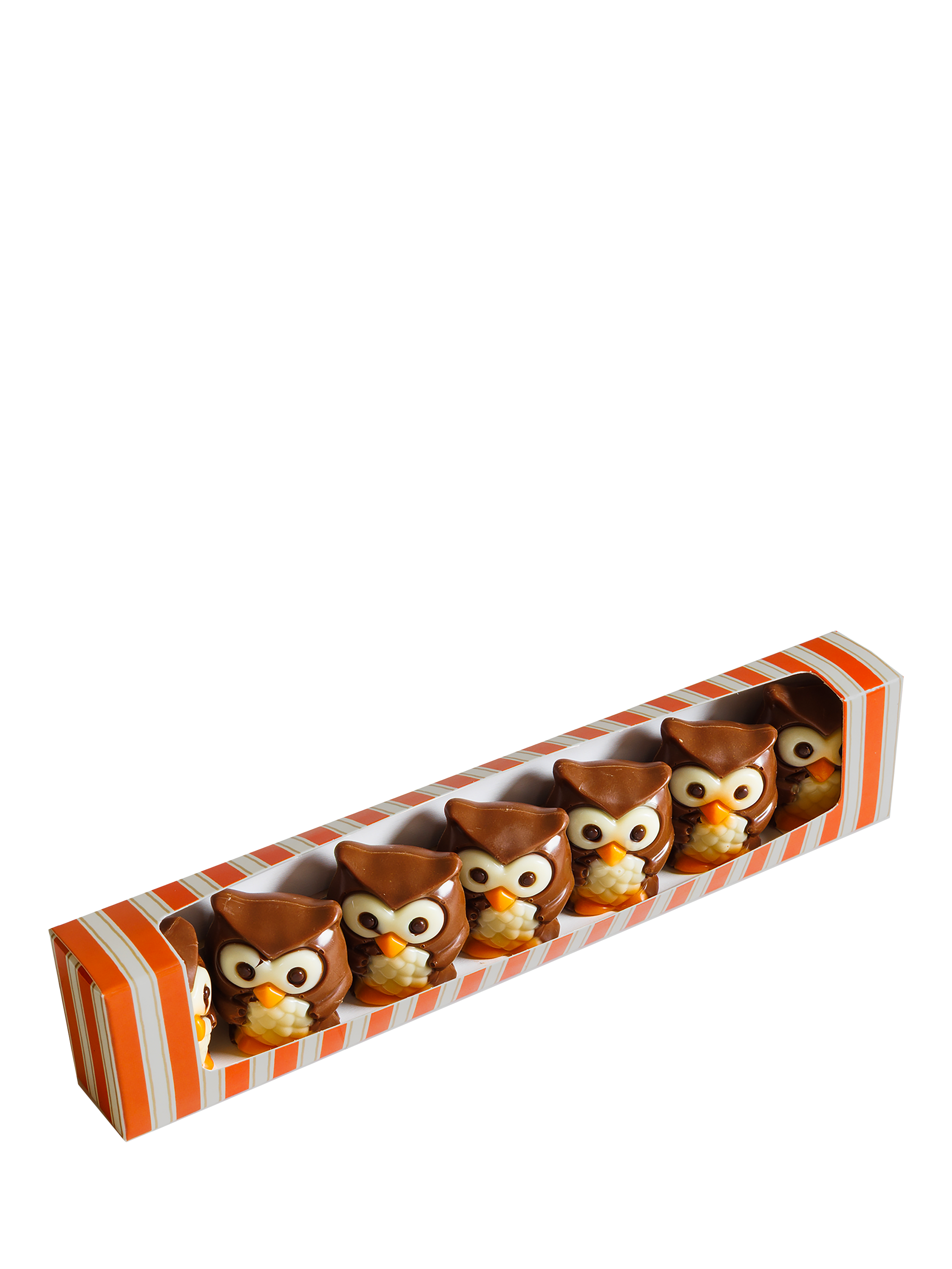 Delicious hazelnut praline filled, milk Belgian chocolate owls with white and orange chocolate decorations. Presented in a printed gift box with clear window.