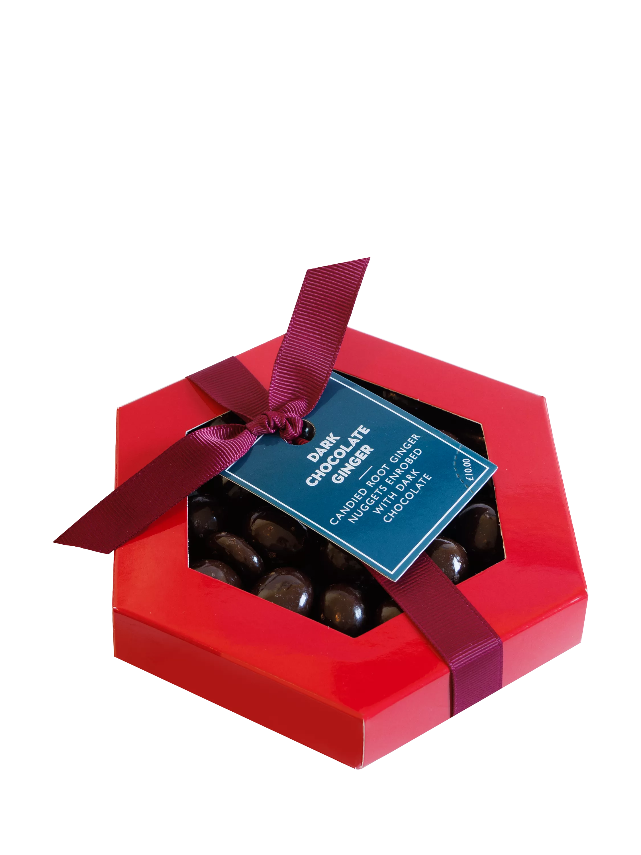 Bitesize nuggets of candied root ginger, each enrobed with delicious dark chocolate. Presented in a printed clear lidded gift box with a ribbon and tag.