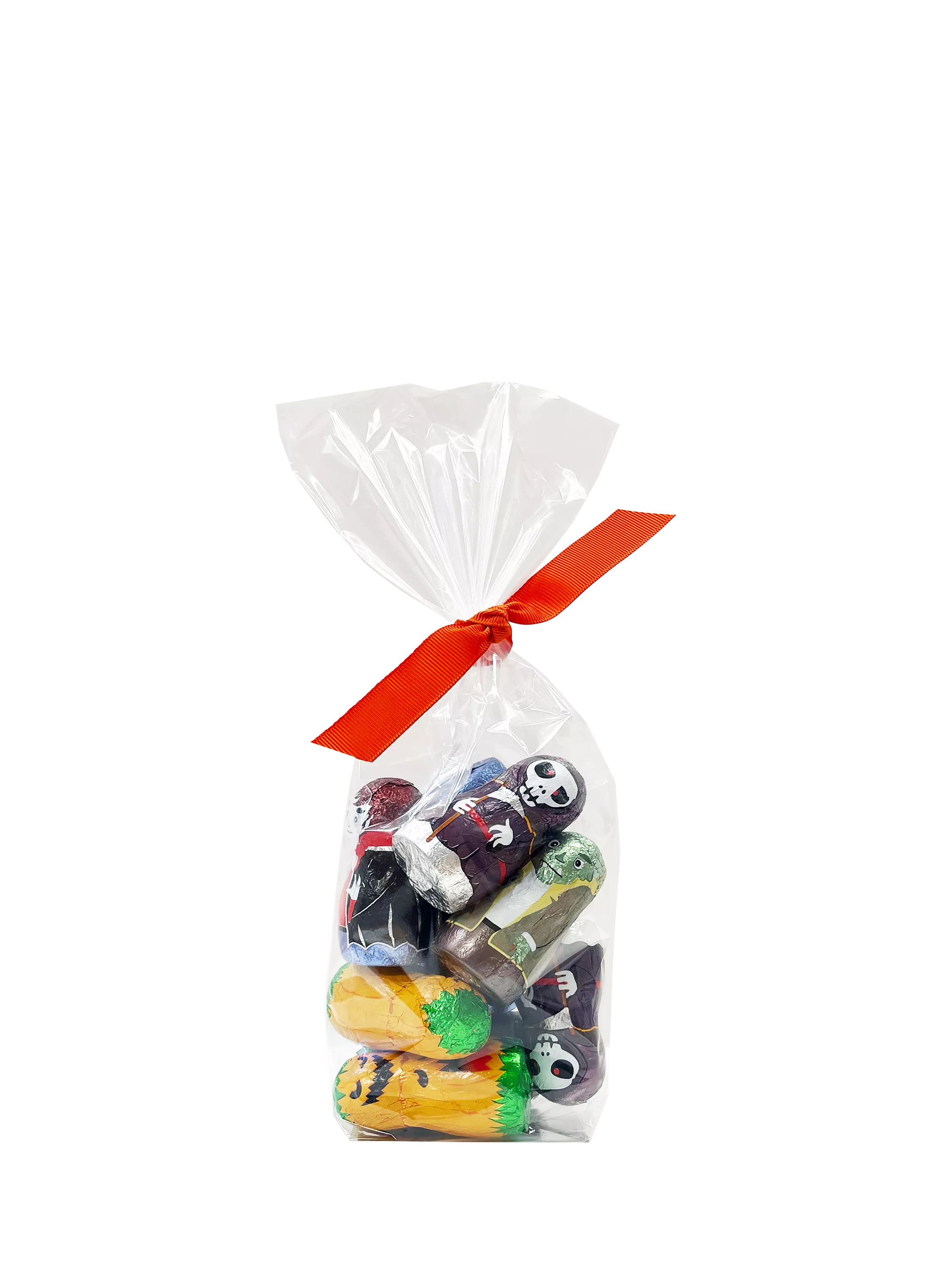 Continental milk chocolate hollow figurines wrapped in assorted Halloween themed foils. Presented in a clear cellophane bag with ribbon.