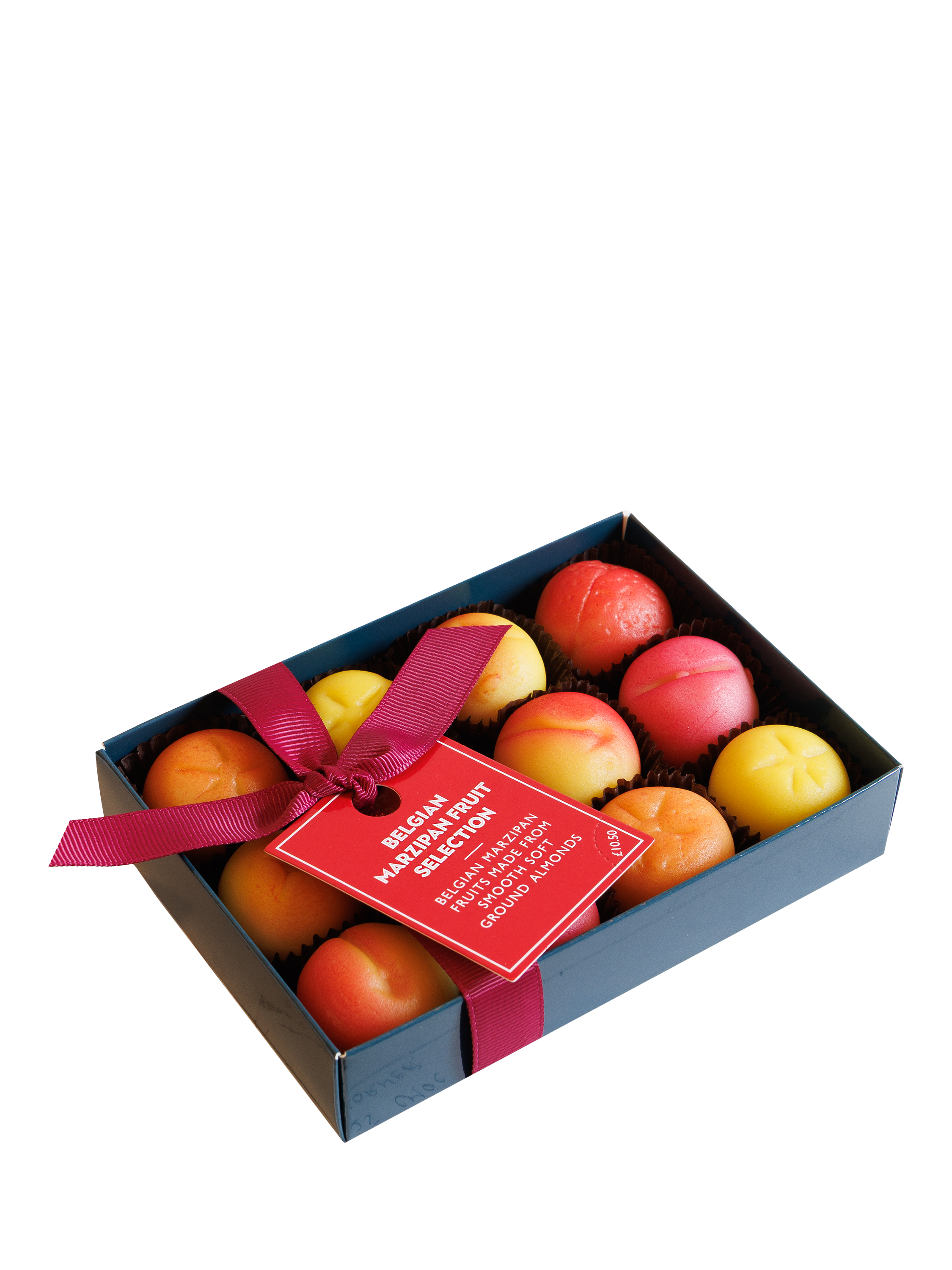 Belgian, assorted almond marzipan fruits. Presented in a clear lidded printed gift box with ribbon and tag.