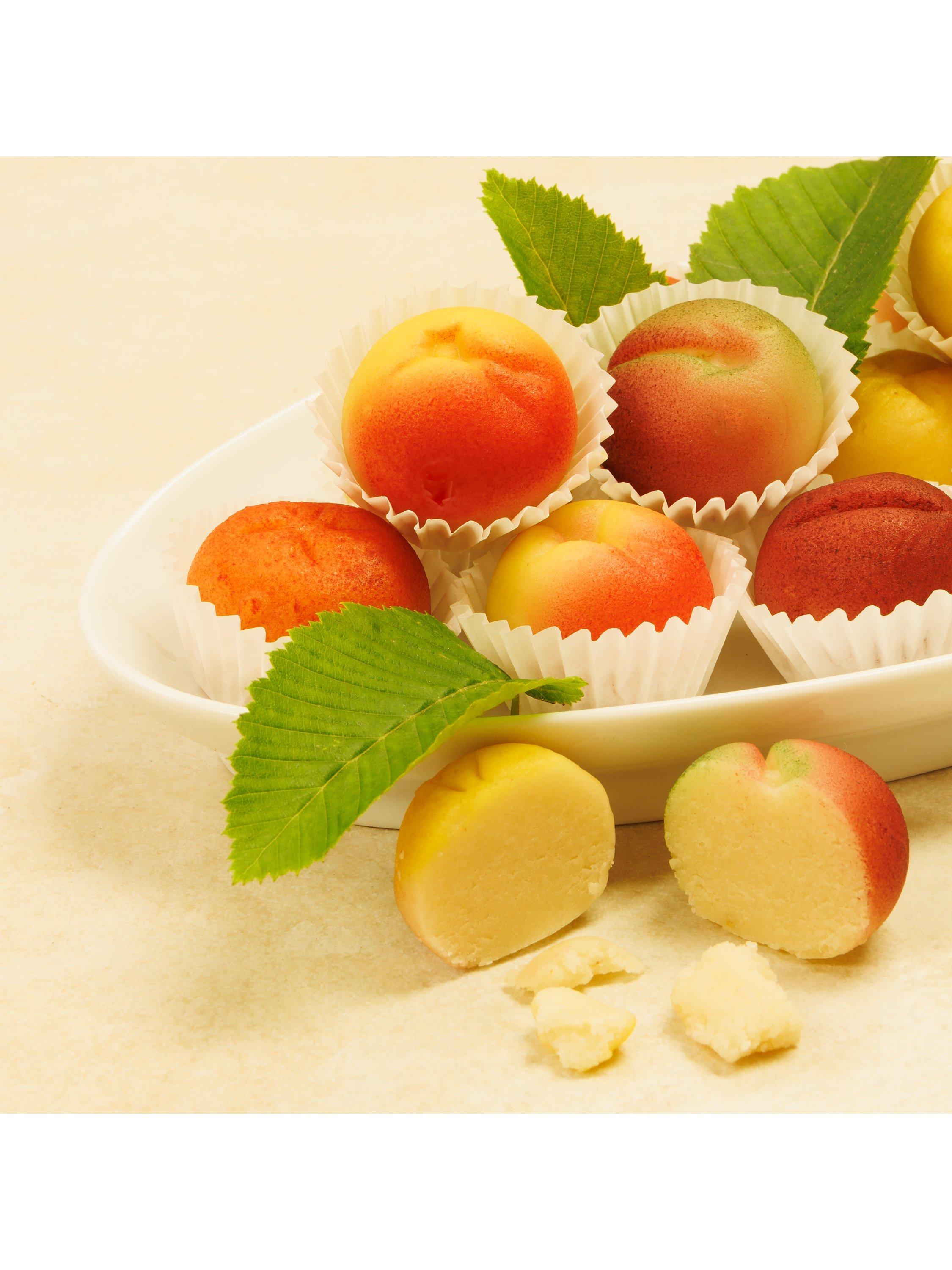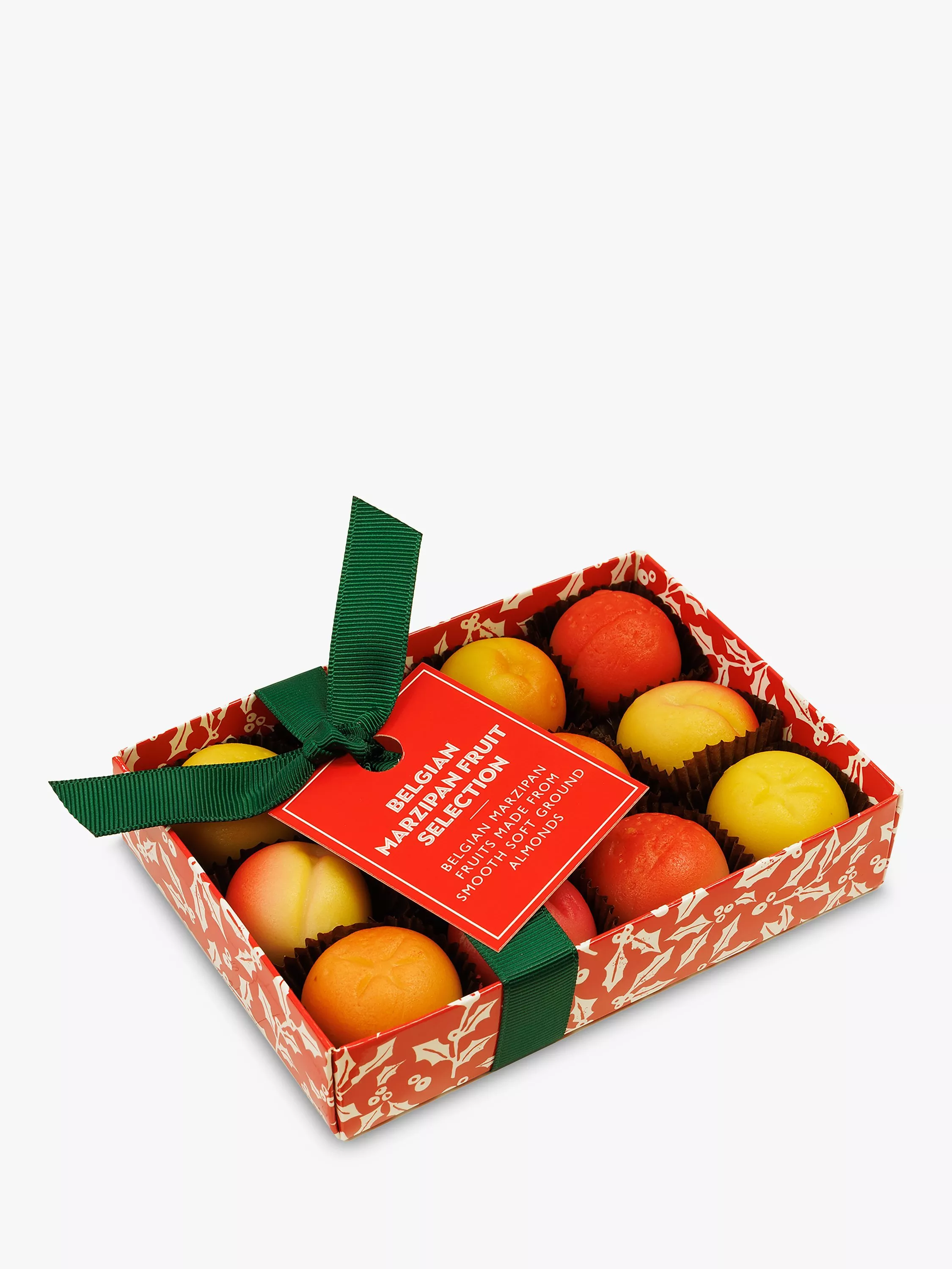 A selection of assorted Belgian marzipan fruits. Presented in a gift box with a tied ribbon.