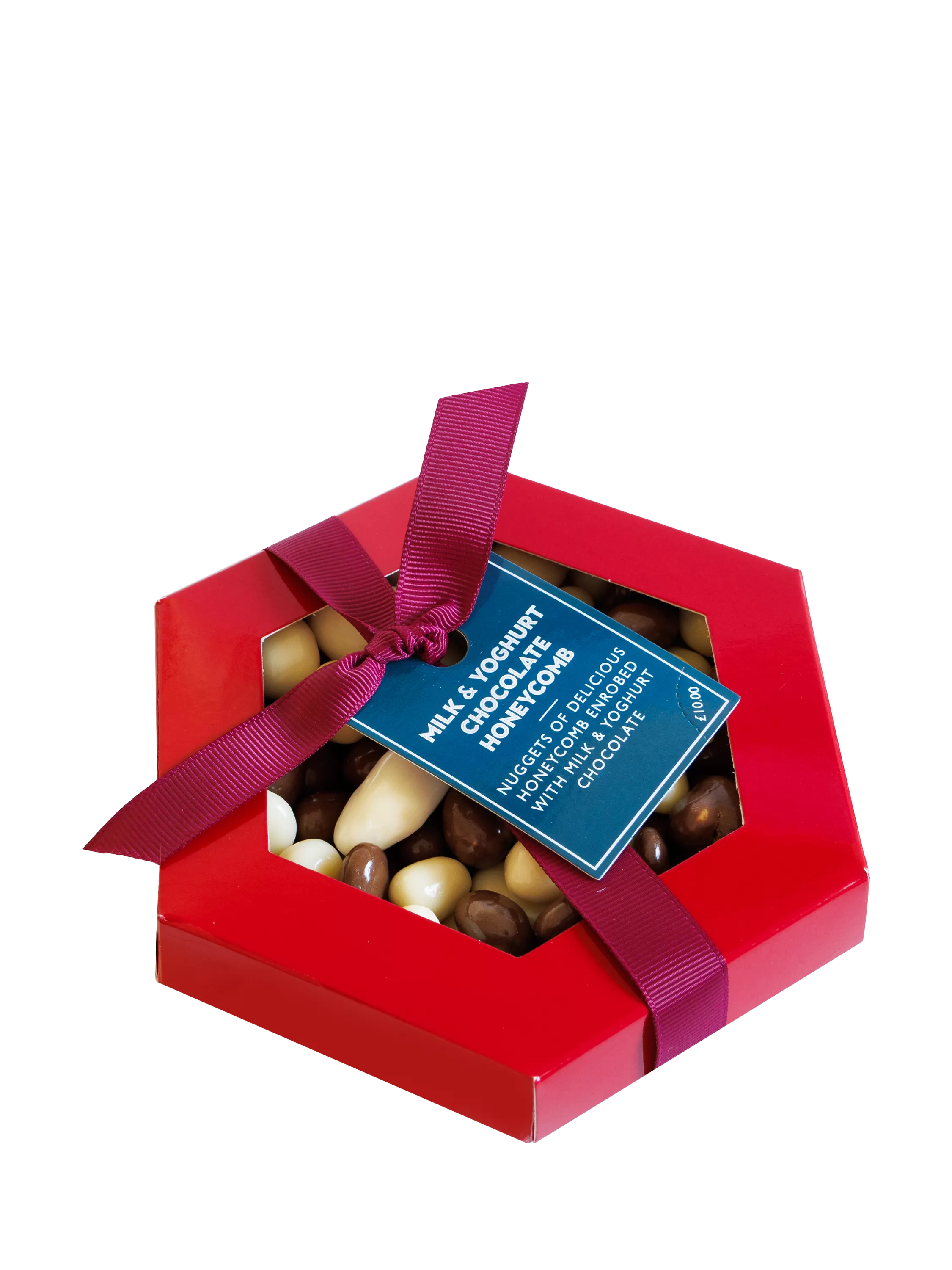 Bitesize nuggets of delicious honeycomb enrobed with an assortment of smooth milk chocolate and white yoghurt chocolate. Presented in a printed clear lidded gift box with a ribbon and tag.