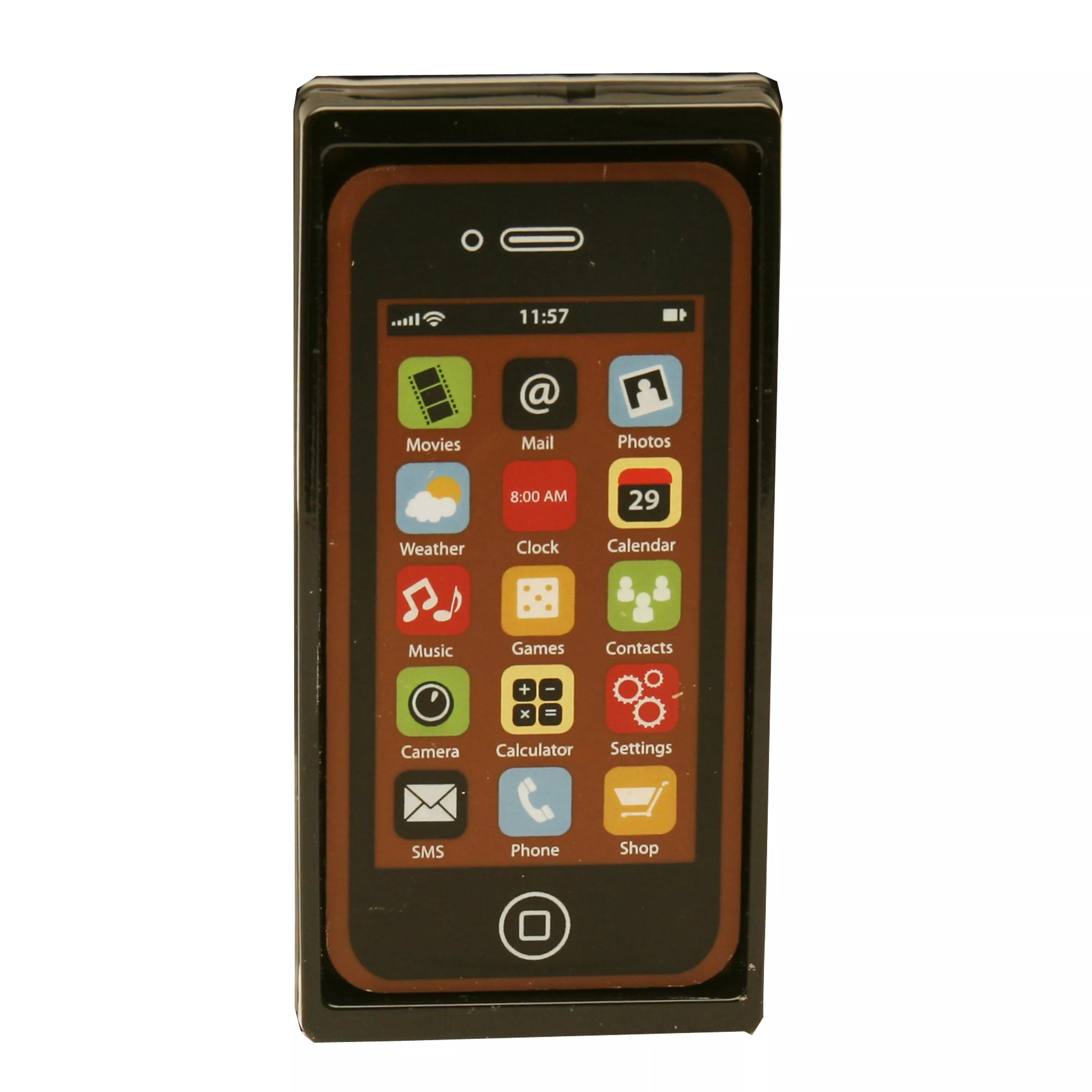 A phone good enough to eat! This contemporary chocolate smart phone is decorated with an app transfer.