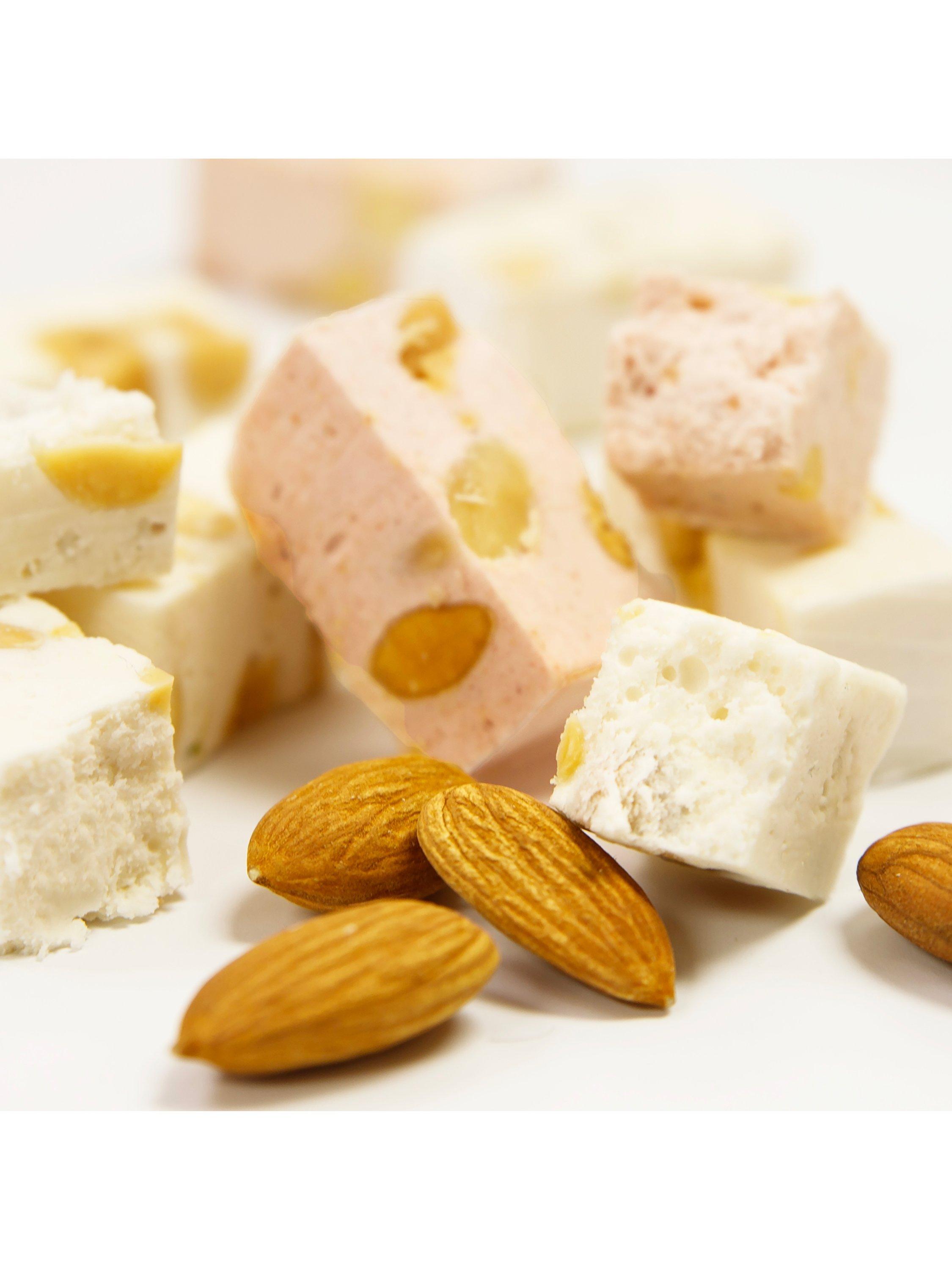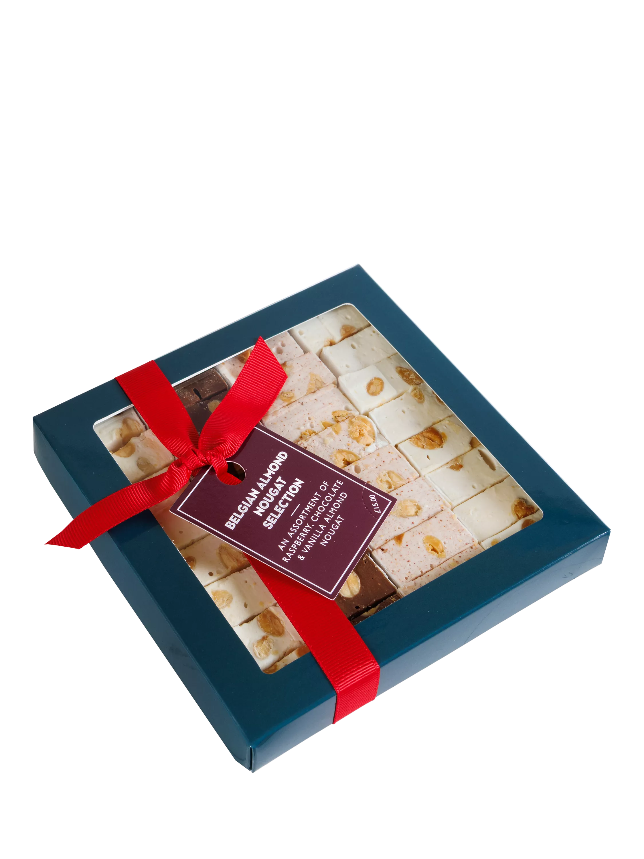 A selection of traditional almond, strawberry and chocolate Belgian nougat cubes. Presented in a clear lidded gift box with a ribbon and tag.