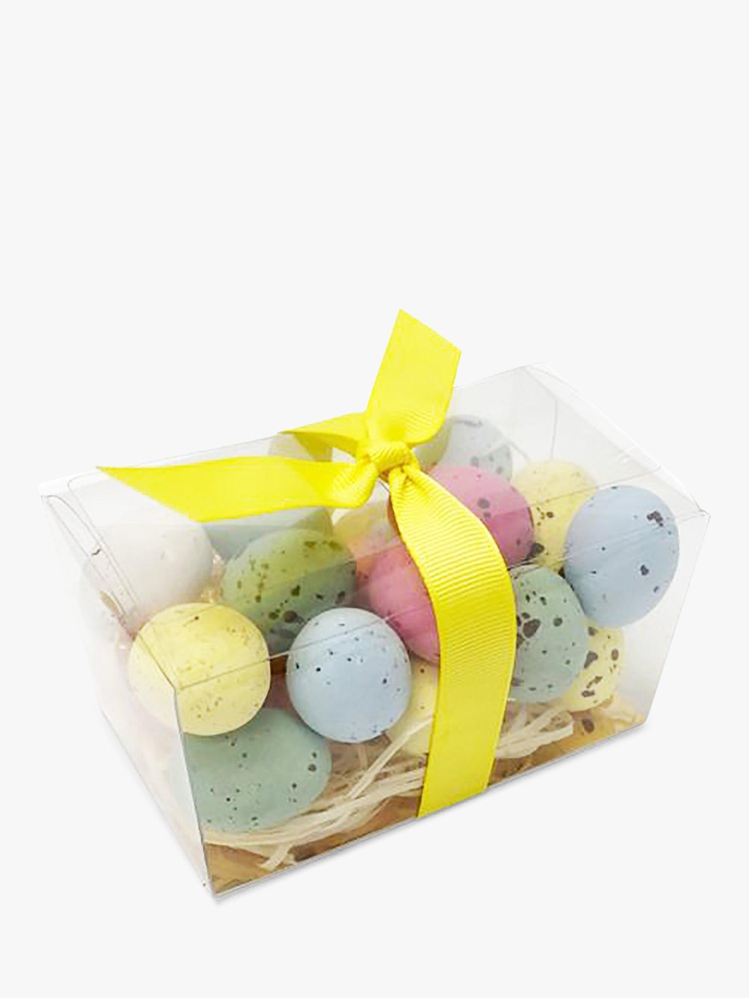 Delicious, praline-filled speckled gull eggs nestling in a bed of natural shredded wood straw. A perfectly-presented Easter gift.