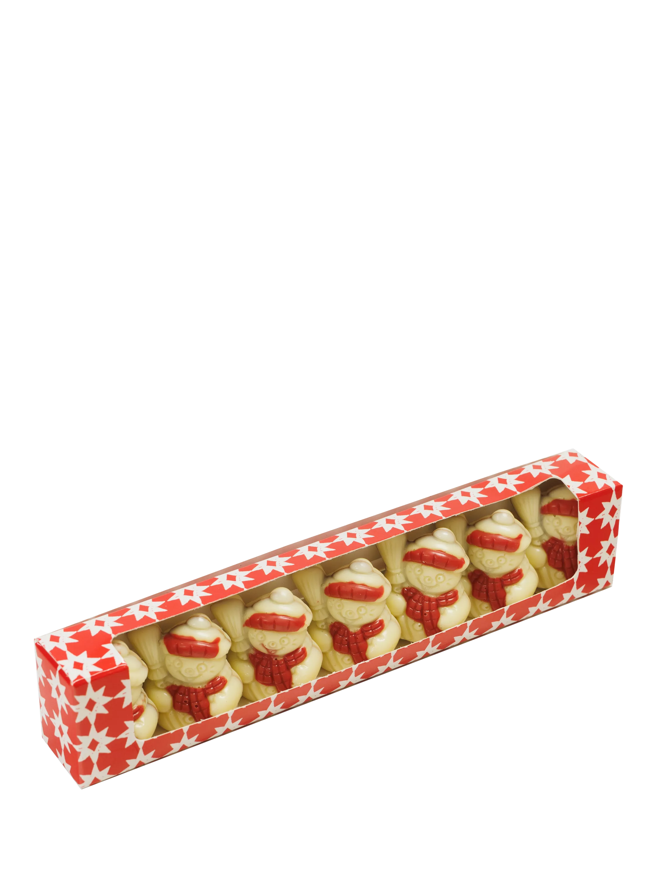 A row of Belgian white chocolate snowmen, with chocolate praline in the middle. Presented in a decorated gift box.
